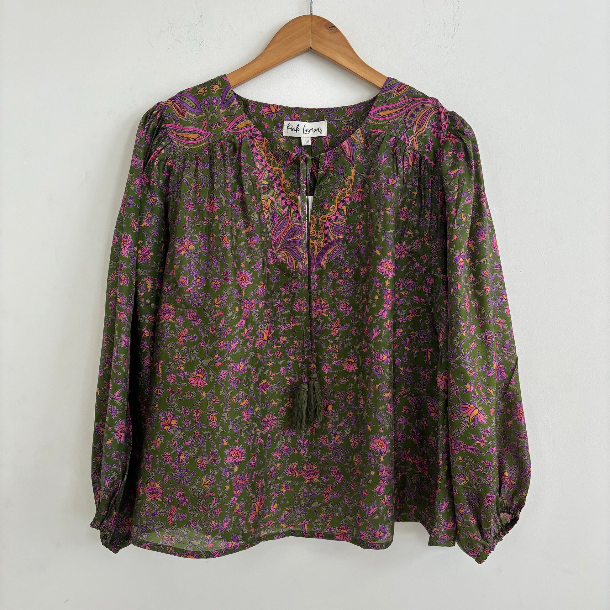 Lolita blouse has a loose breezy, feminine shape with puff shoulder detail and a front yoke with tassel ties. Lolita exudes charm and elegance with pretty details on the shoulders and front yoke ,she looks great with jeans , linen pants and skirts /shorts alike , she can be dressed up or down to suit the occasion. It has a swing shape that can be worn loose or tucked in . Super versatile .