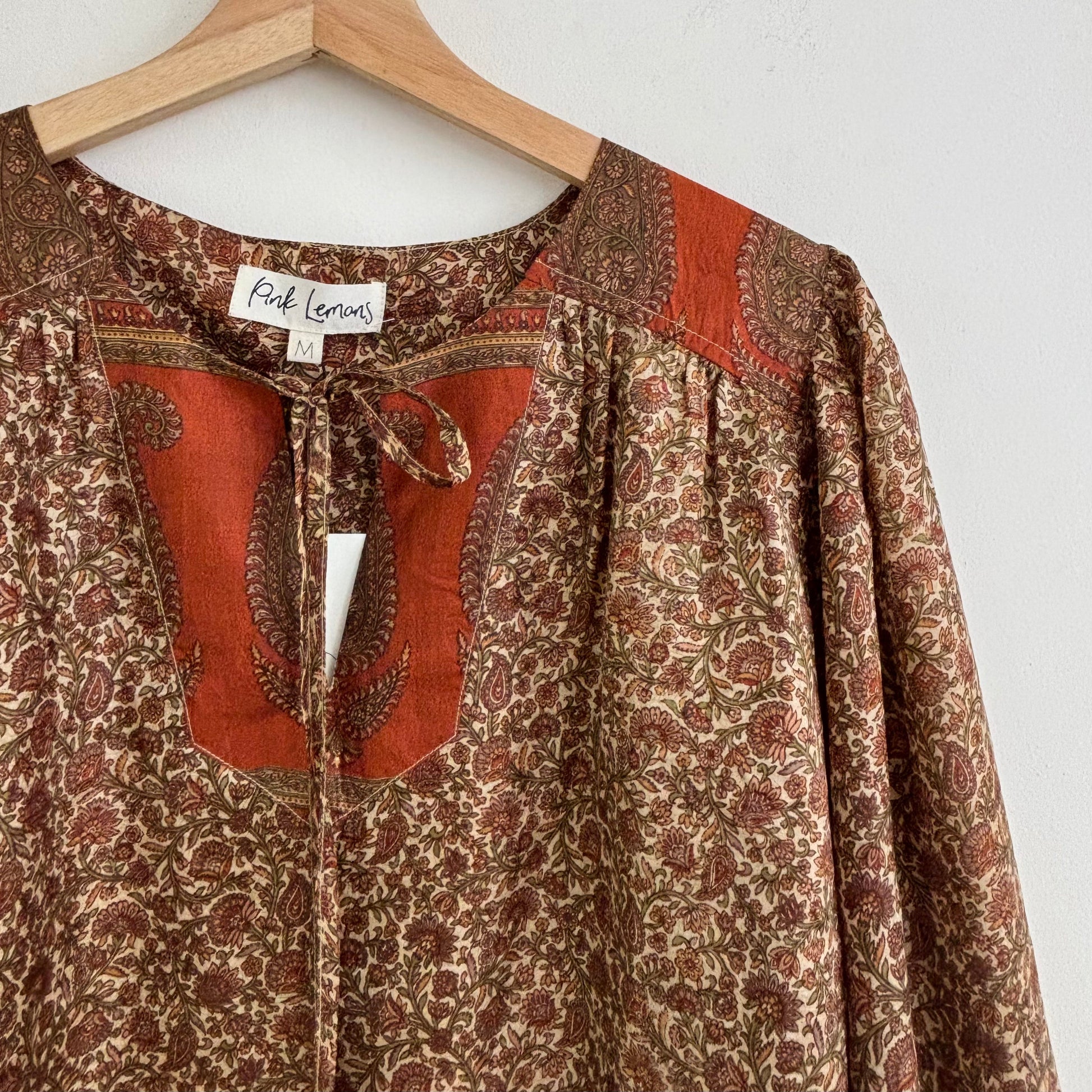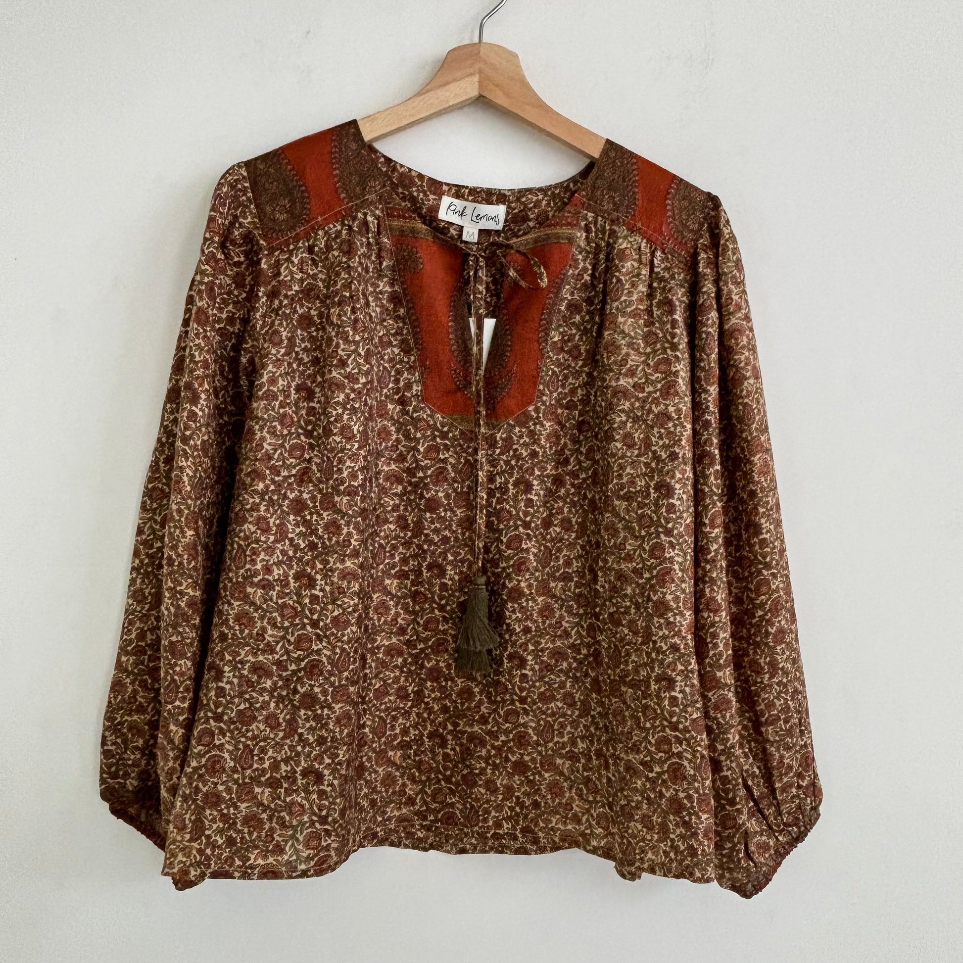 Lolita blouse has a loose breezy, feminine shape with puff shoulder detail and a front yoke with tassel ties. Lolita exudes charm and elegance with pretty details on the shoulders and front yoke ,she looks great with jeans , linen pants and skirts /shorts alike , she can be dressed up or down to suit the occasion. It has a swing shape that can be worn loose or tucked in . Super versatile .