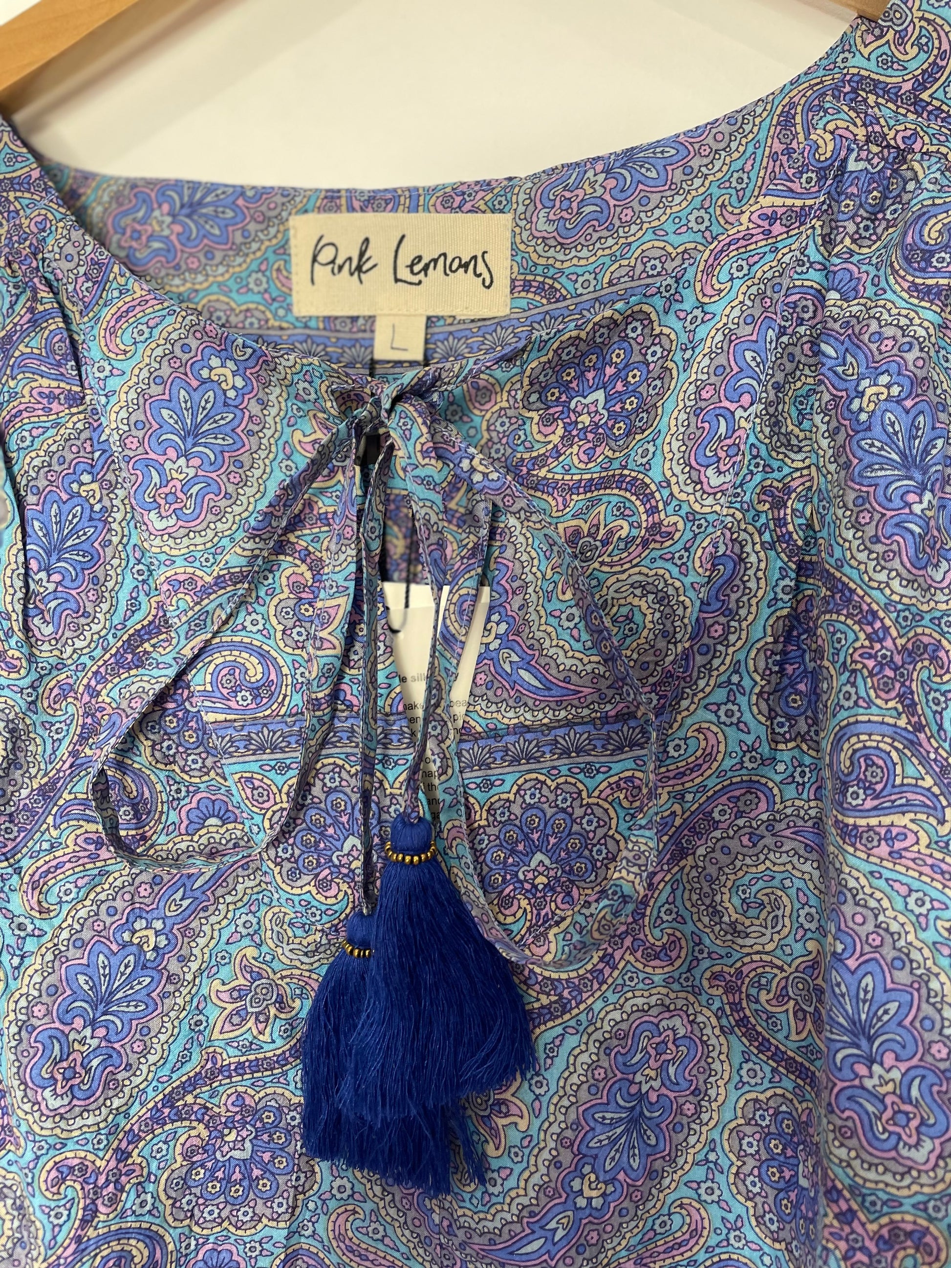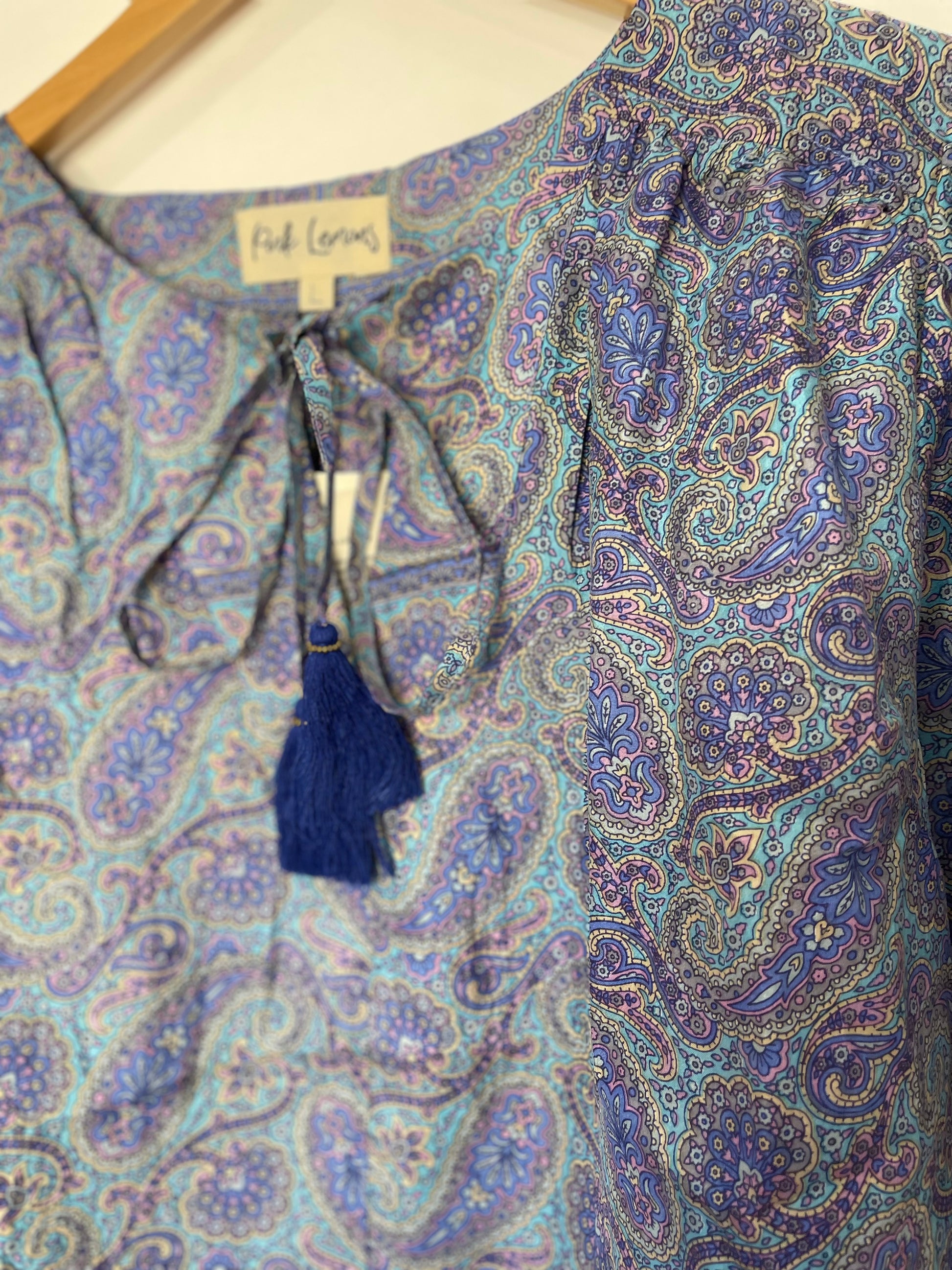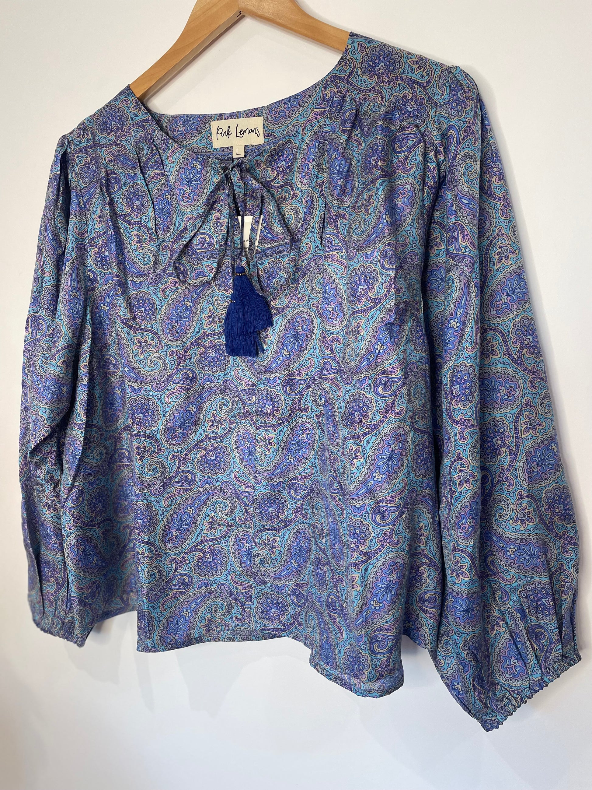 Lolita blouse has a loose breezy, feminine shape with puff shoulder detail and a front yoke with tassel ties. Lolita exudes charm and elegance with pretty details on the shoulders and front yoke ,she looks great with jeans , linen pants and skirts /shorts alike , she can be dressed up or down to suit the occasion. It has a swing shape that can be worn loose or tucked in . Super versatile .