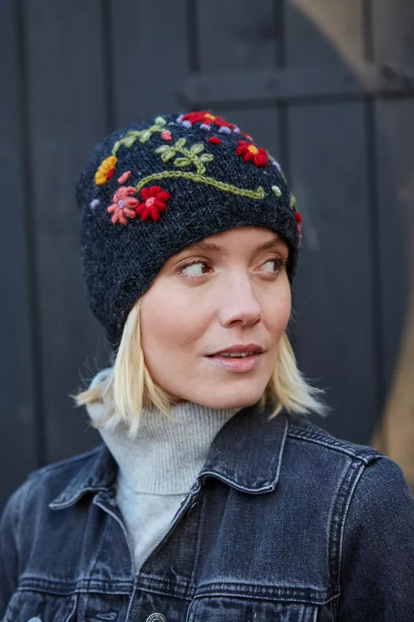 This Lugano hand knitted wool beanie features beautifully hand embroidered flowers in striking colours. A pretty addition to any wardrobe. These hats are fleece lined for warmth and comfort.