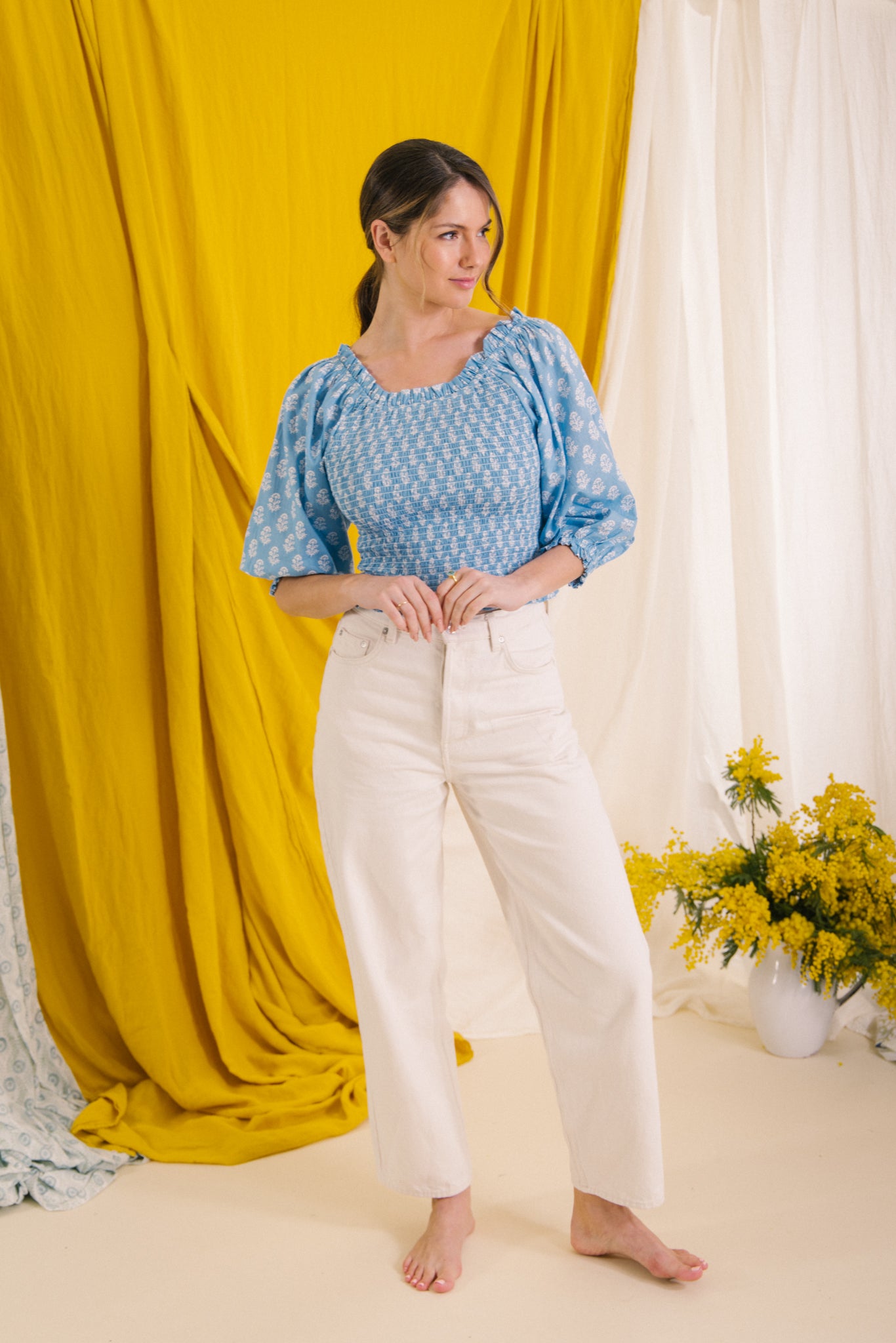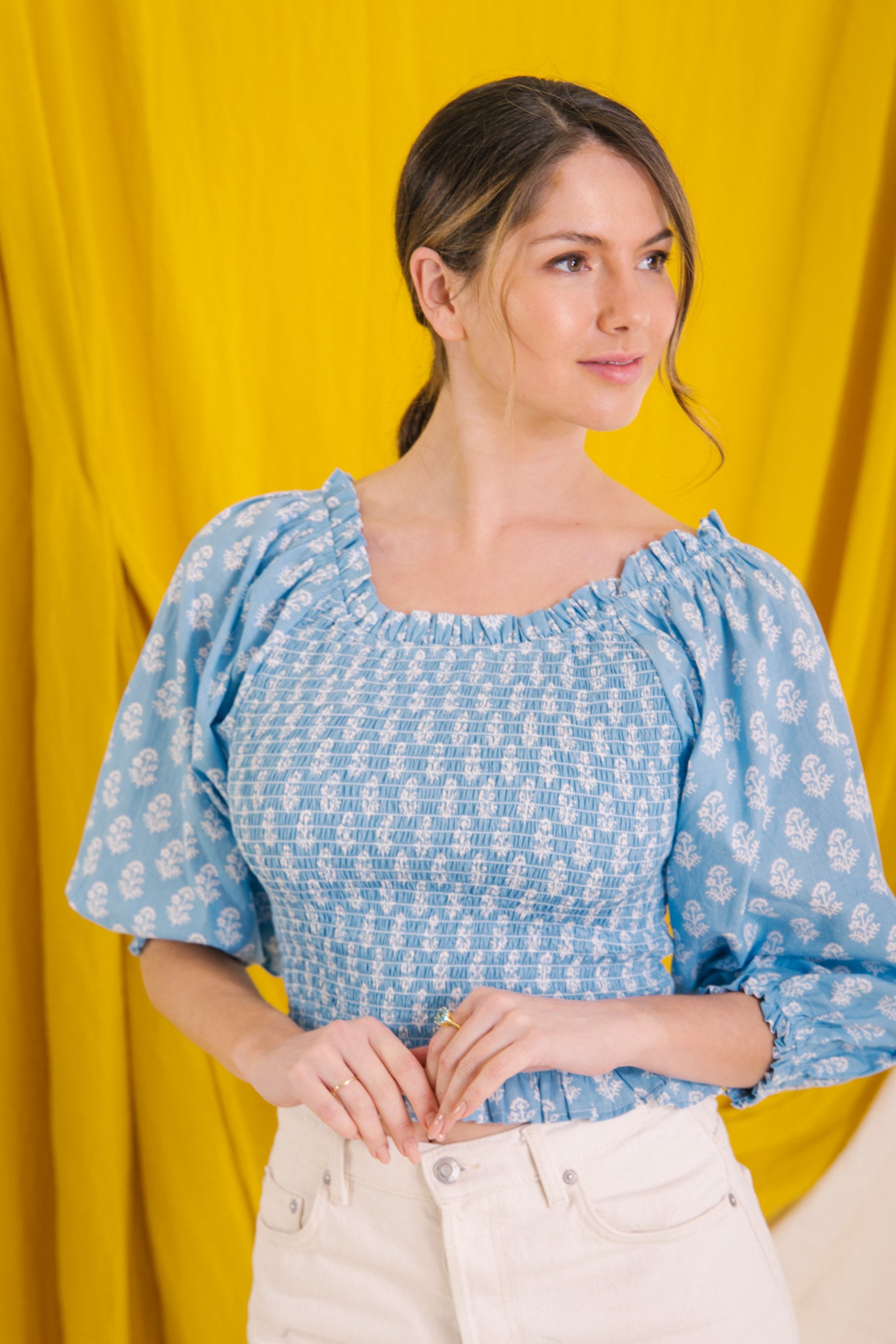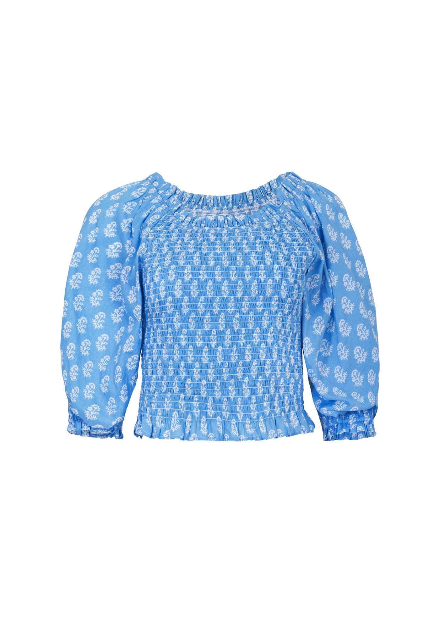 Style her on or off the shoulder, she has a smocked bodice with elasticated neckline with a gentle frill detail, soft balloon style 3/4 length sleeves .