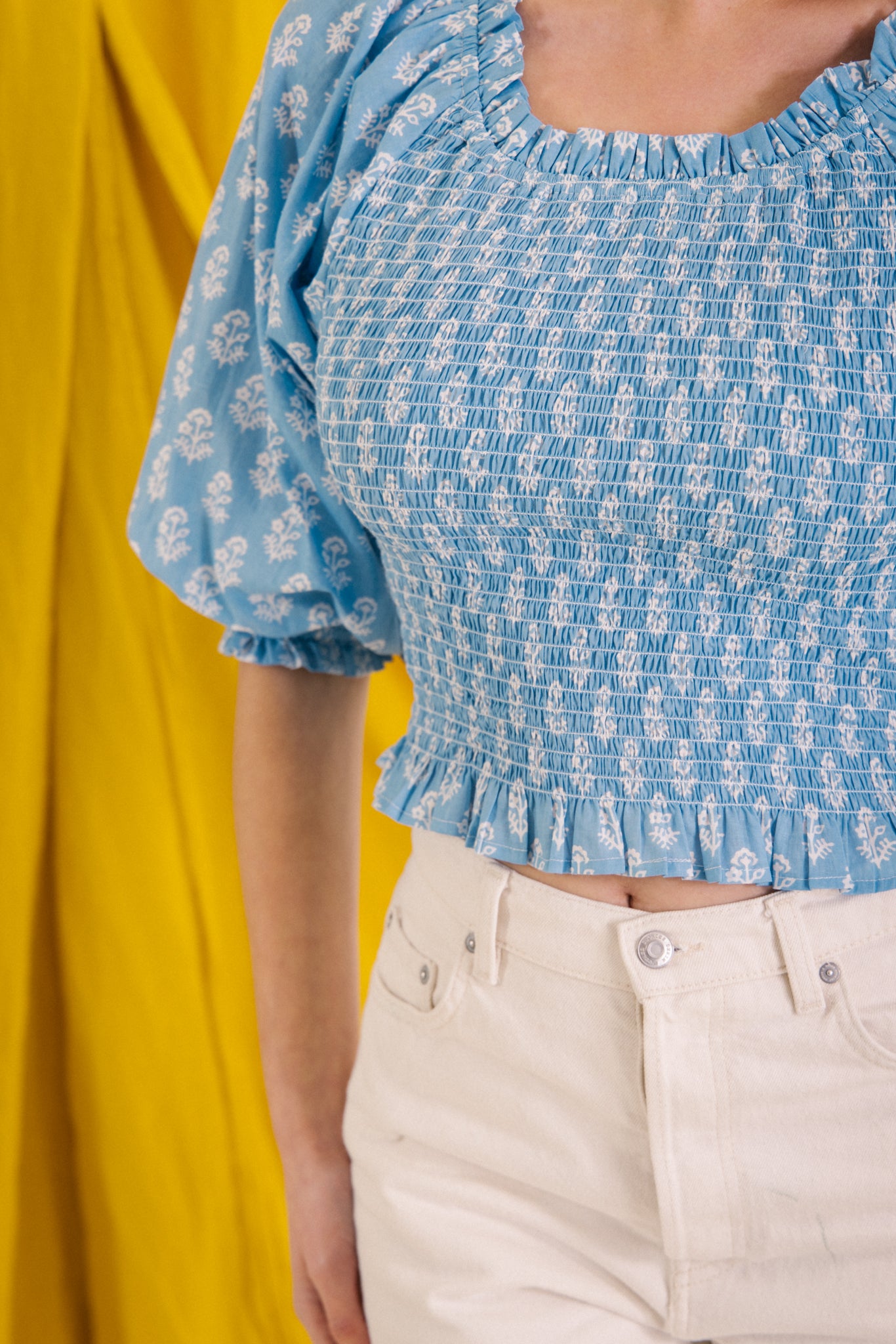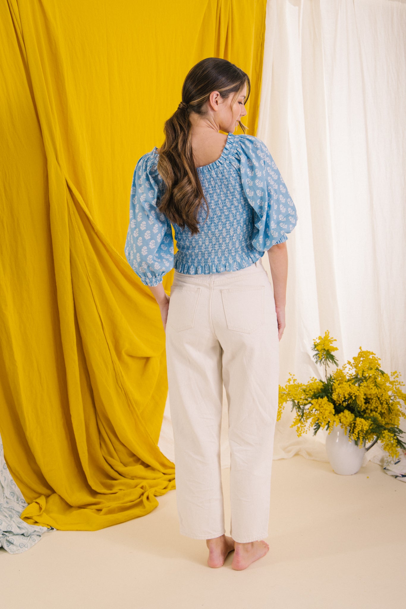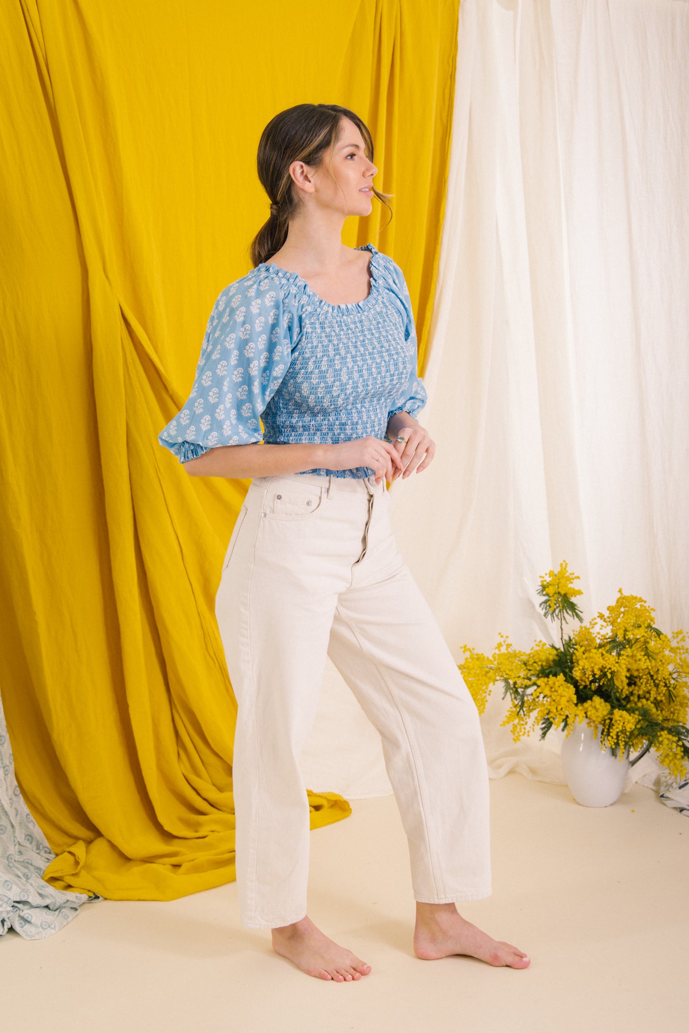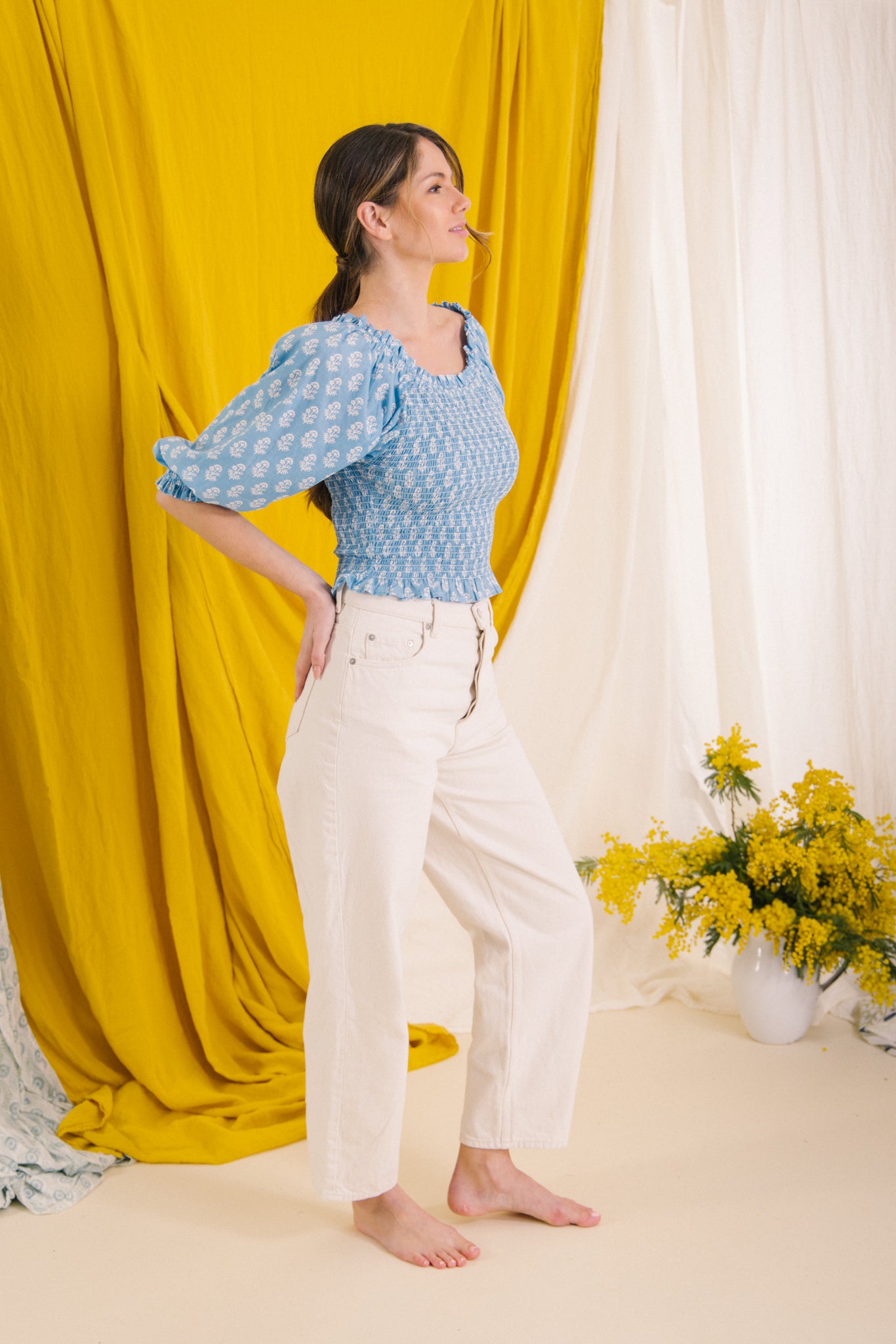 Style her on or off the shoulder, she has a smocked bodice with elasticated neckline with a gentle frill detail, soft balloon style 3/4 length sleeves .