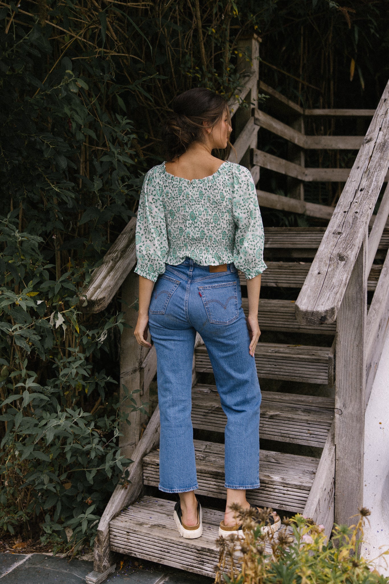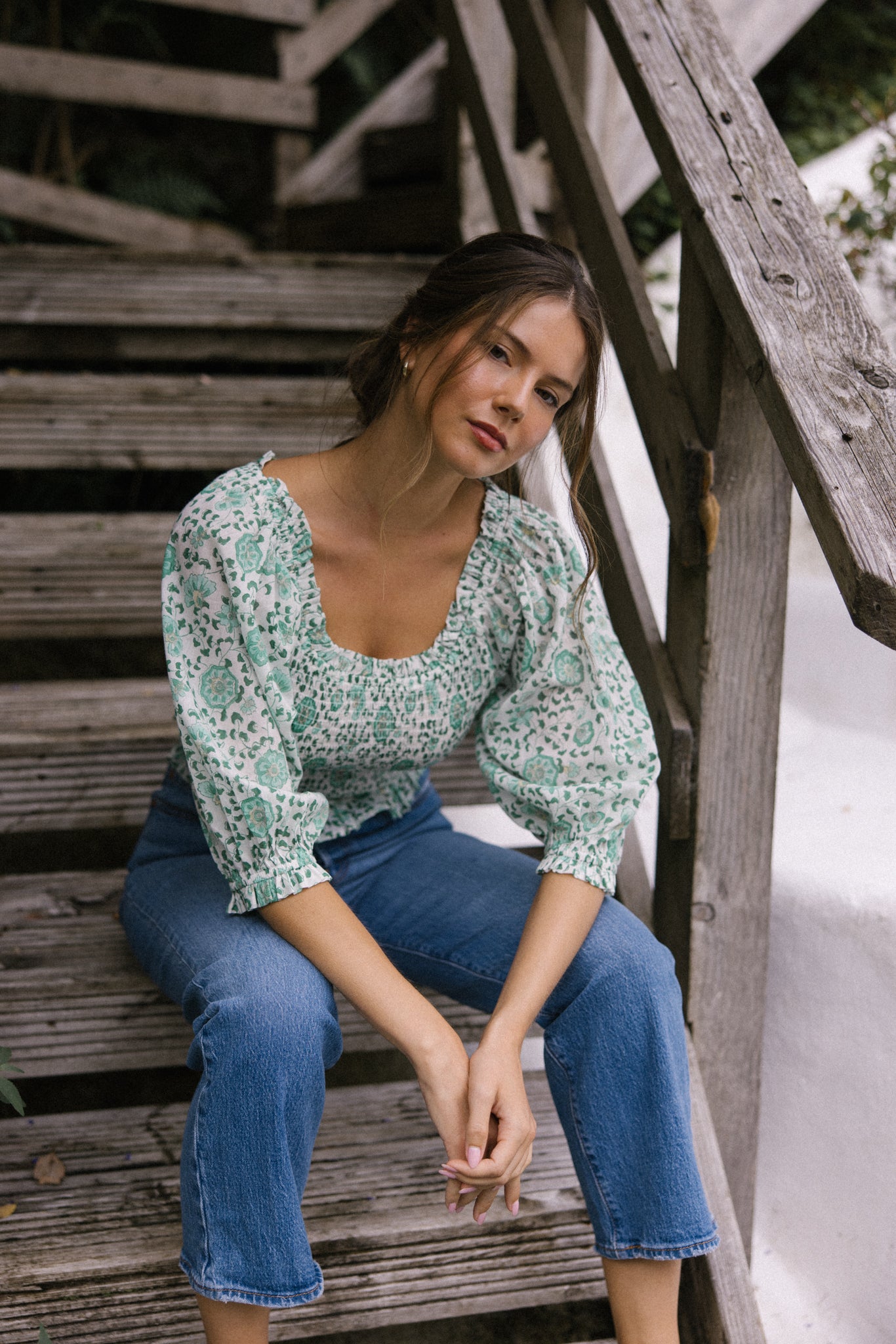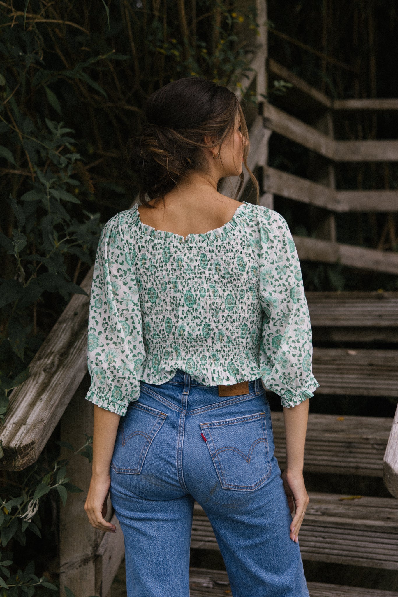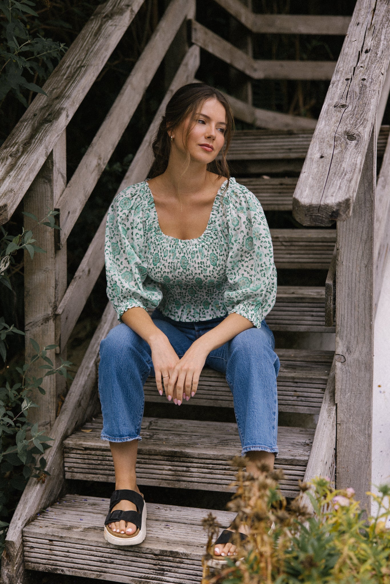 Mona smock top has a romantic vintage feel. Style her on or off the shoulder, she has a smocked bodice with elasticated neckline with a gentle frill detail, soft balloon style 3/4 length sleeves.