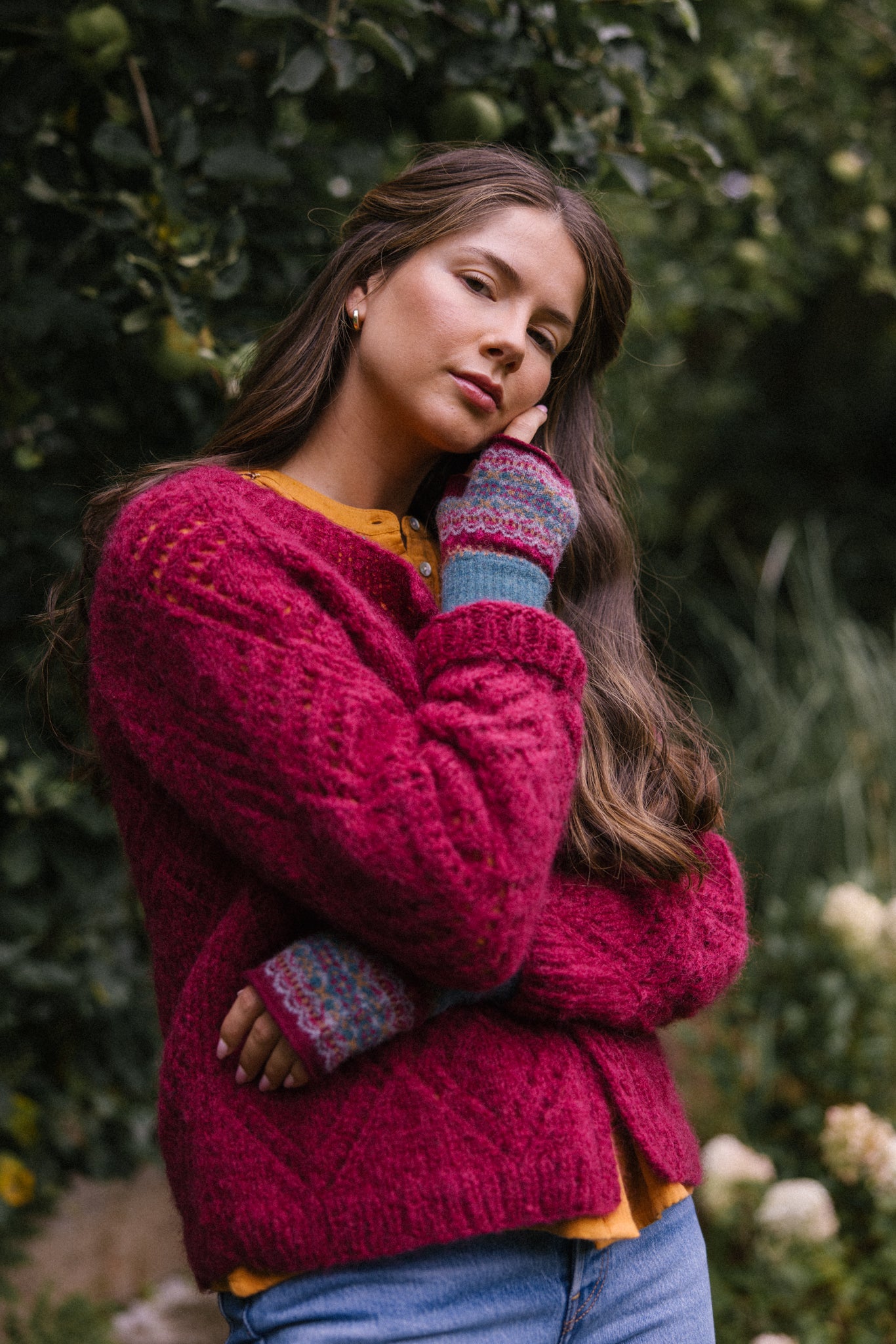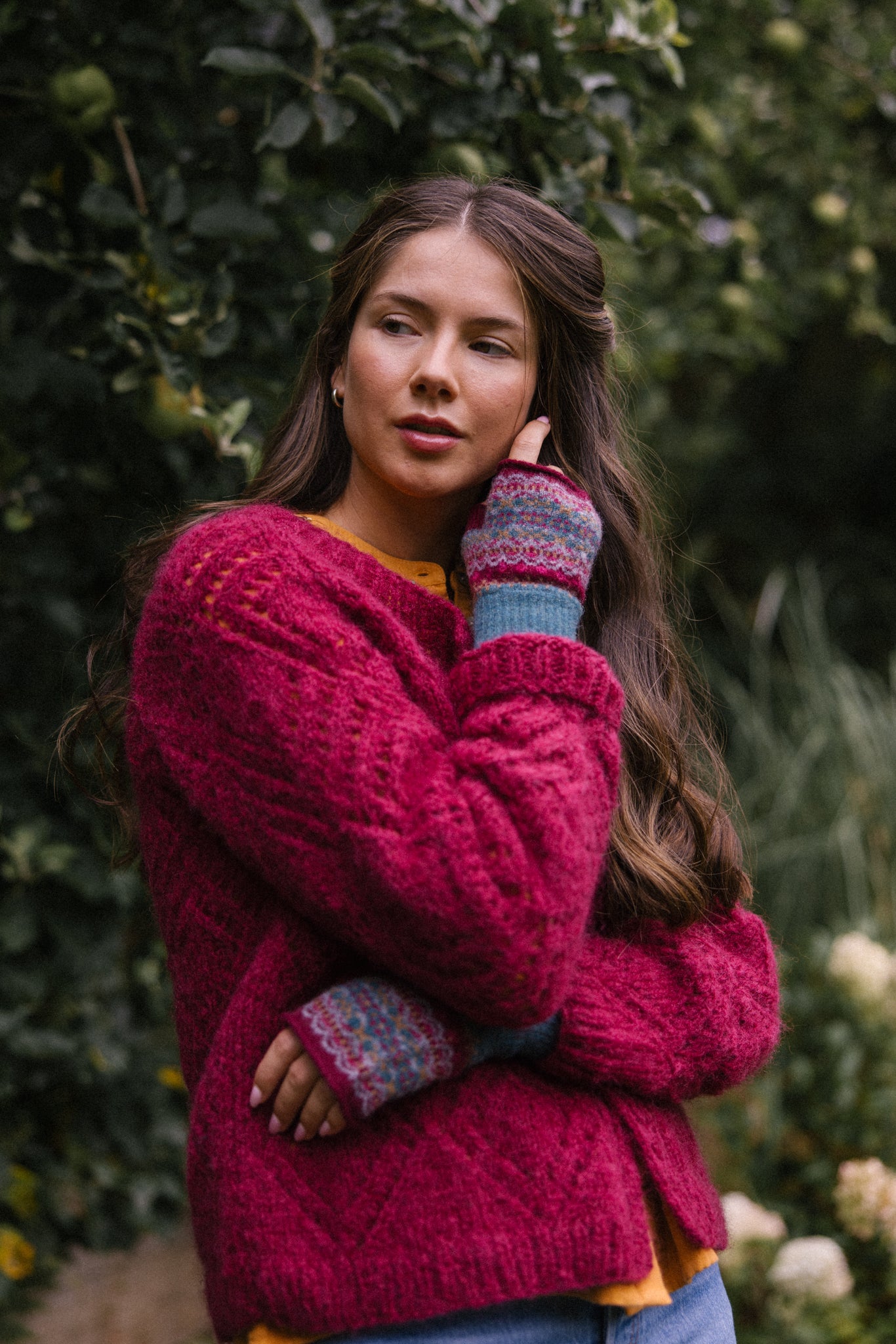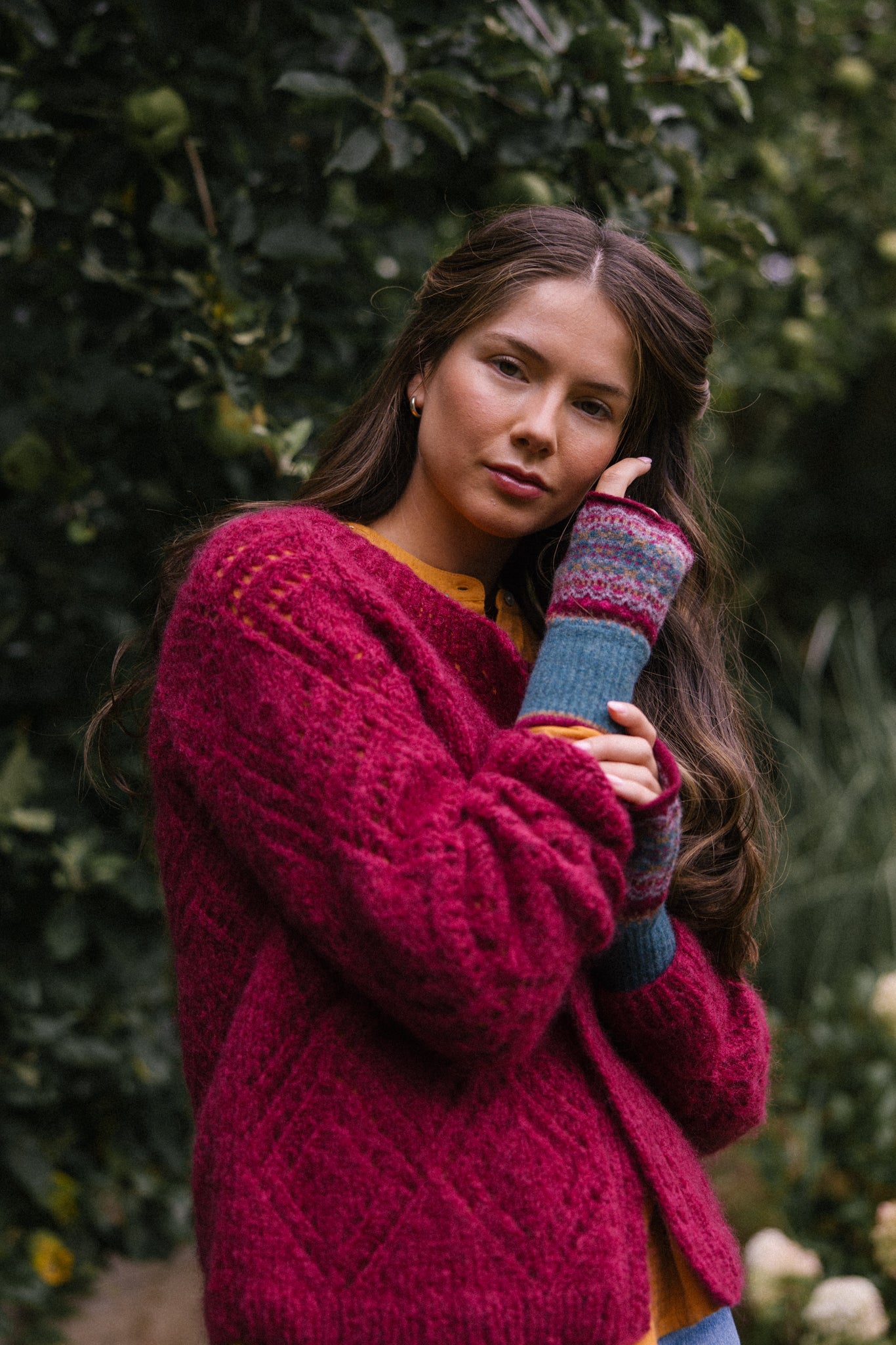 A beautiful, warm layering piece. The yarn is hand-spun, hand-dyed and made from non-mulesed wool.