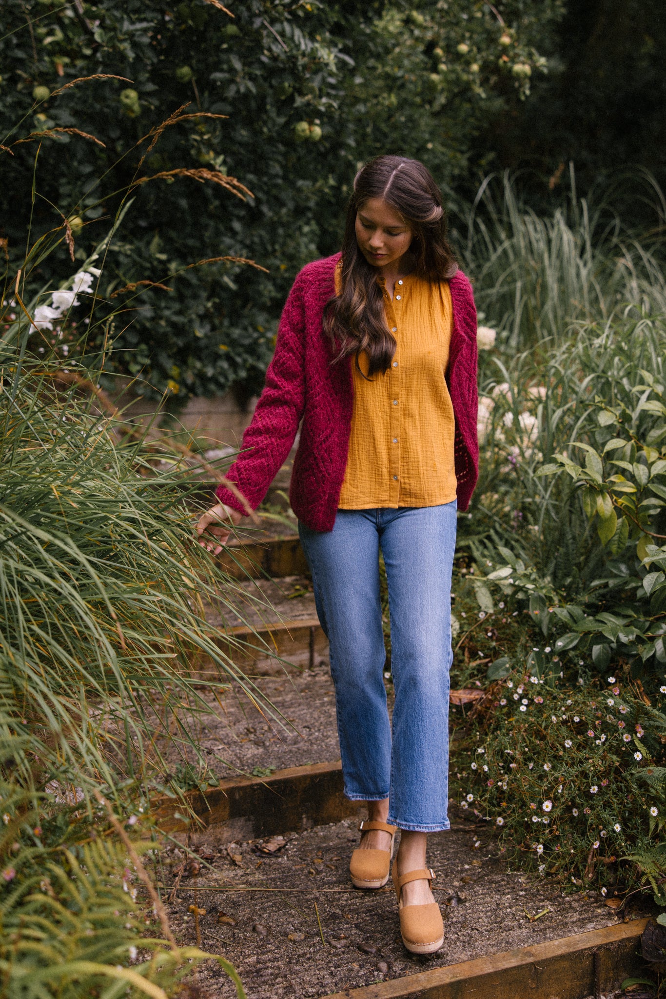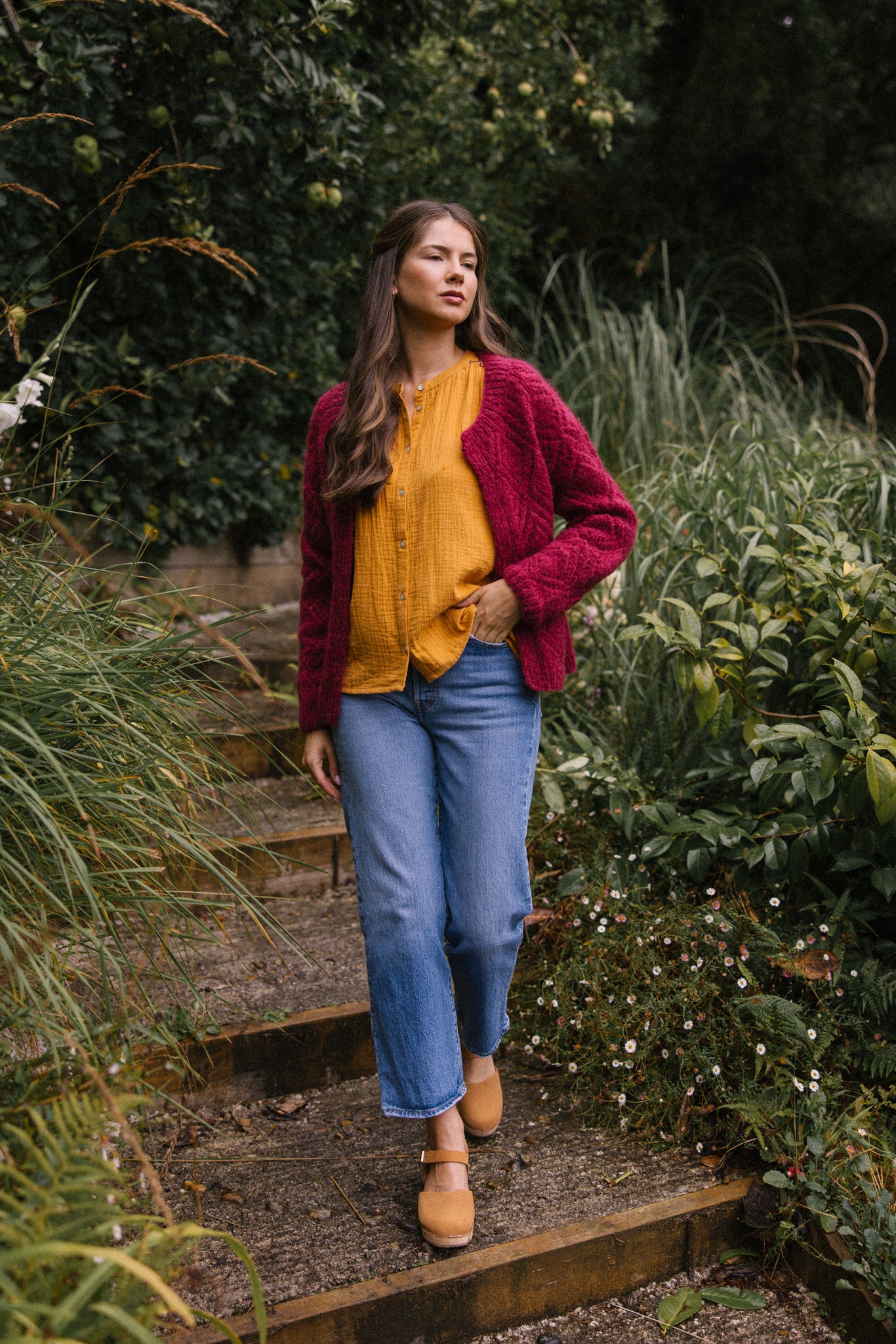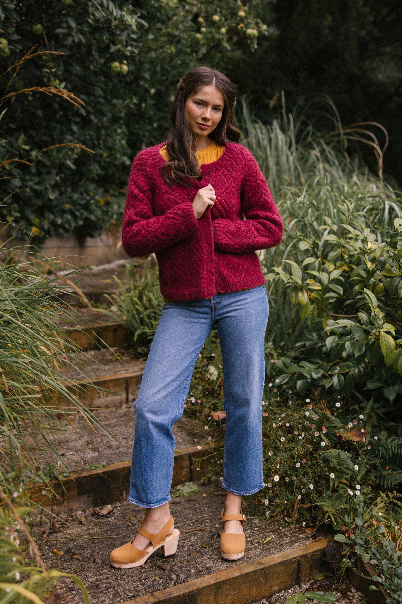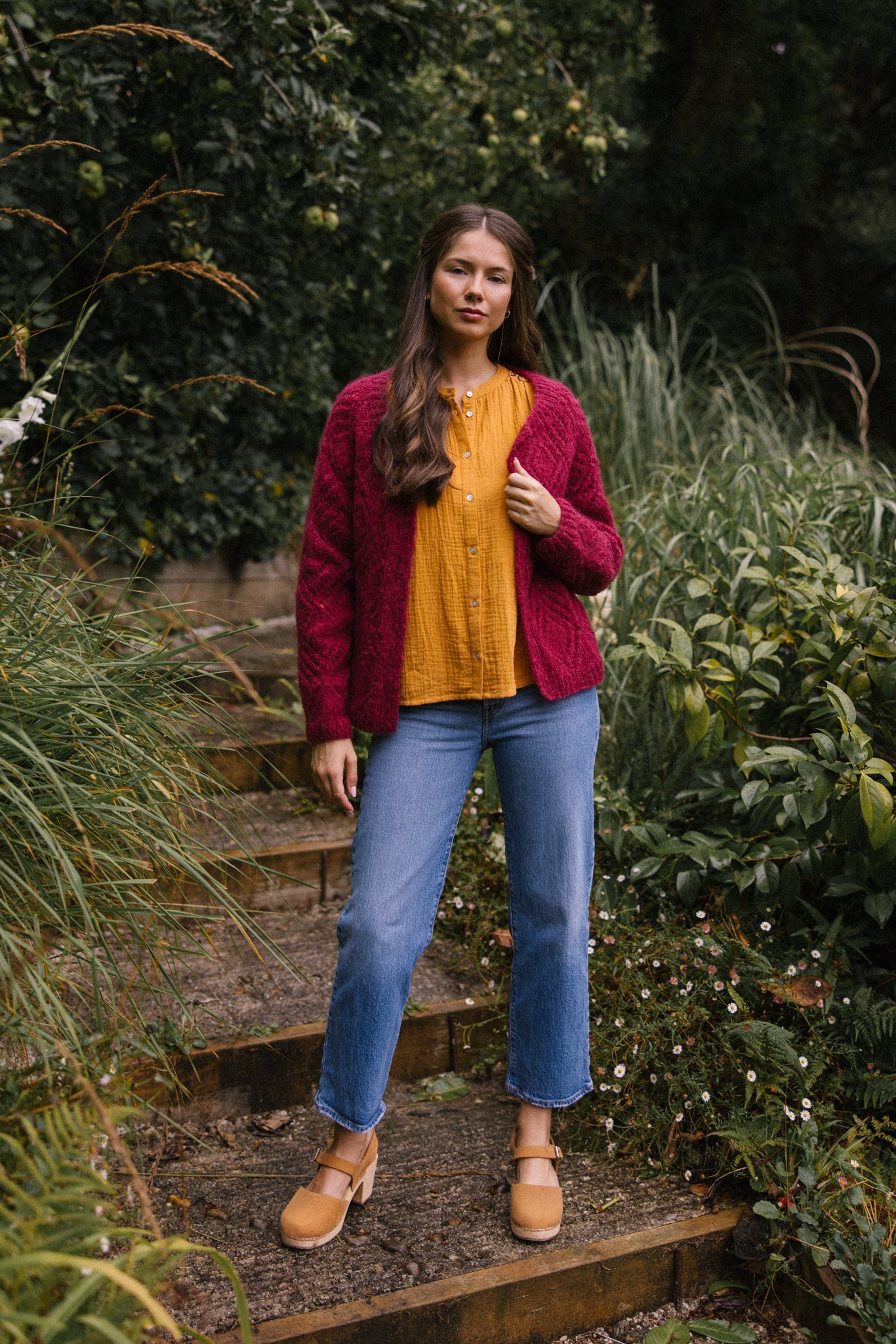 A beautiful, warm layering piece. The yarn is hand-spun, hand-dyed and made from non-mulesed wool.