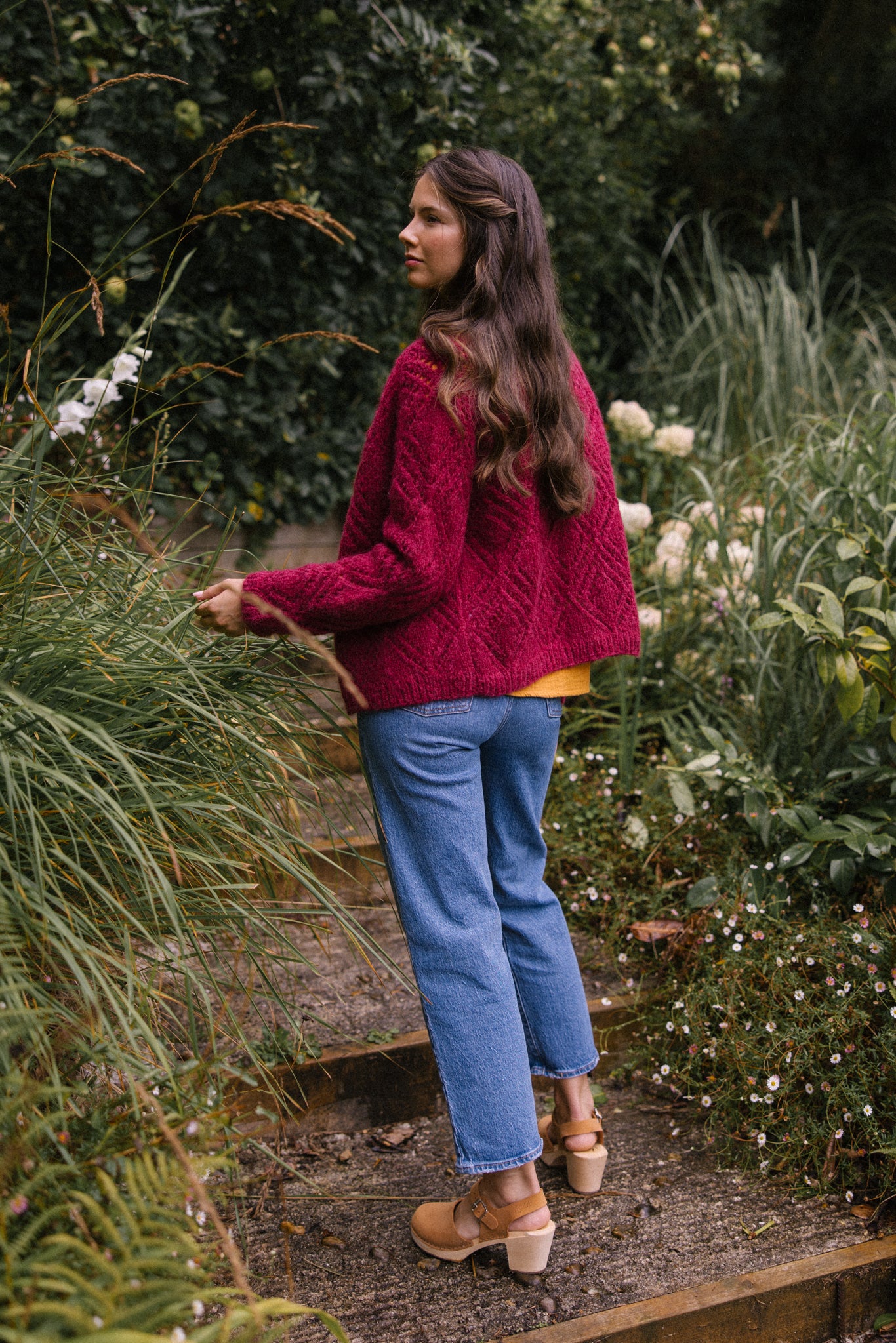 This unique handknitted cardigan features intricate lace stitching front and back.