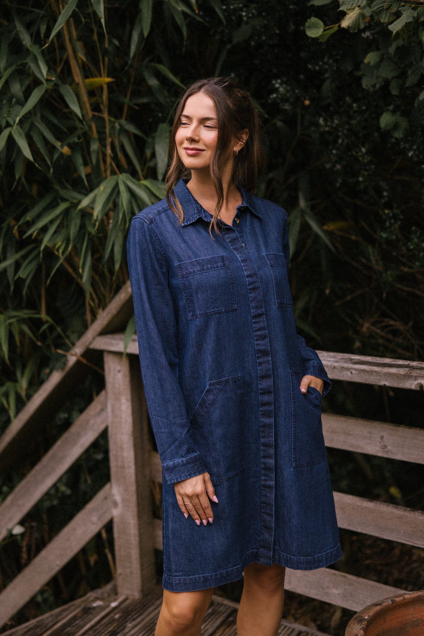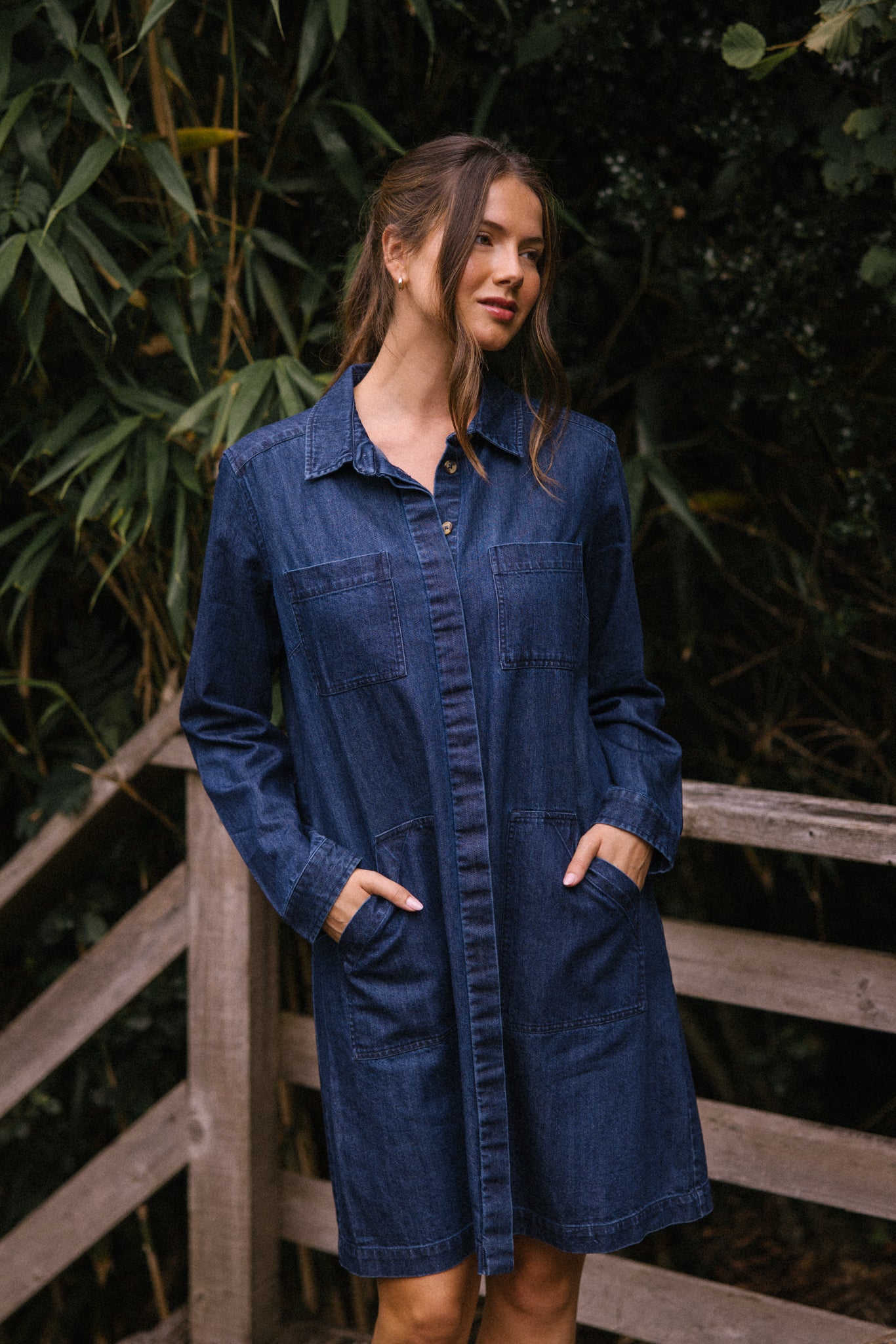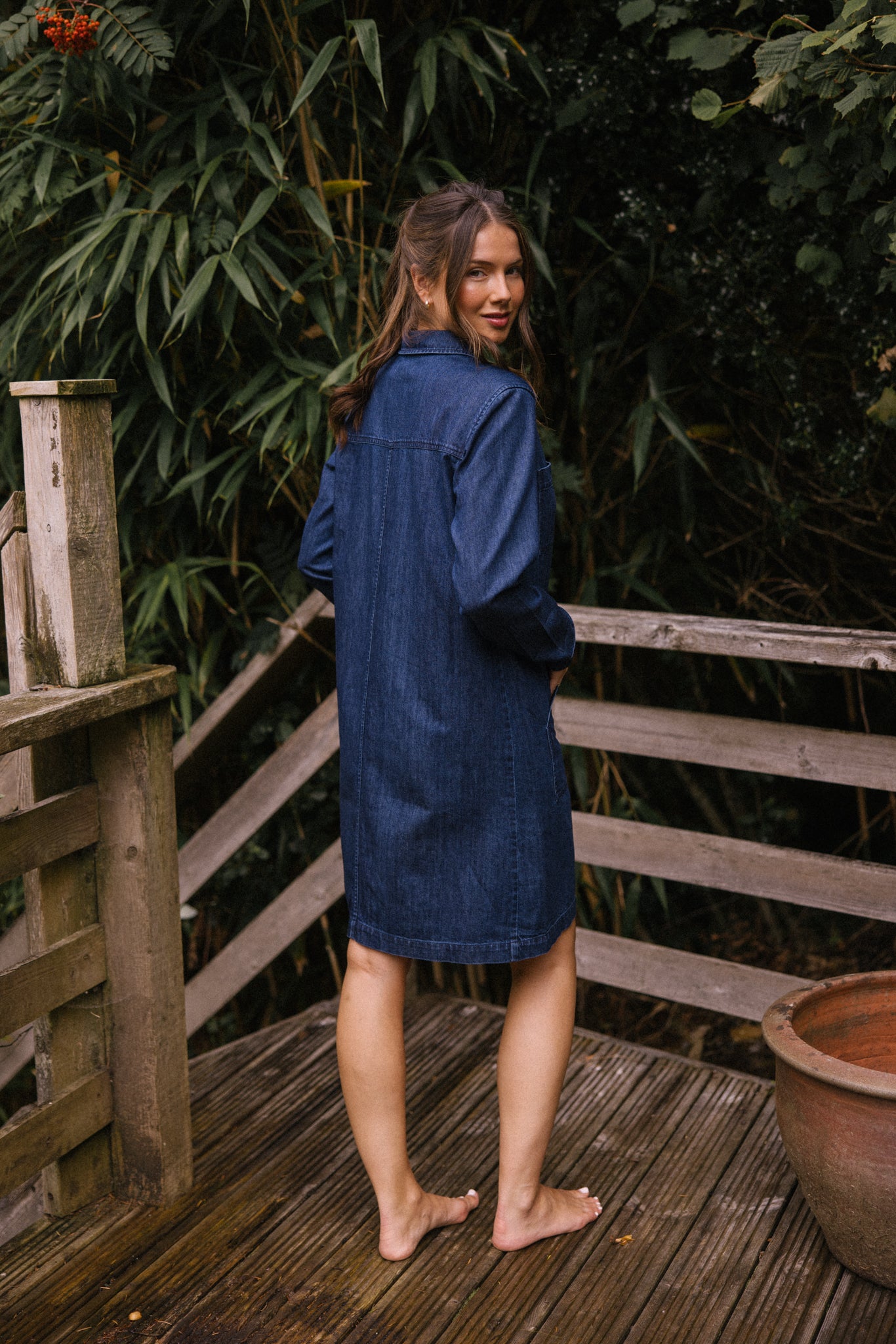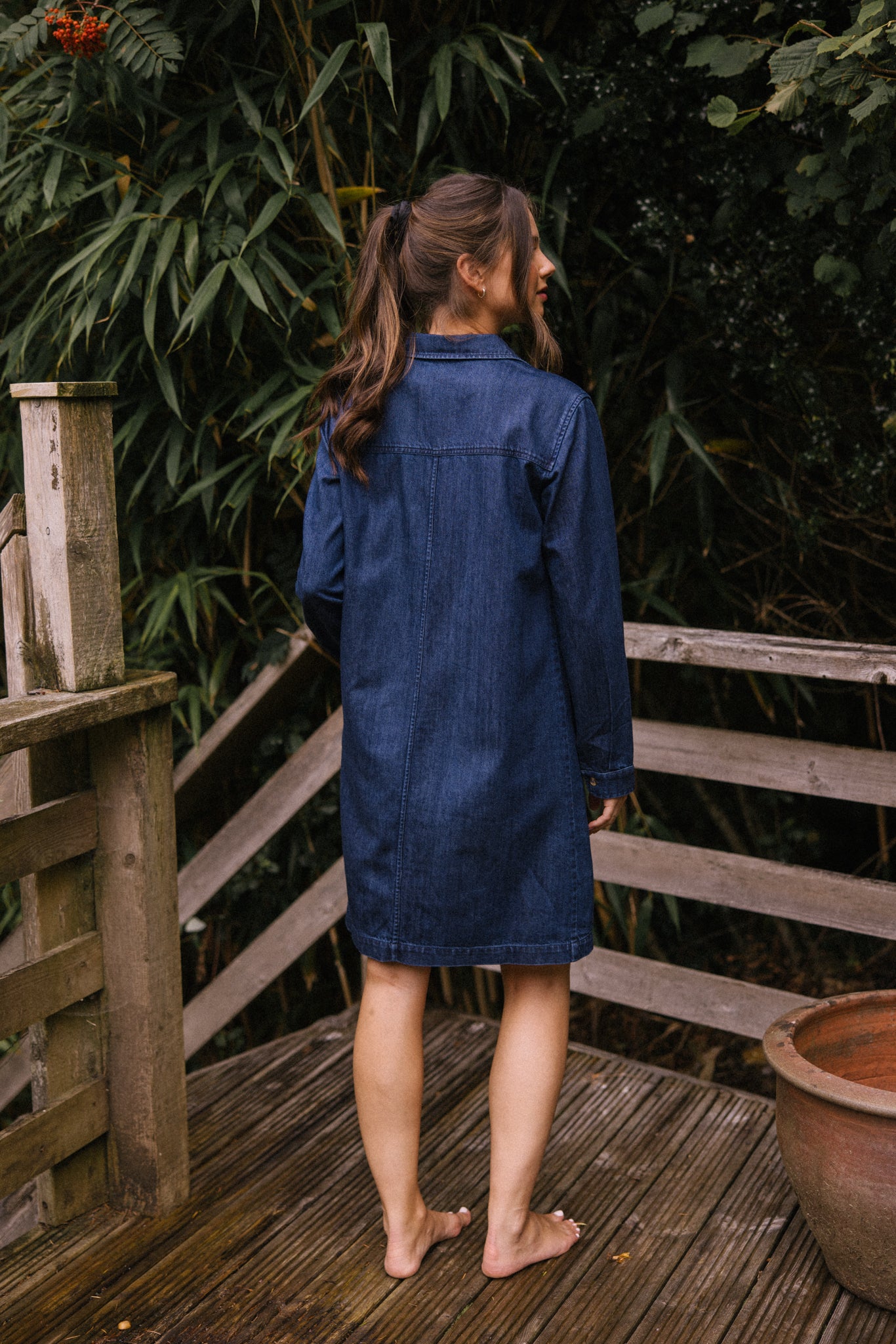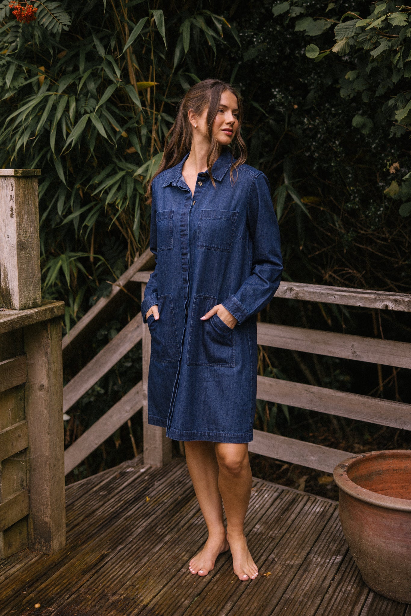 A shorter shirt dress in midweight blue cotton denim. Its loose-fitting shape means it can be worn alone, as a tunic, or as a long overshirt. The dress is finished with two pockets at the chest and two large carpenter patched pockets. Button-down placket (buttons are covered). Full-length buttoned sleeves. Falls above the knee.