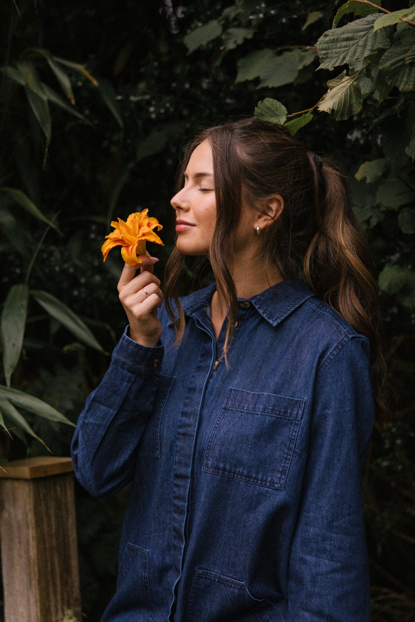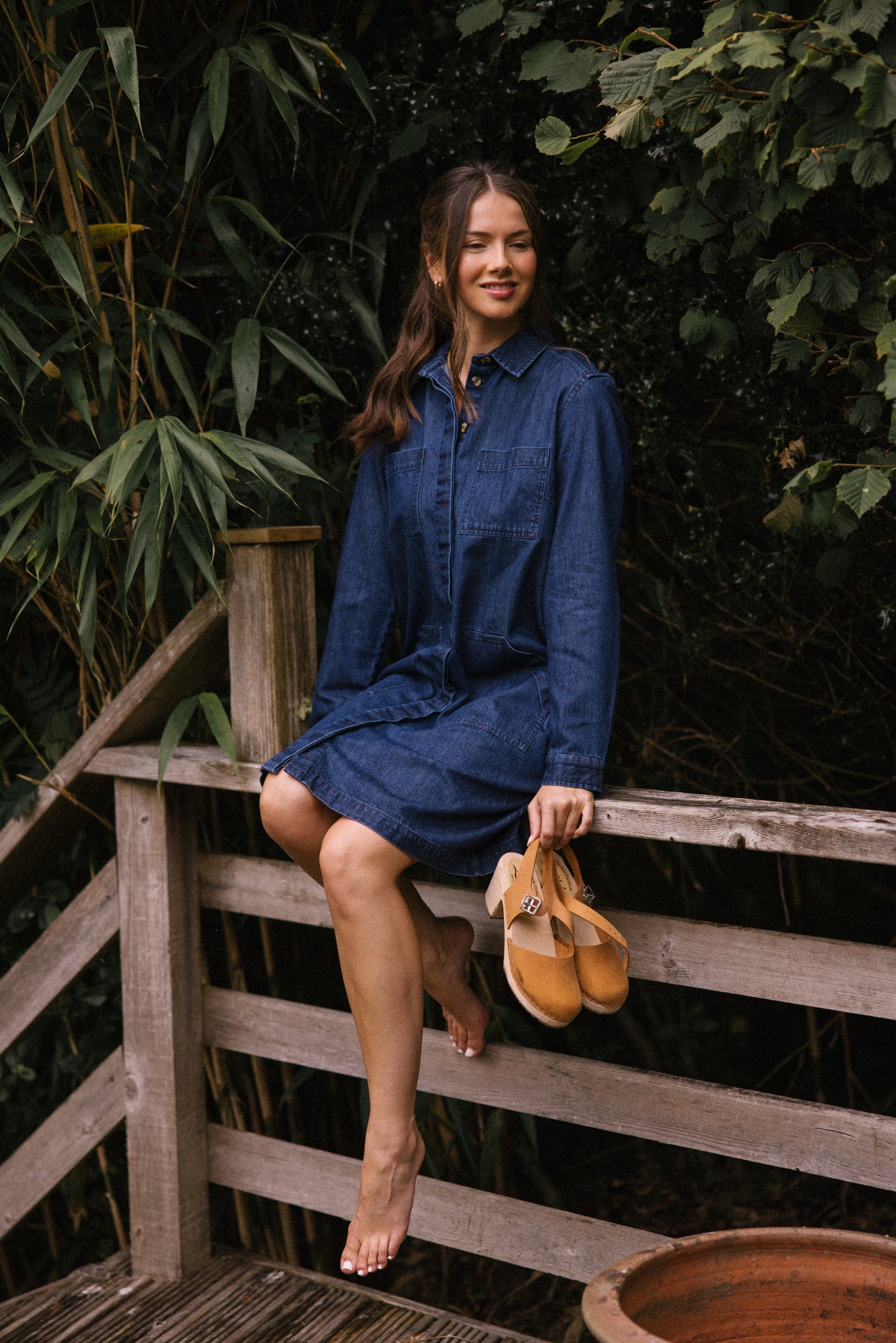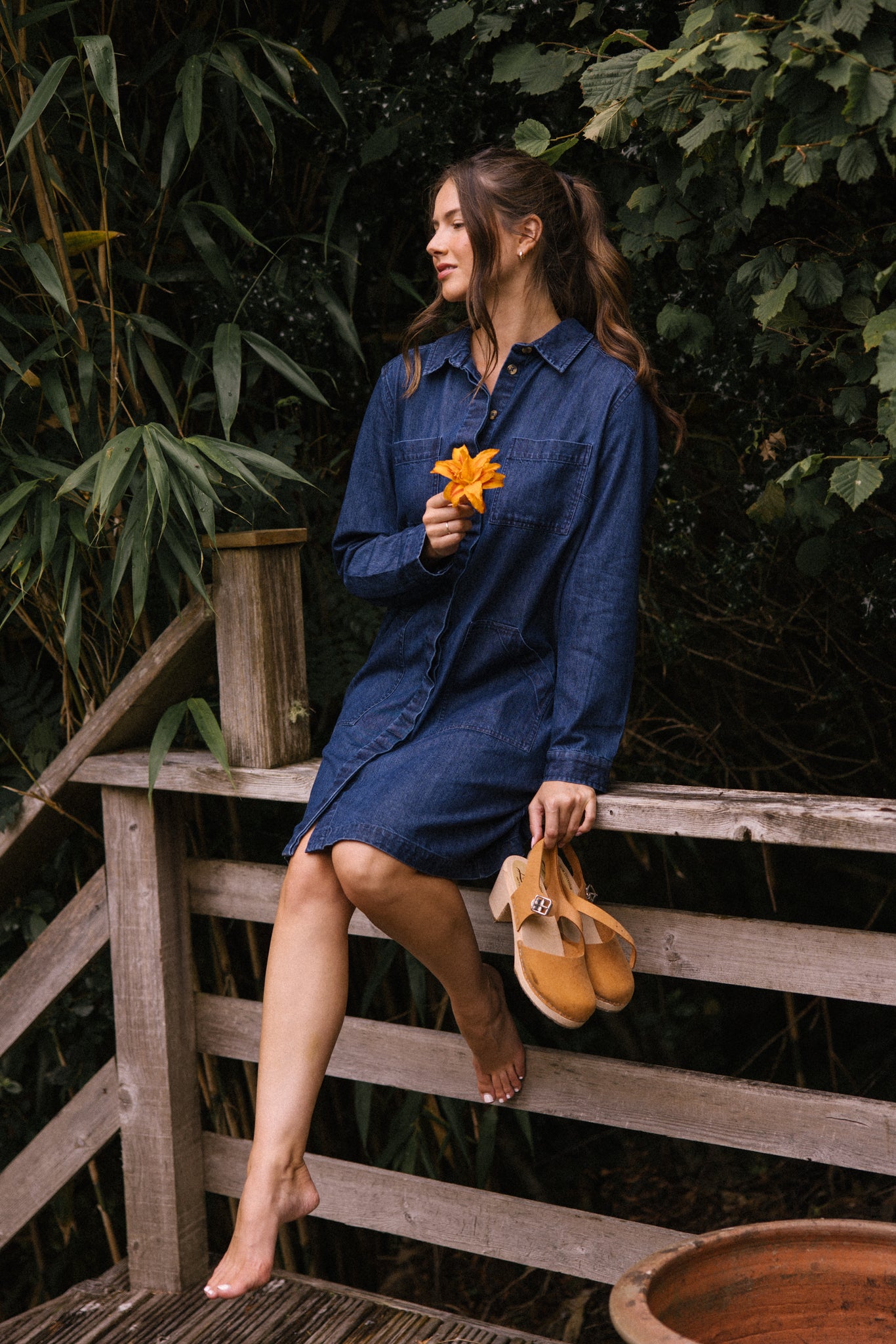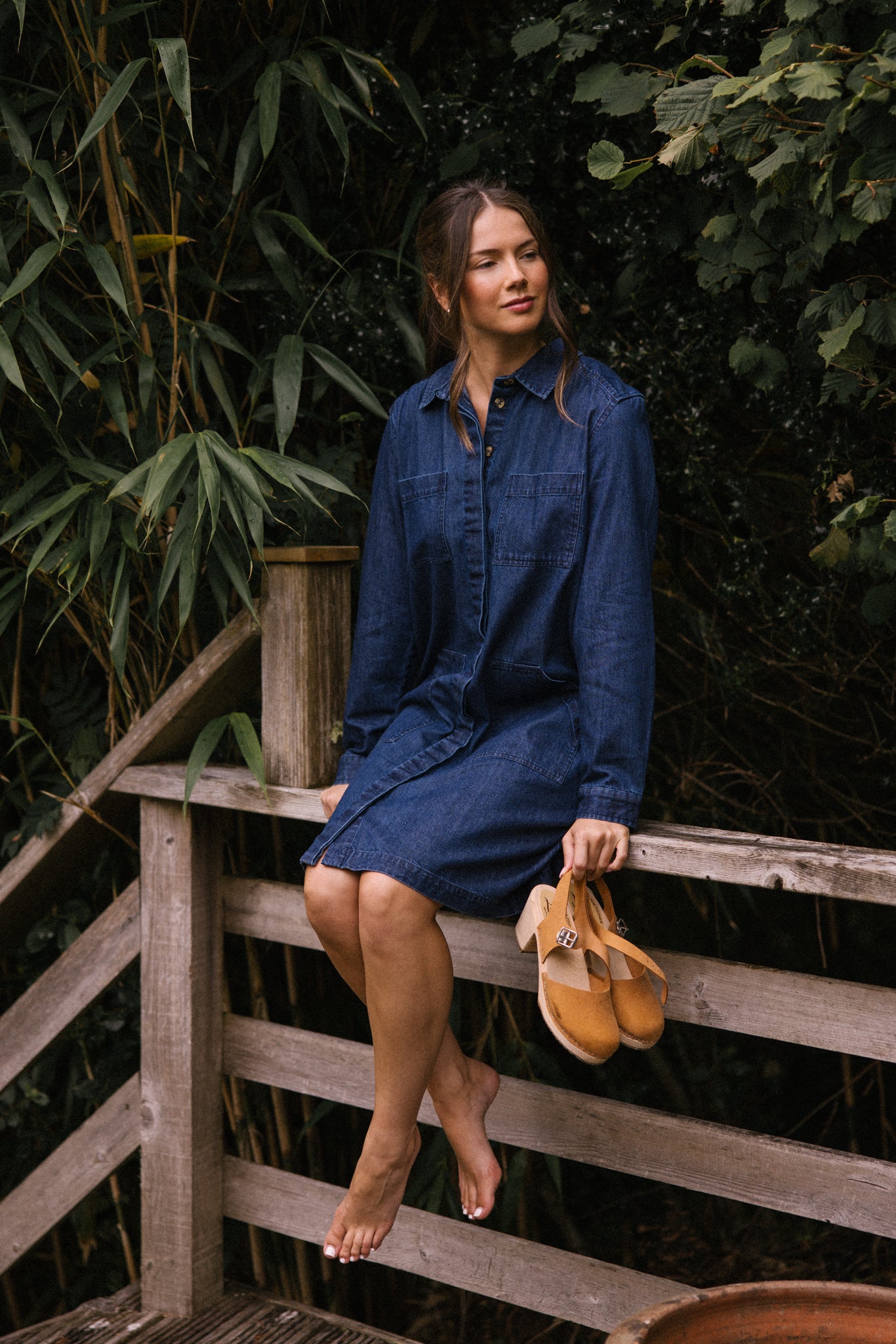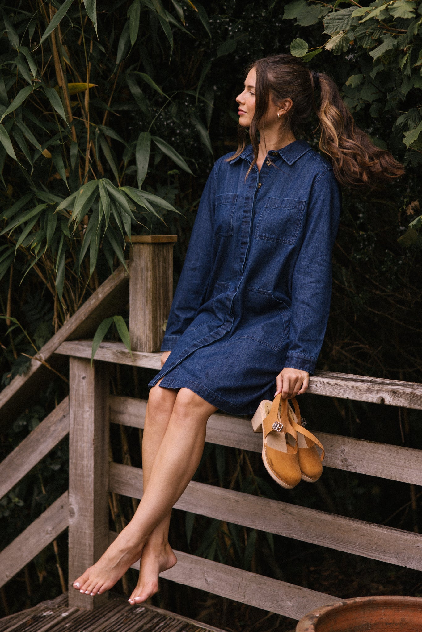 A shorter shirt dress in midweight blue cotton denim. Its loose-fitting shape means it can be worn alone, as a tunic, or as a long overshirt. The dress is finished with two pockets at the chest and two large carpenter patched pockets. Button-down placket (buttons are covered). Full-length buttoned sleeves. Falls above the knee.
