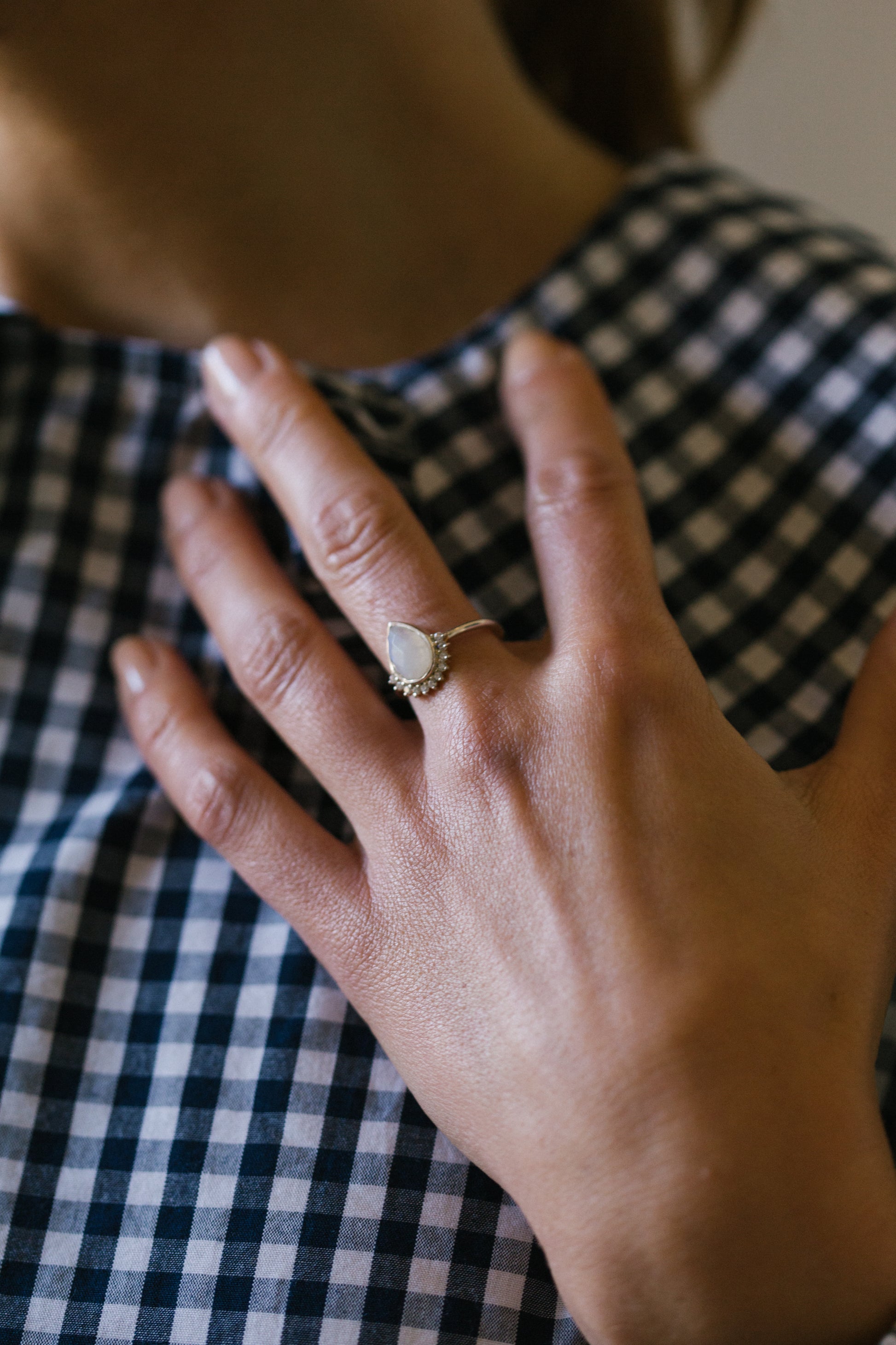 A beautiful Oval crested ring set in Sterling Silver with a choice of Rainbow Moonstone or Aqua Chalcedony stones.