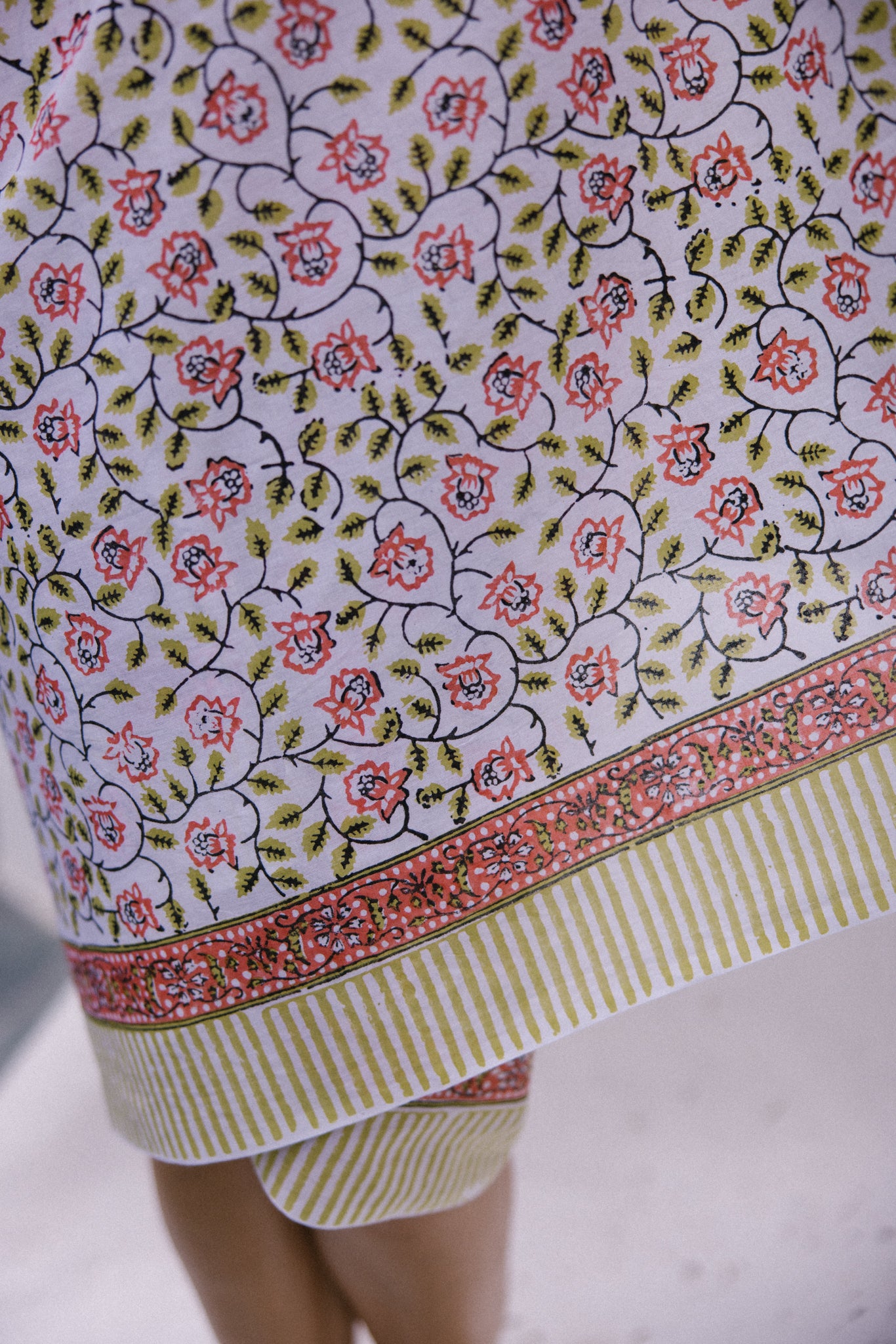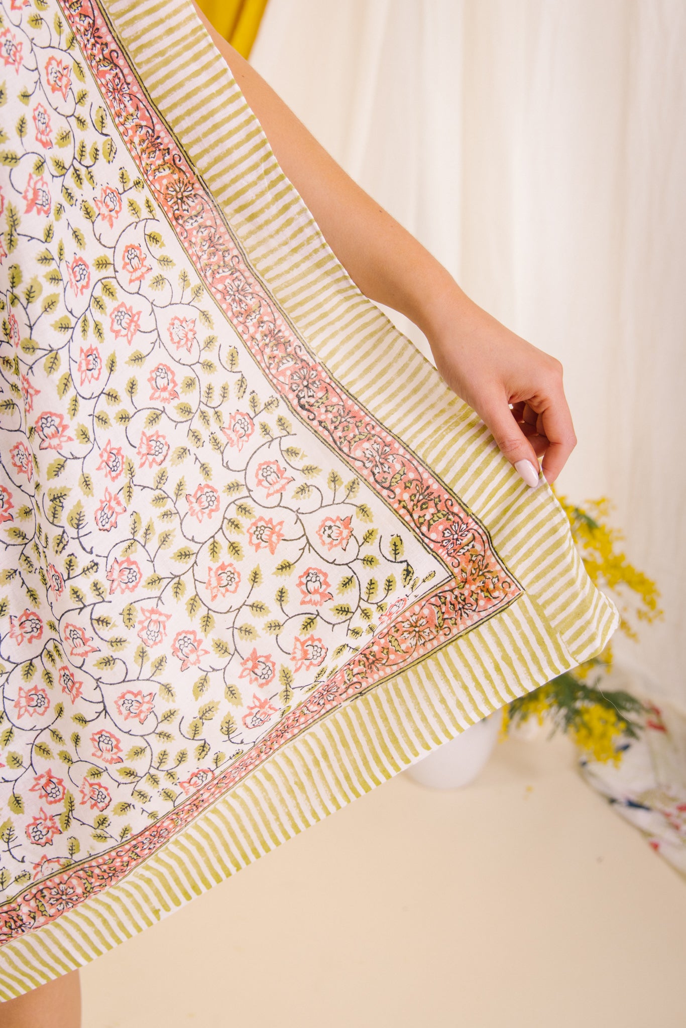 Made by skilled artisans which pass down this craft from generation to generation, we have used a form of Bagru printing which is a type of hand block printing which uses vegetables, mud and sand etc to create natural pigments which are kinder to the environment.