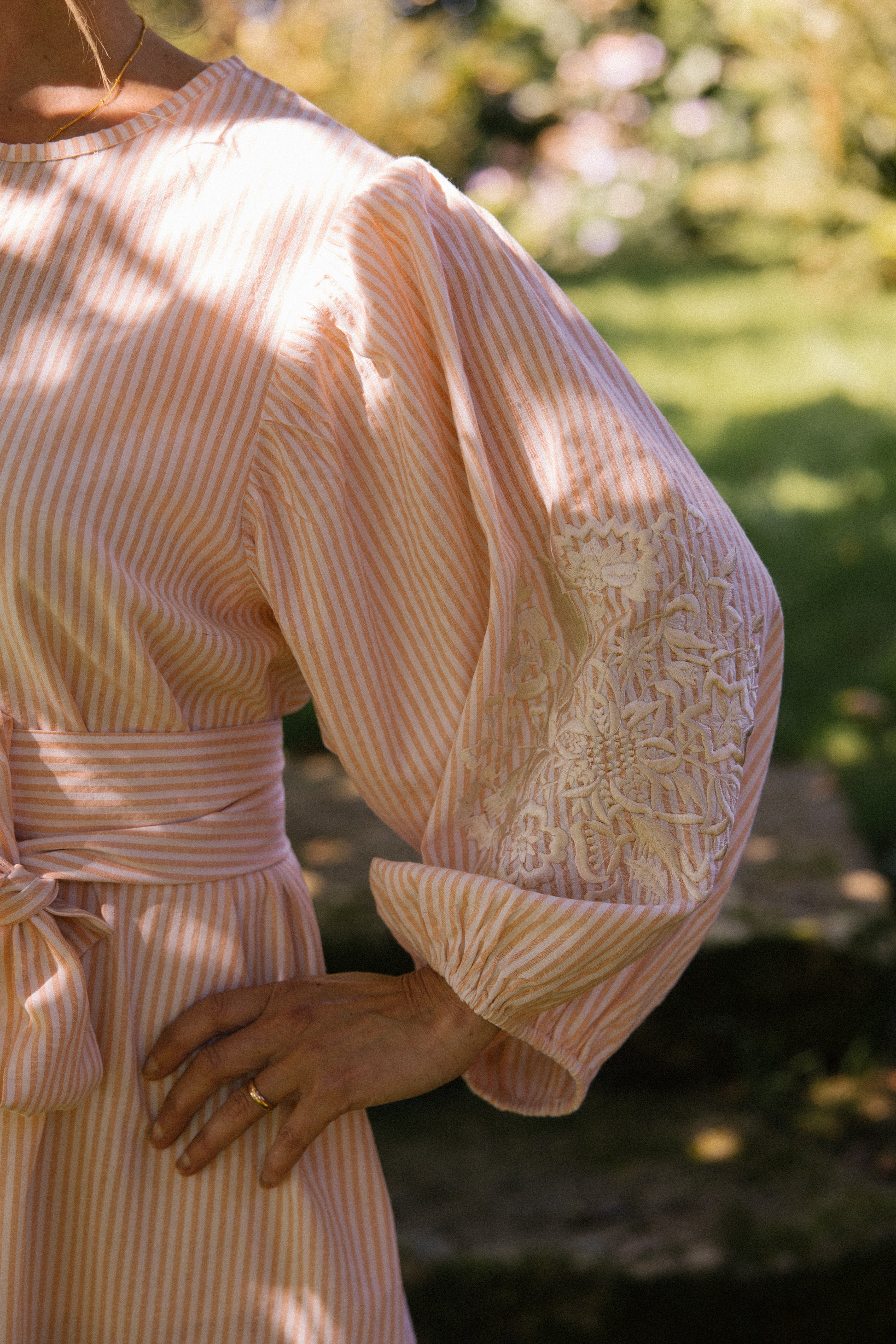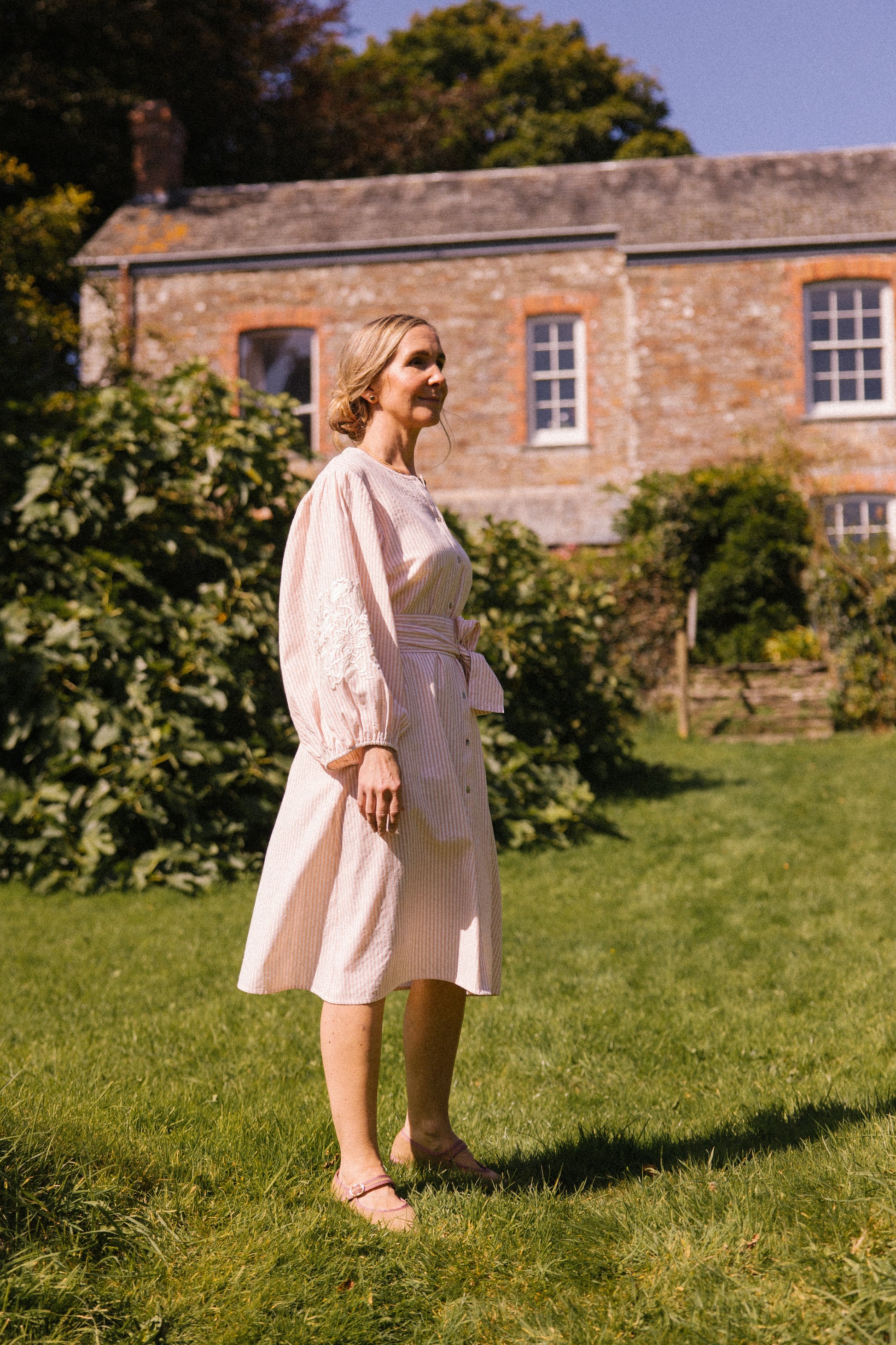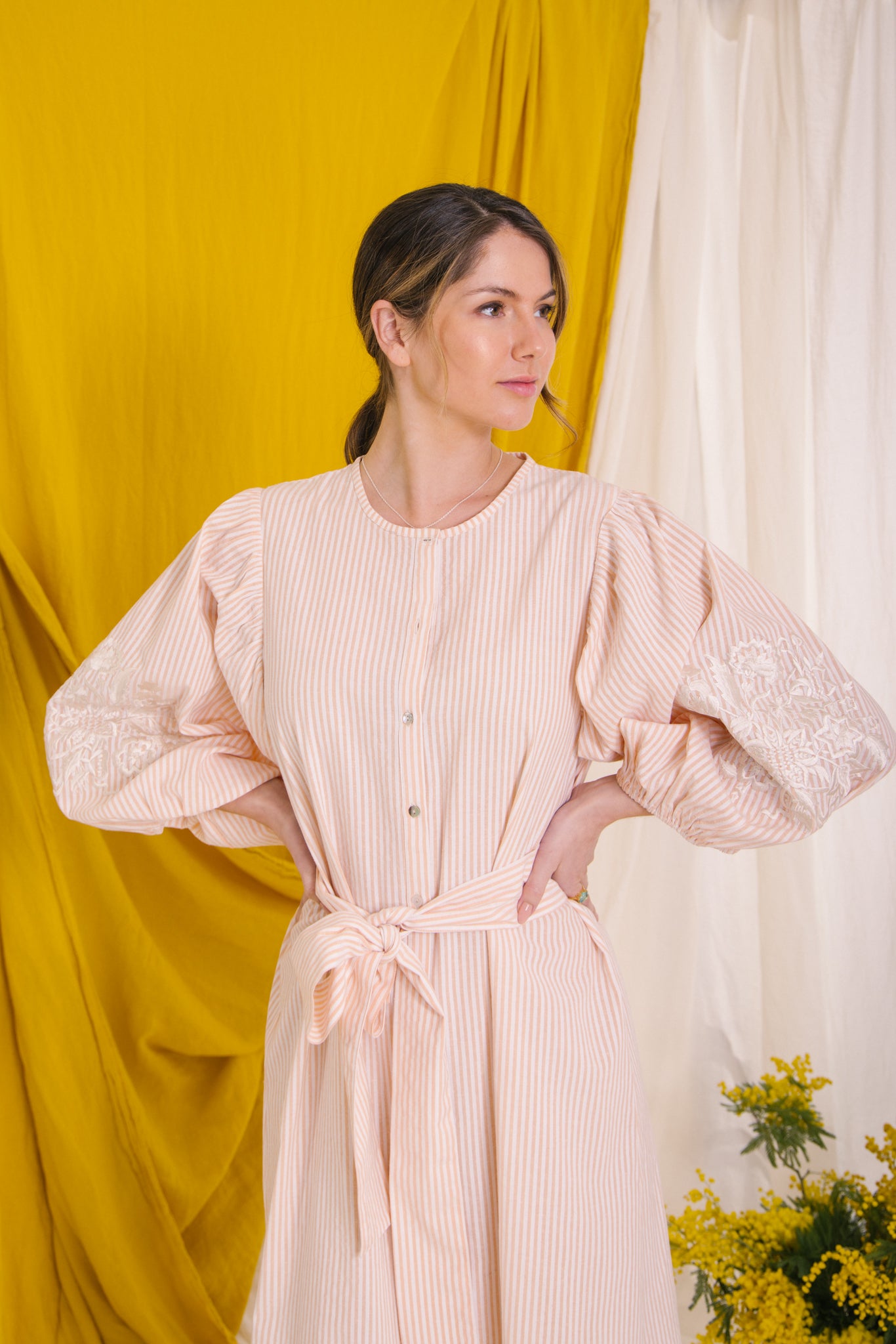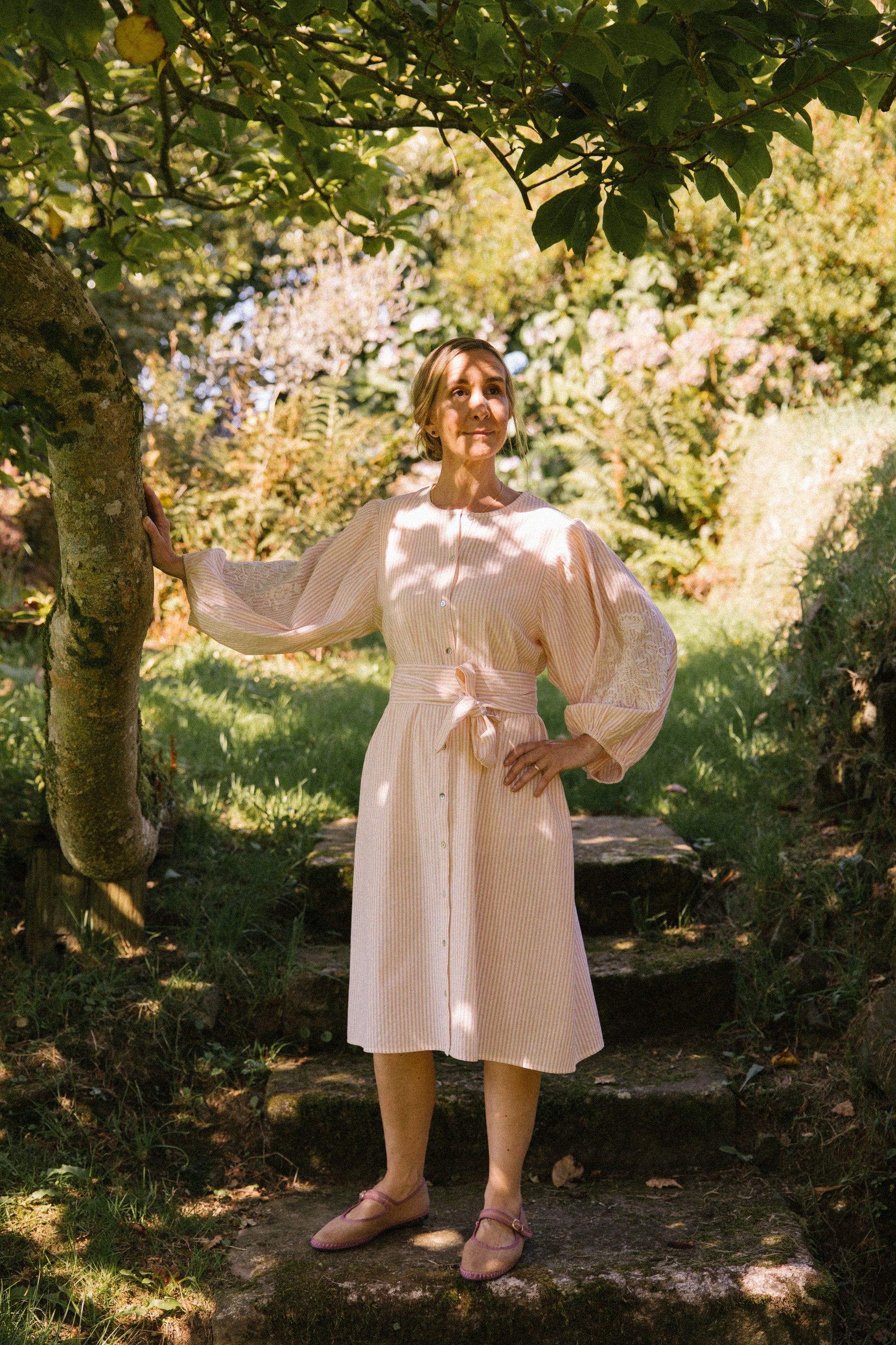 Bella dress is crafted from a gentle seersucker, she has a round neck line with beautiful embroidery detail running along the outer edge of the blouson sleeves, mother of pearl buttons .