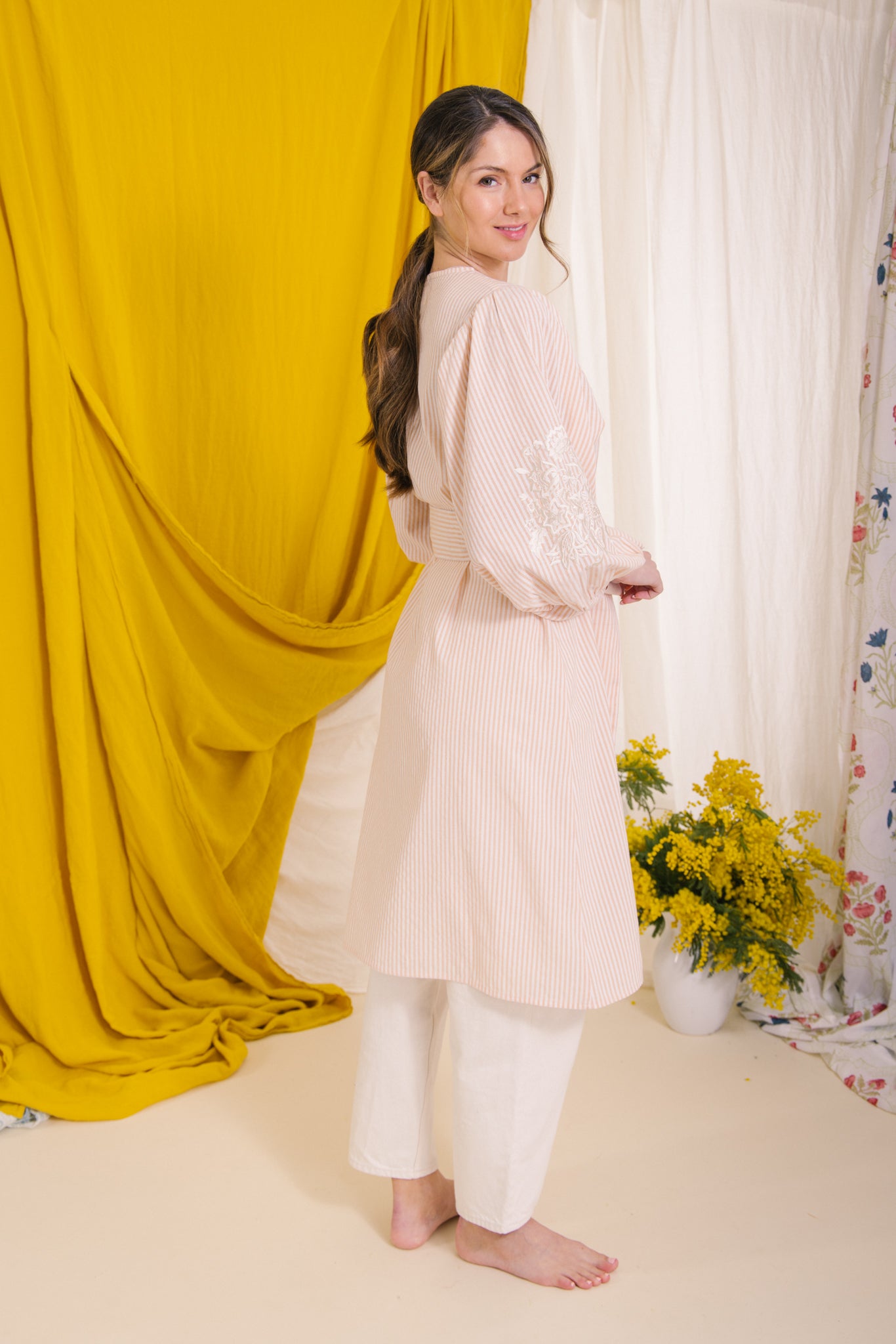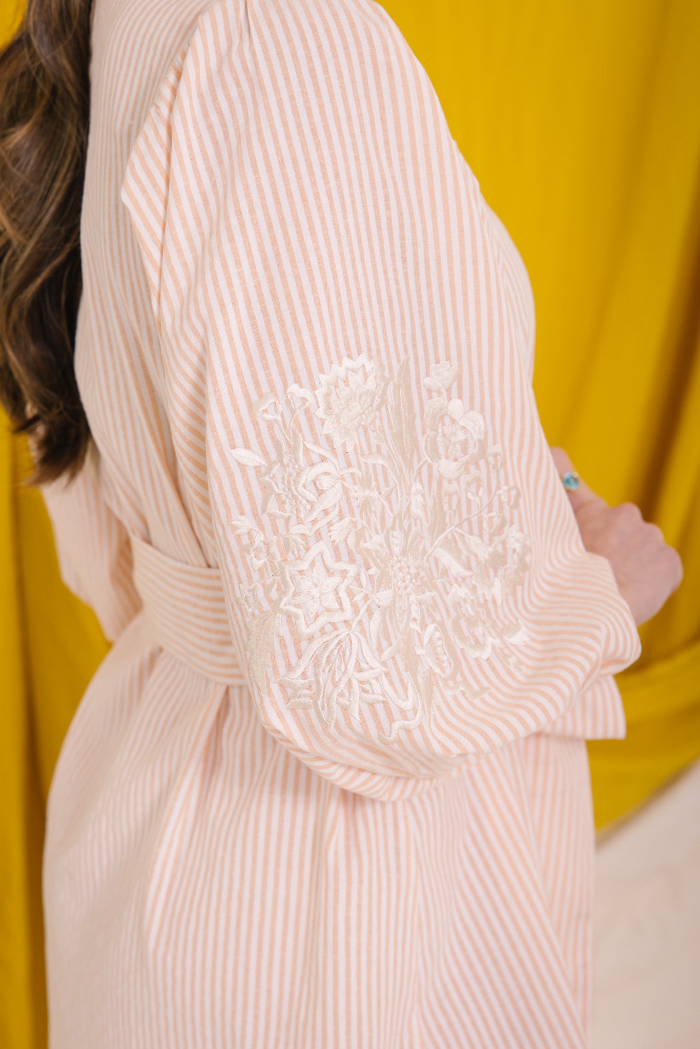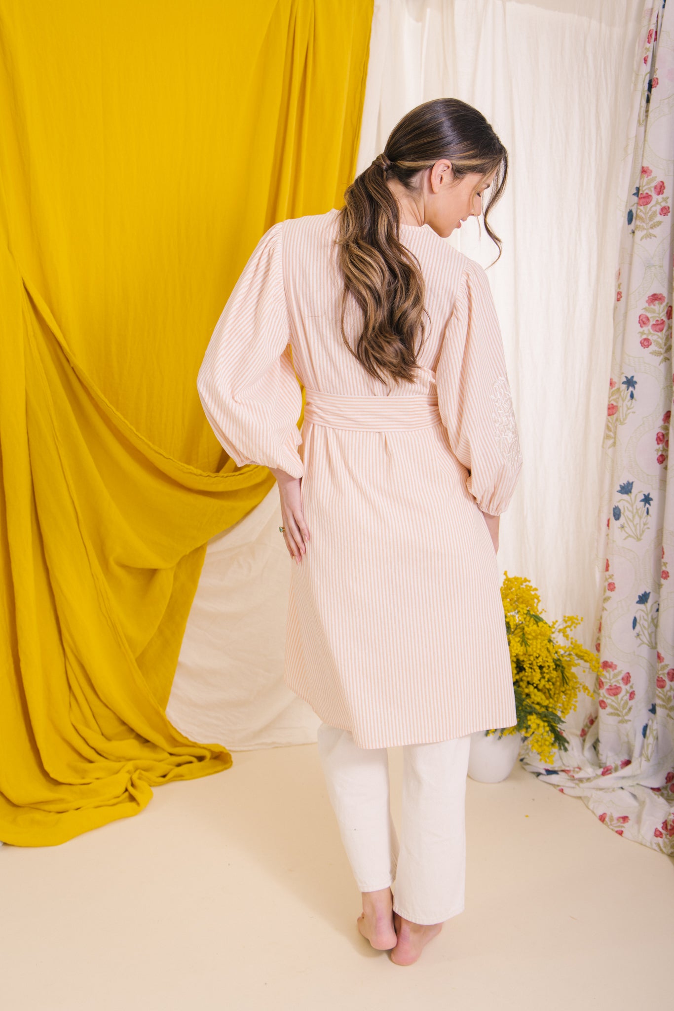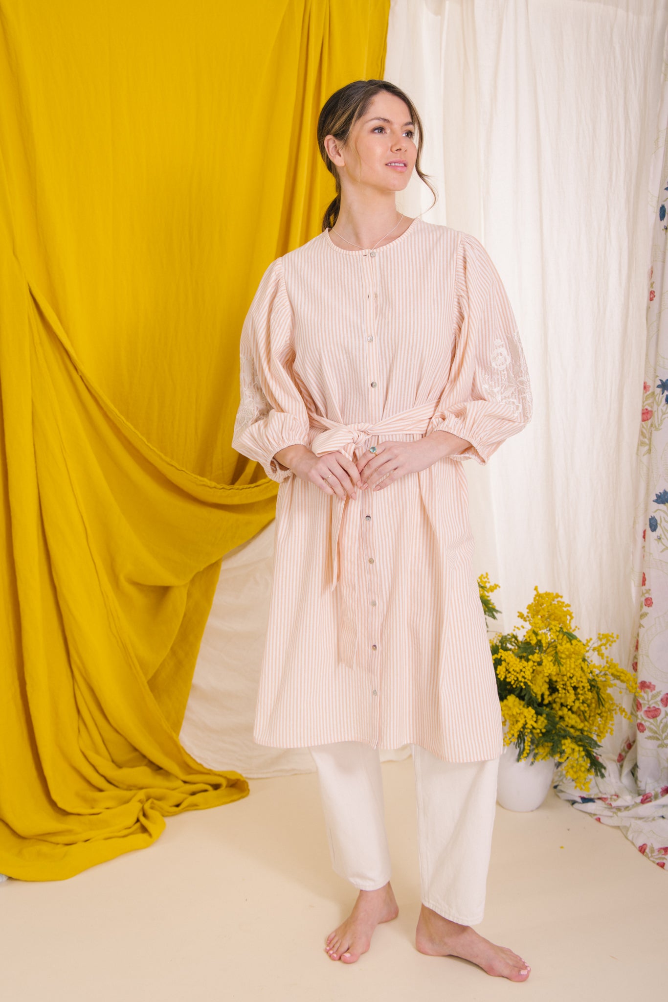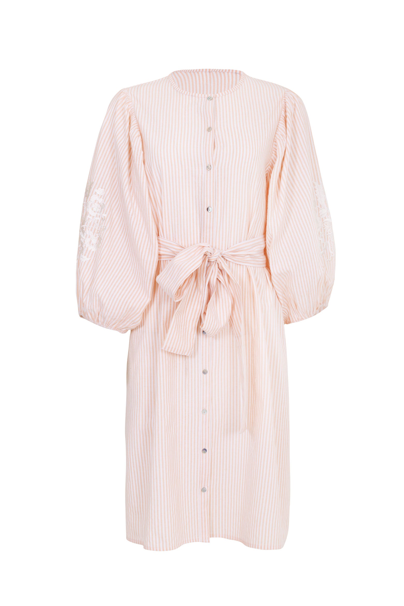 Bella dress is crafted from a gentle seersucker, she has a round neck line with beautiful embroidery detail running along the outer edge of the blouson sleeves, mother of pearl buttons .