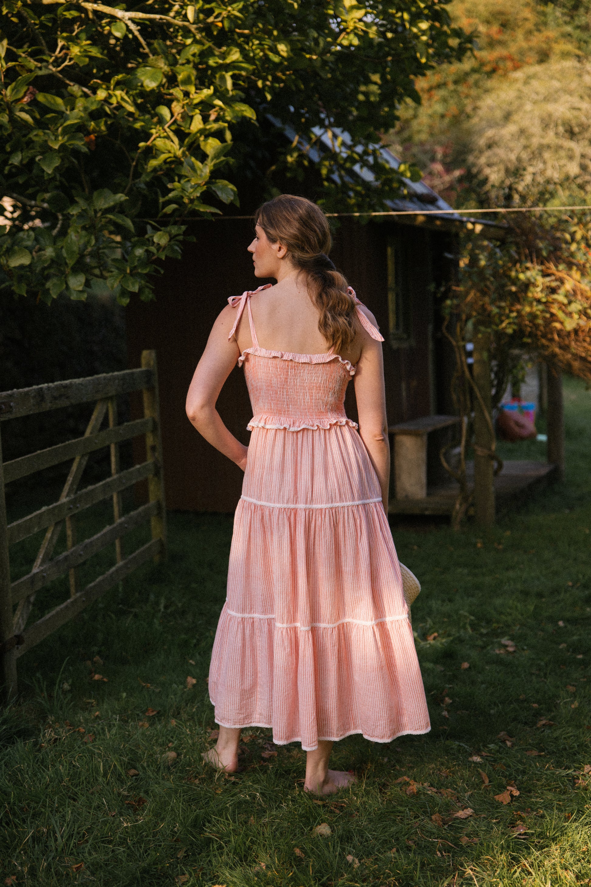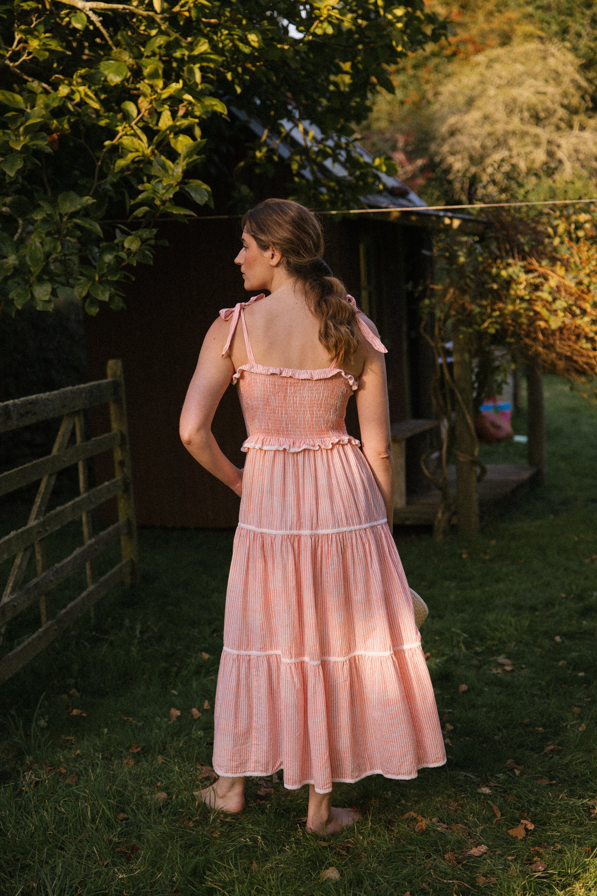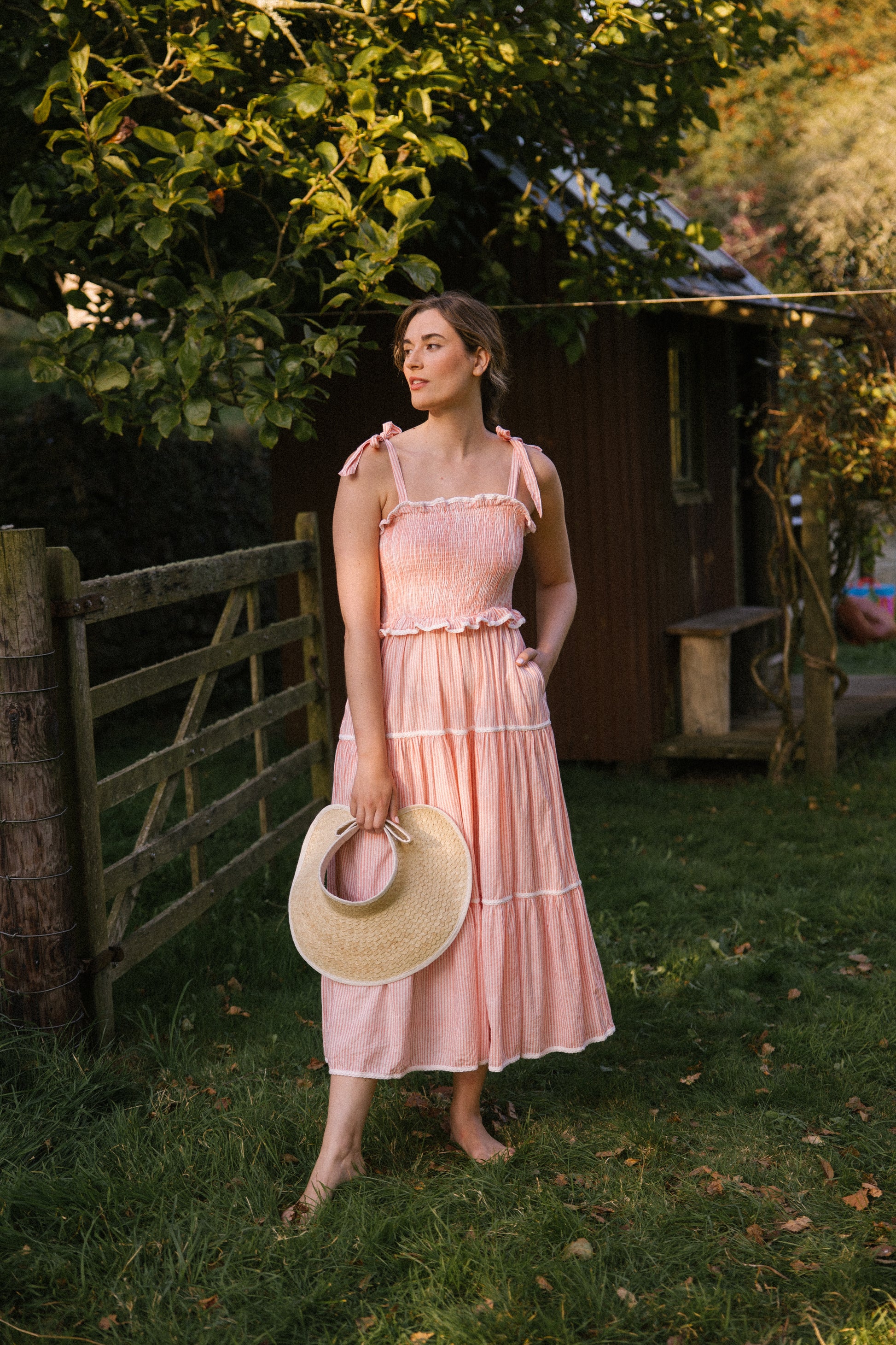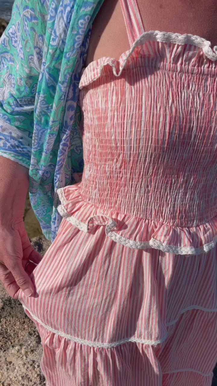 Crafted from organic cotton in the prettiest shade of peachy pink & white , with a super flattering smocked bodice and finished with adjustable shoulder tie straps , lace trim on ruffle frill plus tiers makes this dress a utterly feminine look and of course internal side pockets for your lippy .