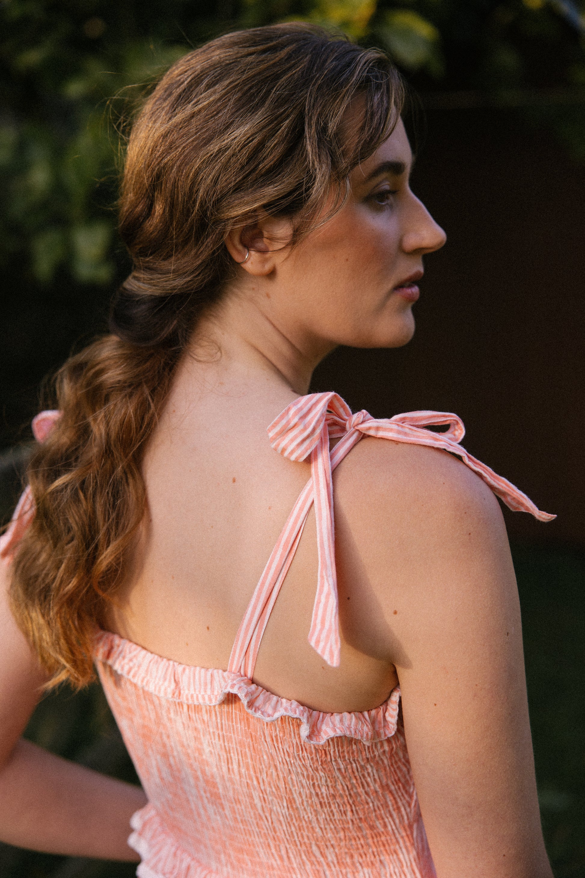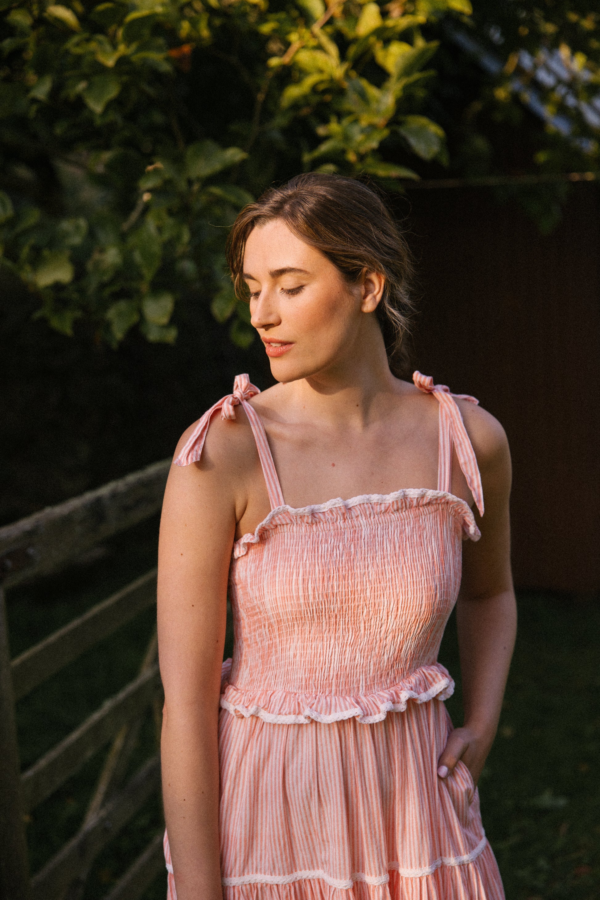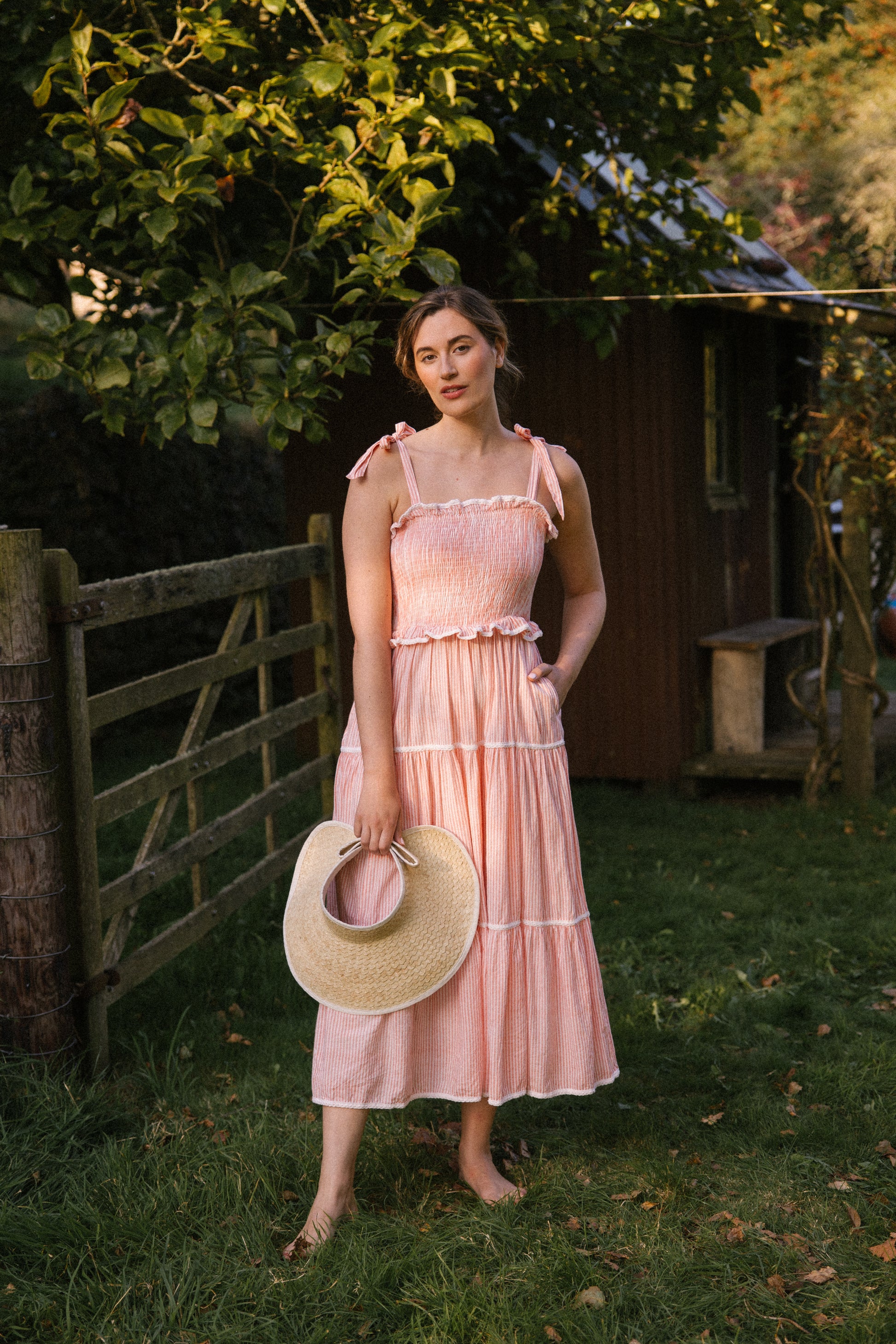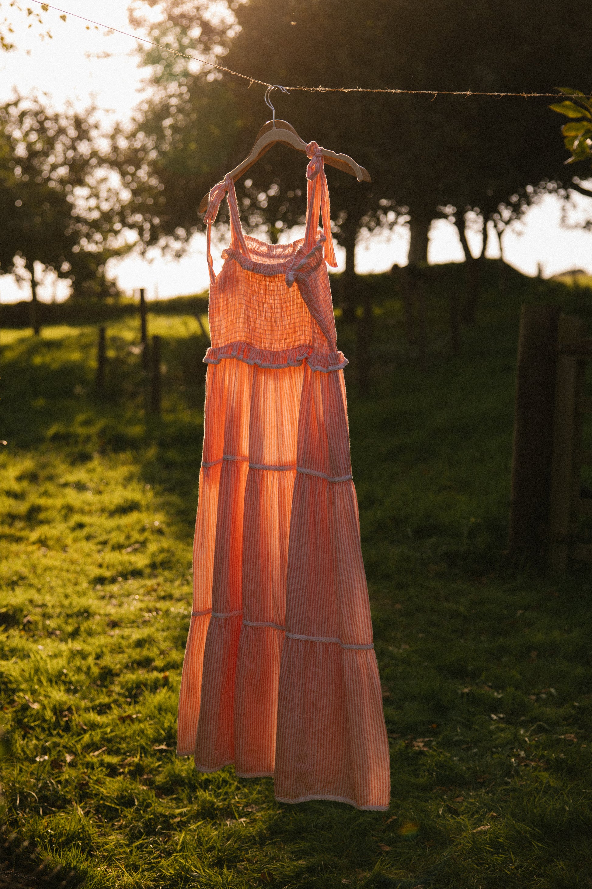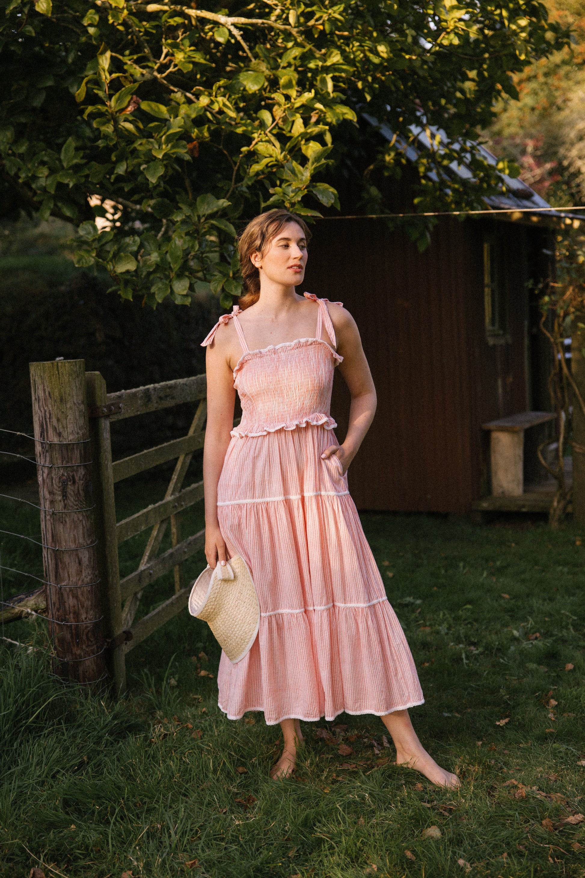 Crafted from organic cotton in the prettiest shade of peachy pink & white , with a super flattering smocked bodice and finished with adjustable shoulder tie straps , lace trim on ruffle frill plus tiers makes this dress a utterly feminine look and of course internal side pockets for your lippy .