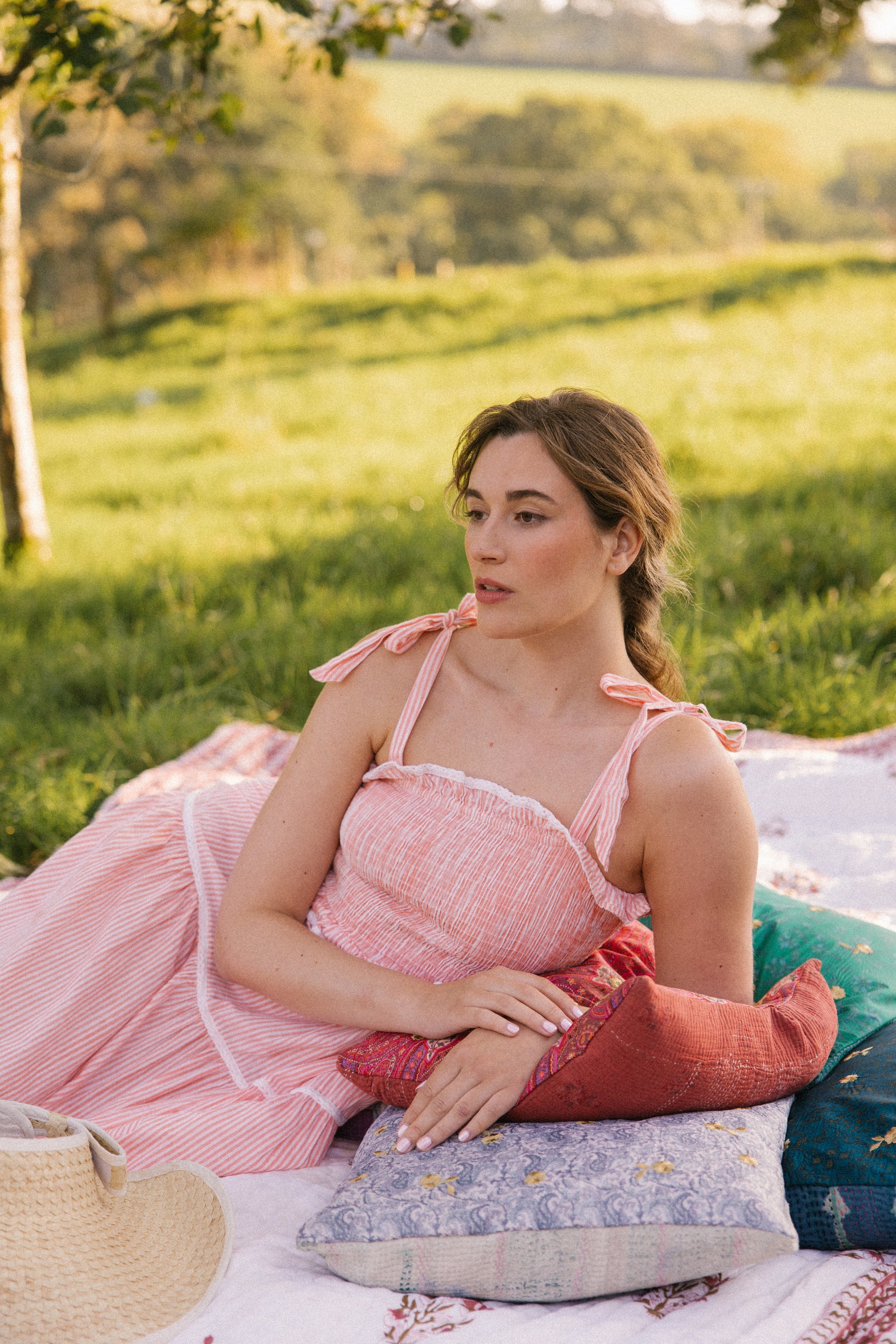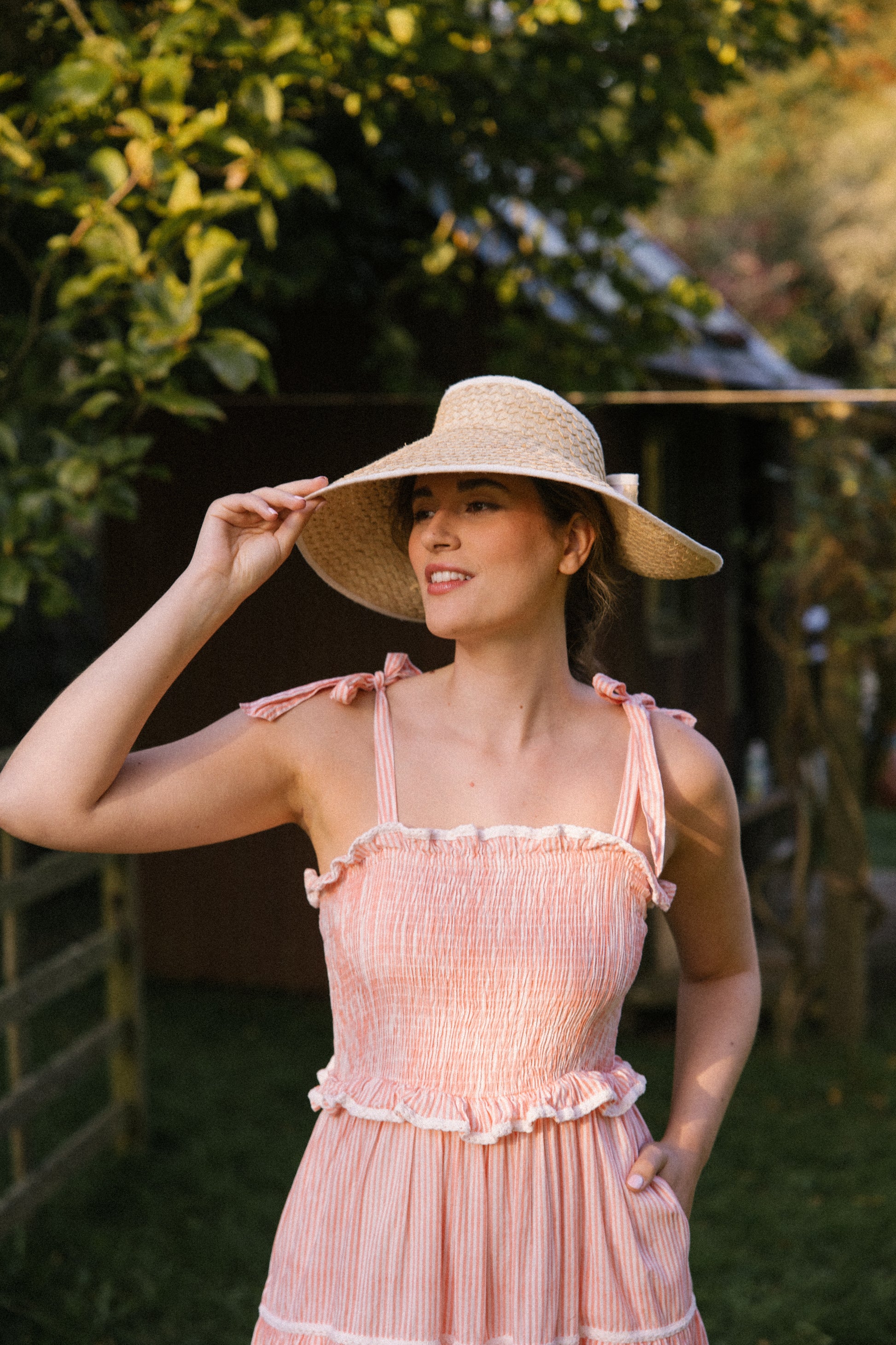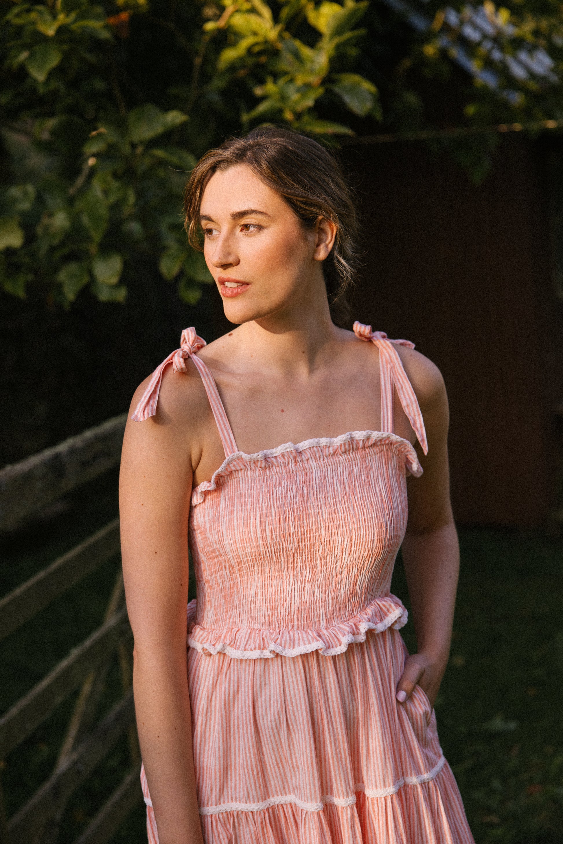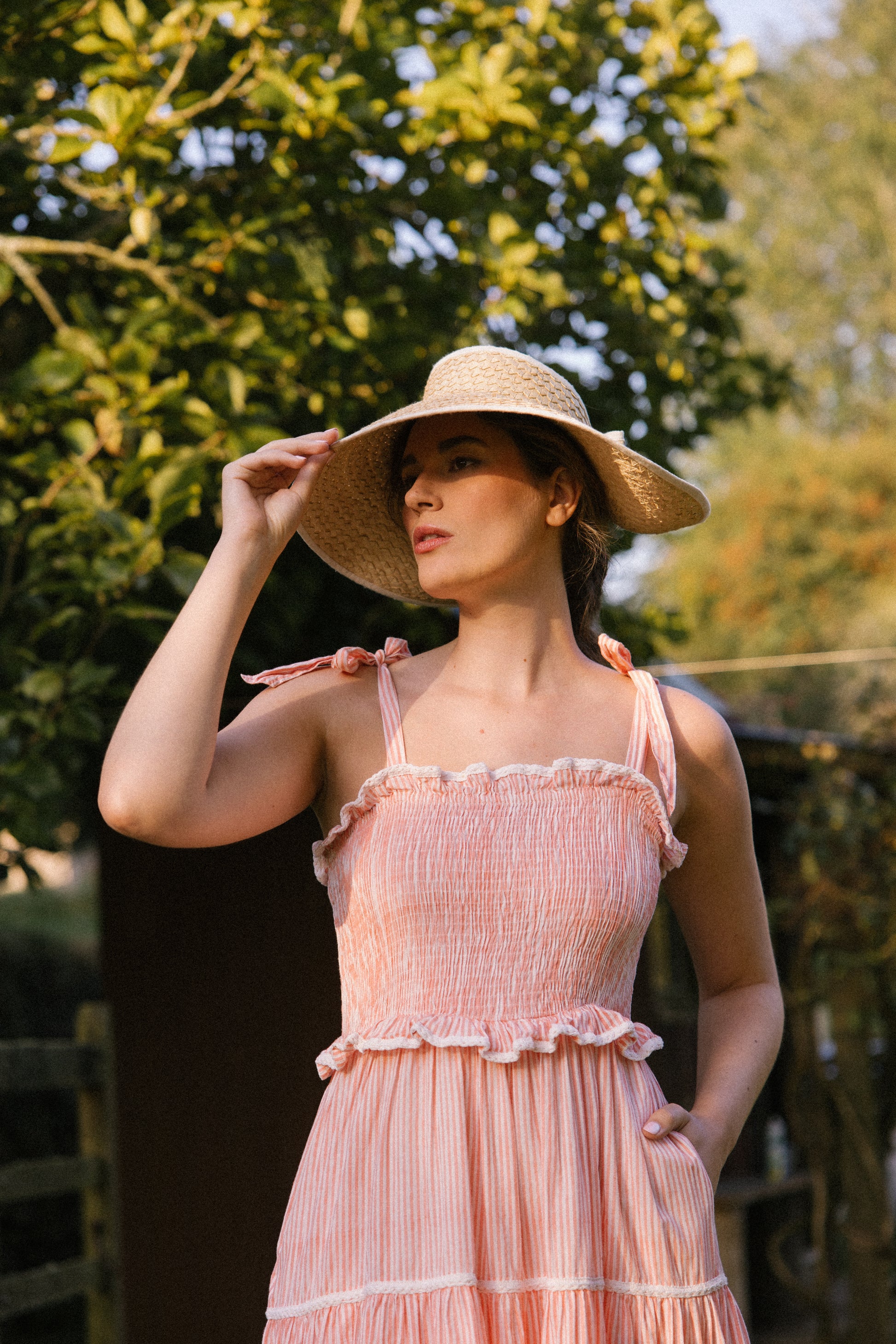 Crafted from organic cotton in the prettiest shade of peachy pink & white , with a super flattering smocked bodice and finished with adjustable shoulder tie straps , lace trim on ruffle frill plus tiers makes this dress a utterly feminine look and of course internal side pockets for your lippy .
