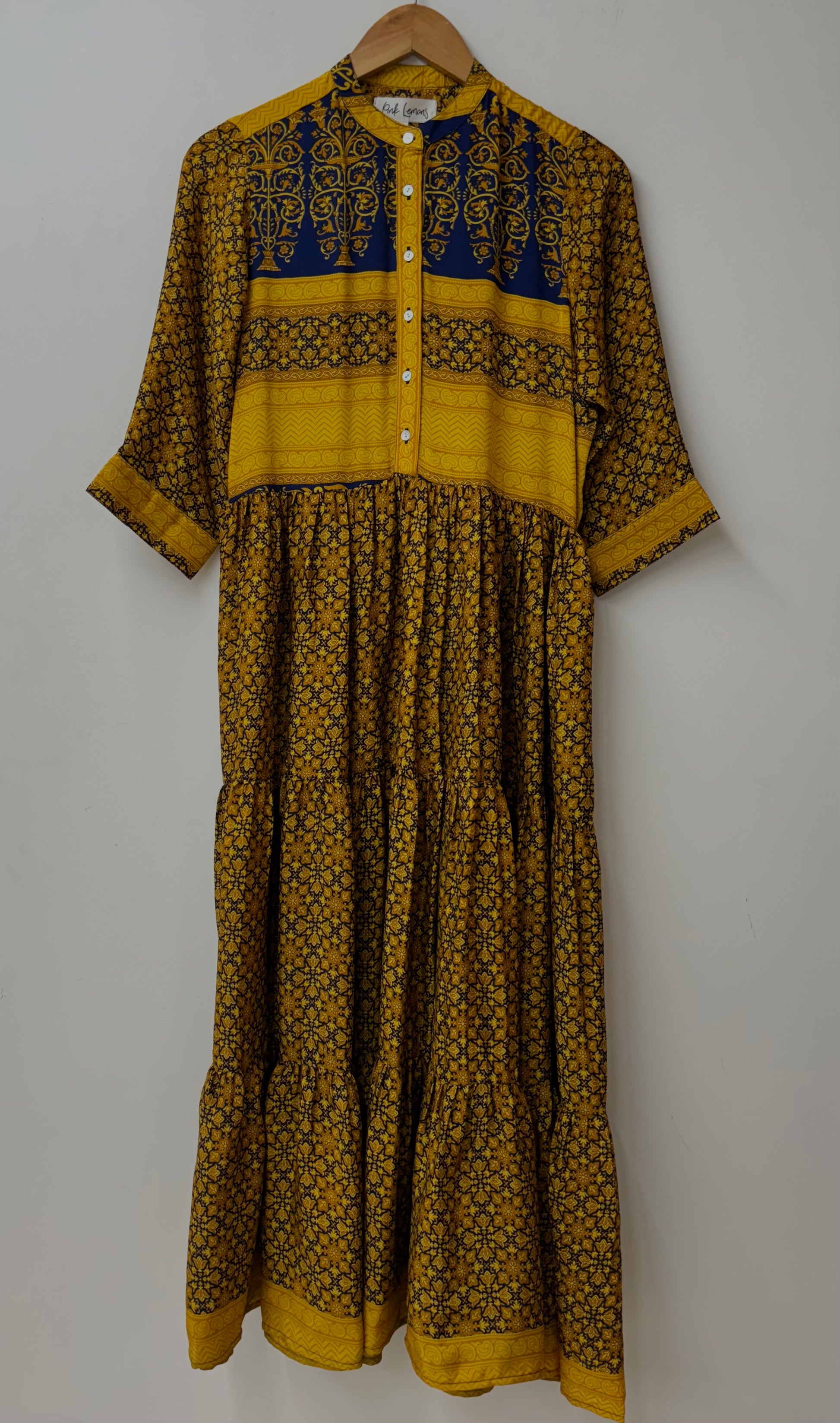 Prairie dress is made from a beautiful up-cycled vintage sari , she is super versatile and with year round appeal, she is a beautiful full length prairie style dress with a buttoned front and a tiered skirt. Their is 5 Buttons for front opening, she has a full skirt with three tiers and 3/4 length sleeves plus a optional belt and two deep internal side pockets.