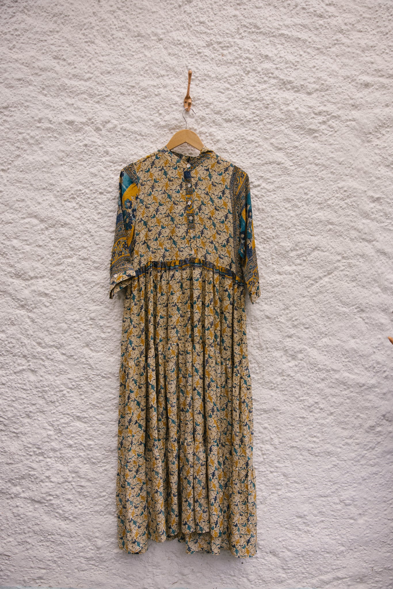 Prairie dress is made from a beautiful up-cycled vintage sari, she is super versatile and with year round appeal, she is a beautiful full length prairie style dress with a buttoned front and a tiered skirt. Their is 5 Buttons for front opening, she has a full skirt with three tiers and 3/4 length sleeves plus a optional belt and two deep internal side pockets.