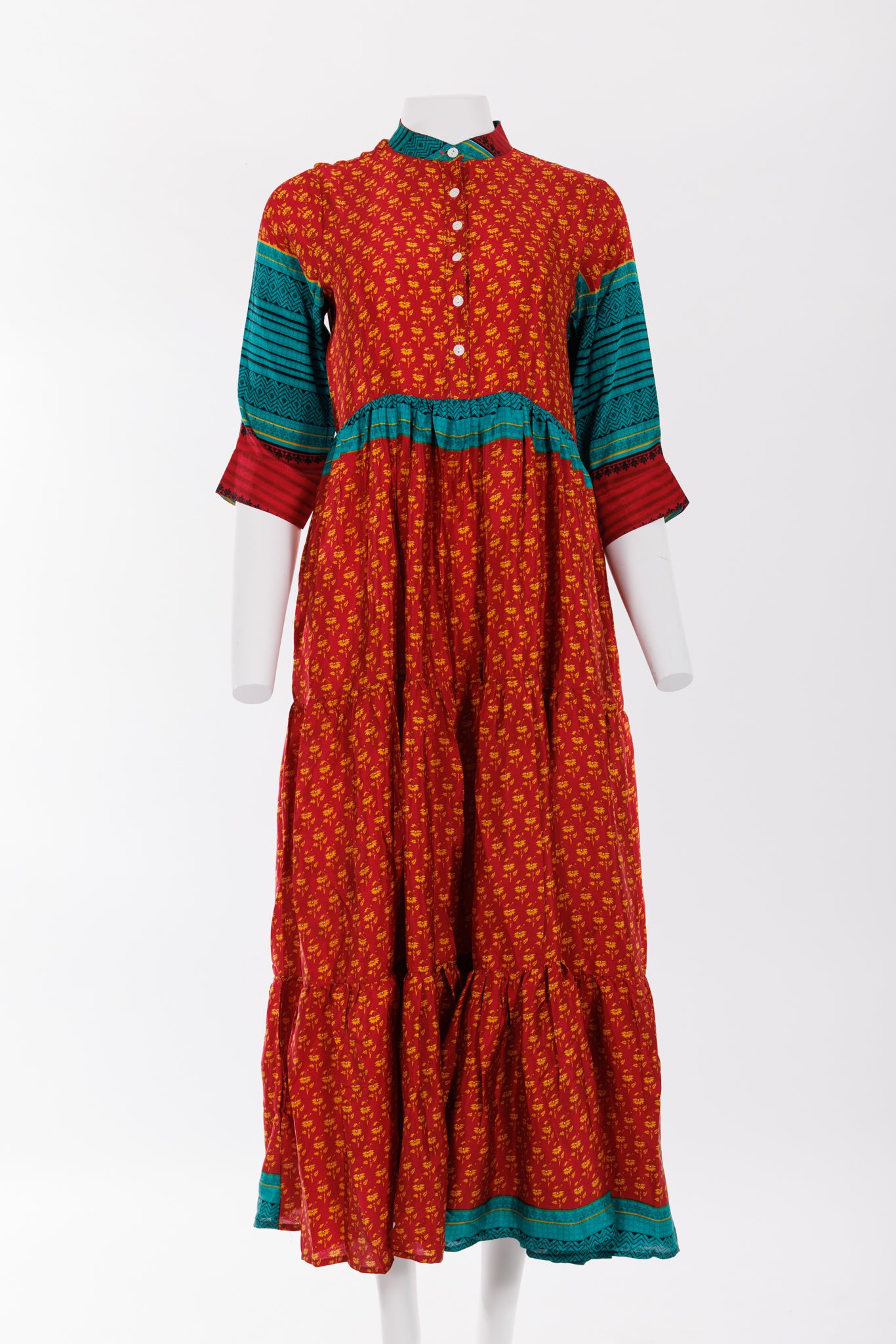 Prairie dress is made from a beautiful up-cycled vintage sari, she is super versatile and with year round appeal, she is a beautiful full length prairie style dress with a buttoned front and a tiered skirt. Their is 5 Buttons for front opening, she has a full skirt with three tiers and 3/4 length sleeves plus a optional belt and two deep internal side pockets.