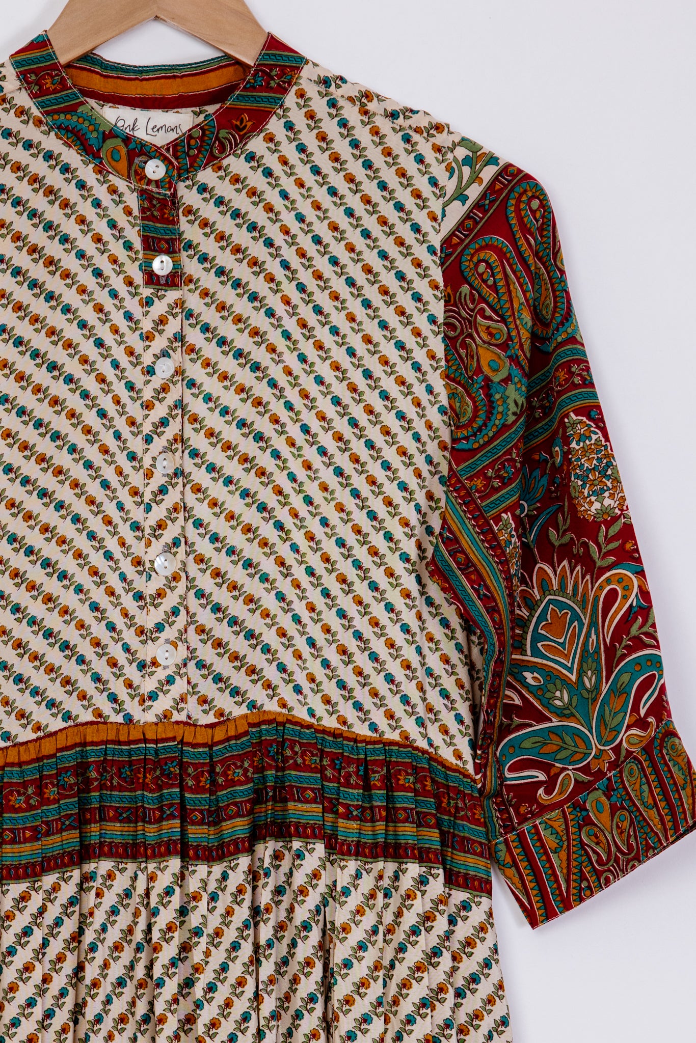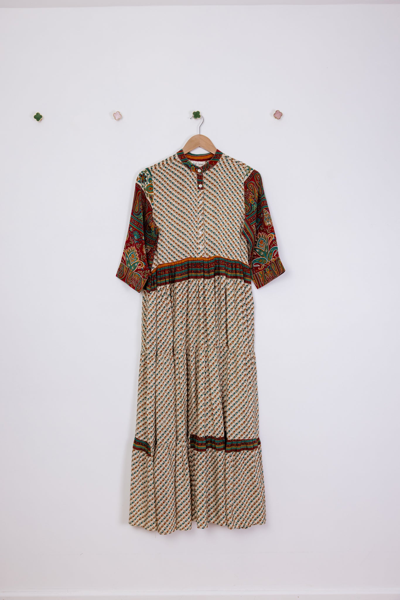 Prairie dress is made from a beautiful up-cycled vintage sari, she is super versatile and with year round appeal, she is a beautiful full length prairie style dress with a buttoned front and a tiered skirt. Their is 5 Buttons for front opening, she has a full skirt with three tiers and 3/4 length sleeves plus a optional belt and two deep internal side pockets.