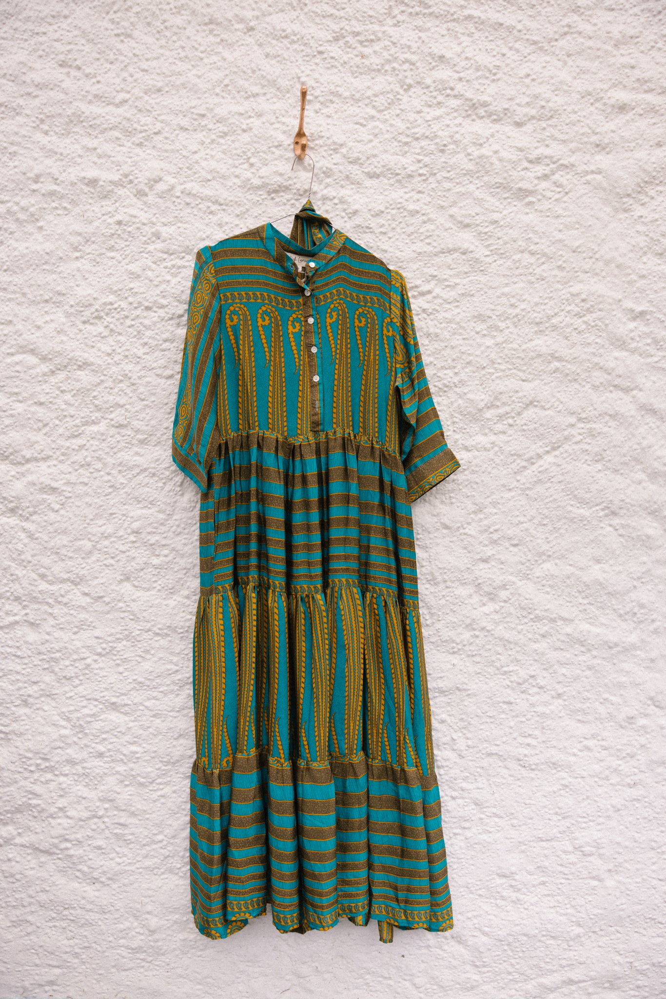 Prairie dress is made from a beautiful up-cycled vintage sari, she is super versatile and with year round appeal, she is a beautiful full length prairie style dress with a buttoned front and a tiered skirt. Their is 5 Buttons for front opening, she has a full skirt with three tiers and 3/4 length sleeves plus a optional belt and two deep internal side pockets.