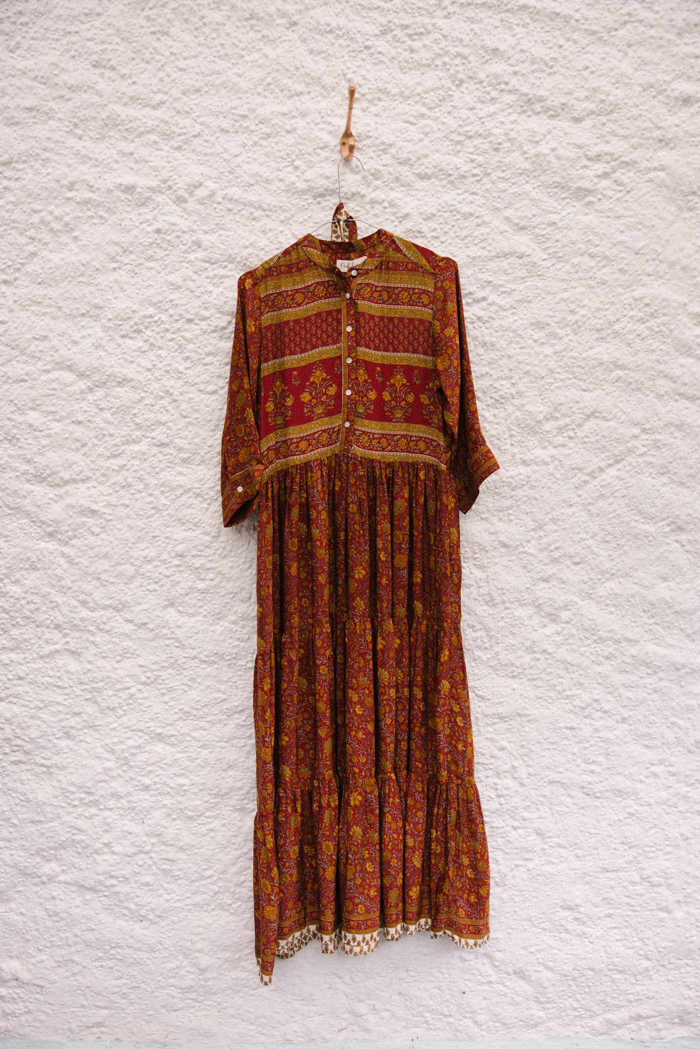 Prairie dress is made from a beautiful up-cycled vintage sari, she is super versatile and with year round appeal, she is a beautiful full length prairie style dress with a buttoned front and a tiered skirt. Their is 5 Buttons for front opening, she has a full skirt with three tiers and 3/4 length sleeves plus a optional belt and two deep internal side pockets.