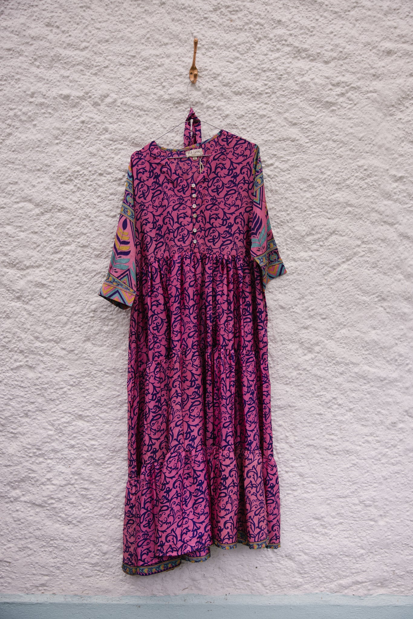 Prairie dress is made from a beautiful up-cycled vintage sari, she is super versatile with year round appeal, she is a beautiful full length prairie style dress with a V neck line with a buttoned front and a tiered skirt. Their is buttons for front opening, she has a full skirt with three tiers and 3/4 length sleeves and two deep internal side pockets.