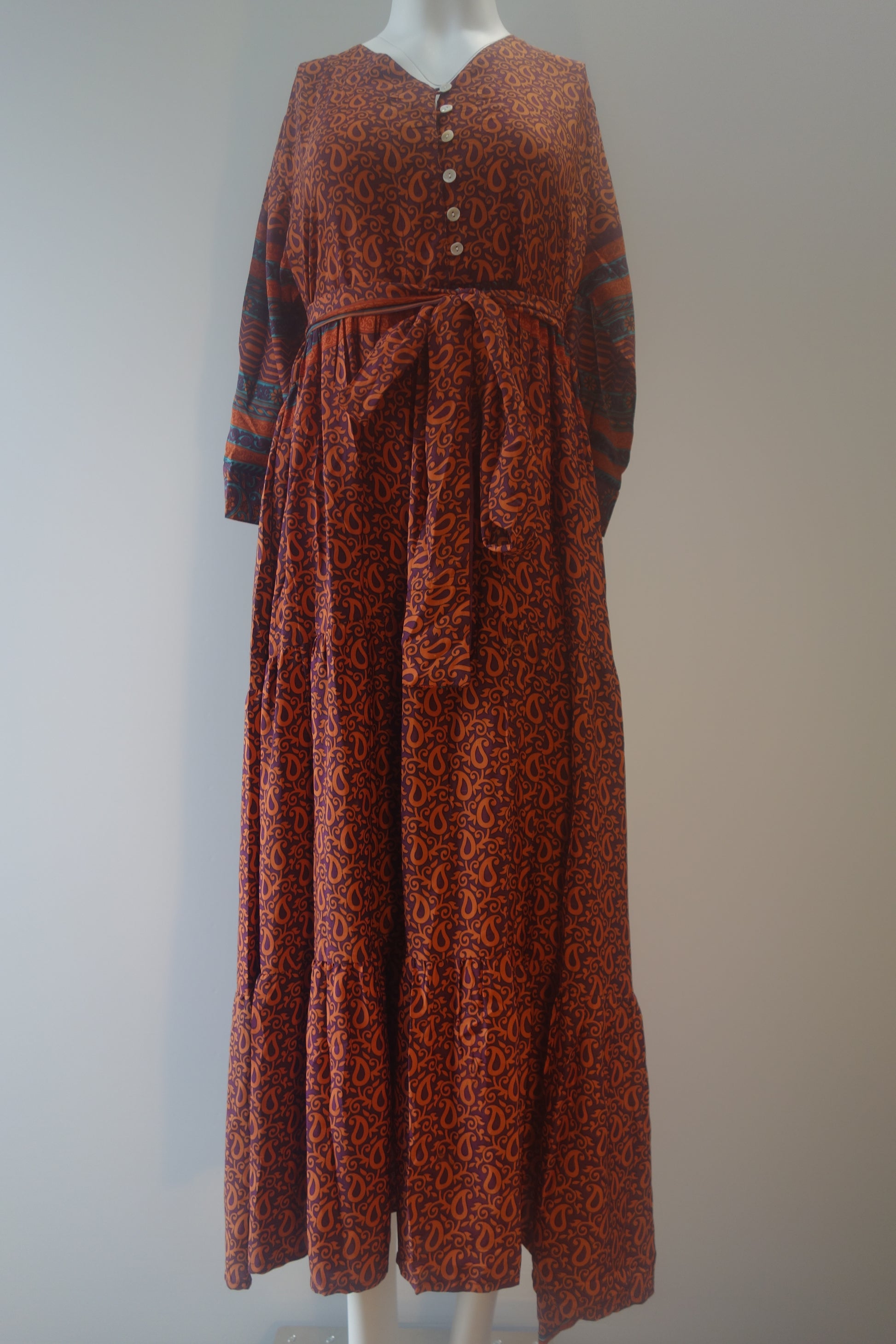 Prairie dress is made from a beautiful up-cycled vintage sari, she is super versatile with year round appeal, she is a beautiful full length prairie style dress with a V neck line with a buttoned front and a tiered skirt. Their is buttons for front opening, she has a full skirt with three tiers and 3/4 length sleeves and two deep internal side pockets.