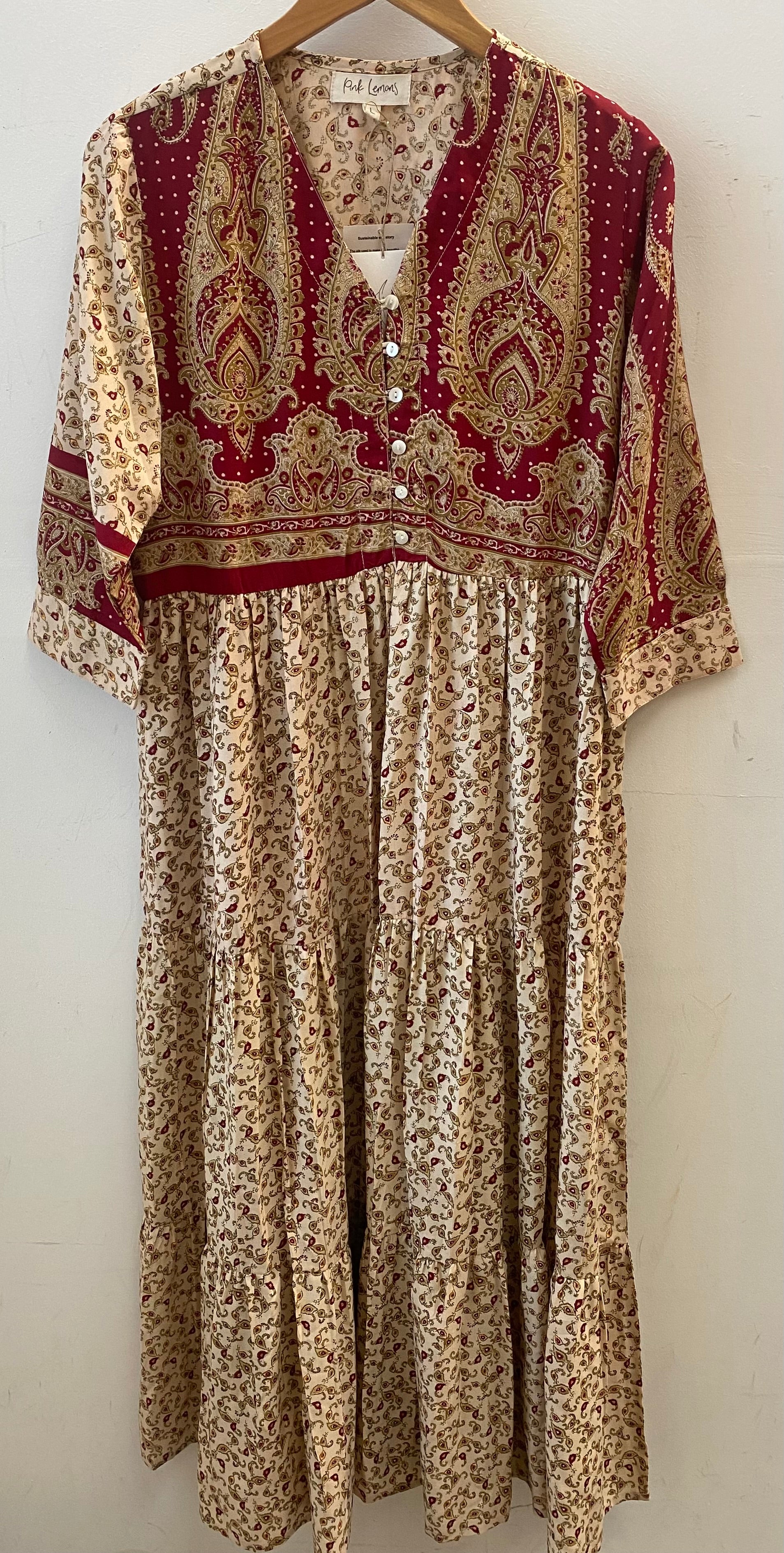 Prairie dress is made from a beautiful up-cycled vintage sari, she is super versatile with year round appeal, she is a beautiful full length prairie style dress with a V neck line with a buttoned front and a tiered skirt. Their is buttons for front opening, she has a full skirt with three tiers and 3/4 length sleeves and two deep internal side pockets.