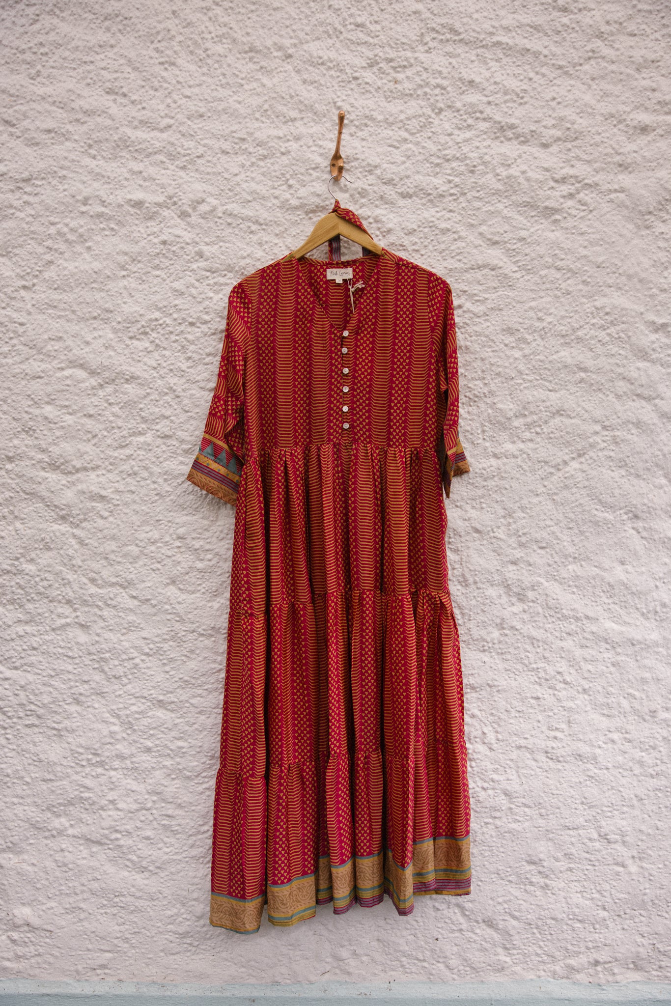 Prairie dress is made from a beautiful up-cycled vintage sari, she is super versatile with year round appeal, she is a beautiful full length prairie style dress with a V neck line with a buttoned front and a tiered skirt. Their is buttons for front opening, she has a full skirt with three tiers and 3/4 length sleeves and two deep internal side pockets.