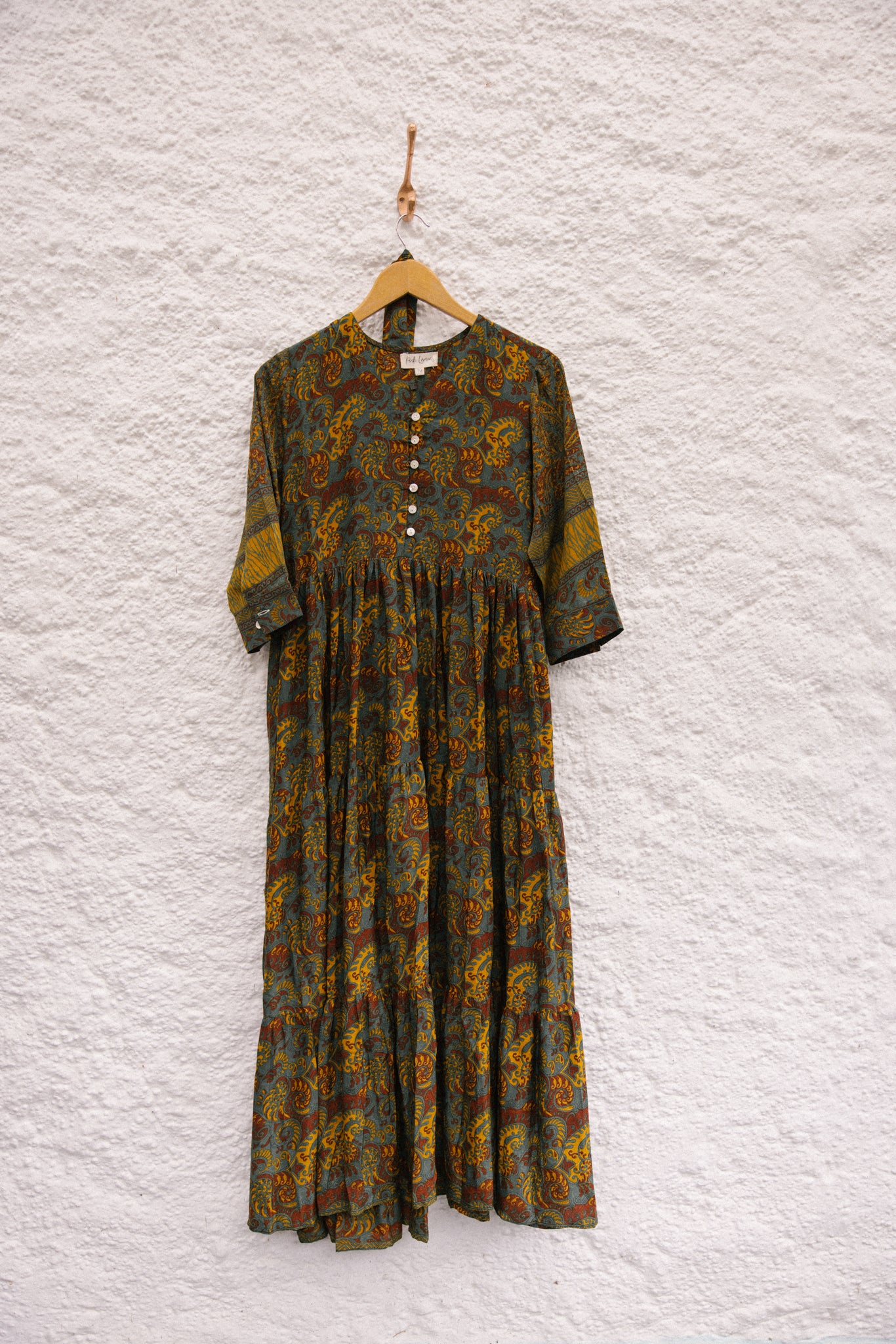 Prairie dress is made from a beautiful up-cycled vintage sari, she is super versatile with year round appeal, she is a beautiful full length prairie style dress with a V neck line with a buttoned front and a tiered skirt. Their is buttons for front opening, she has a full skirt with three tiers and 3/4 length sleeves and two deep internal side pockets.