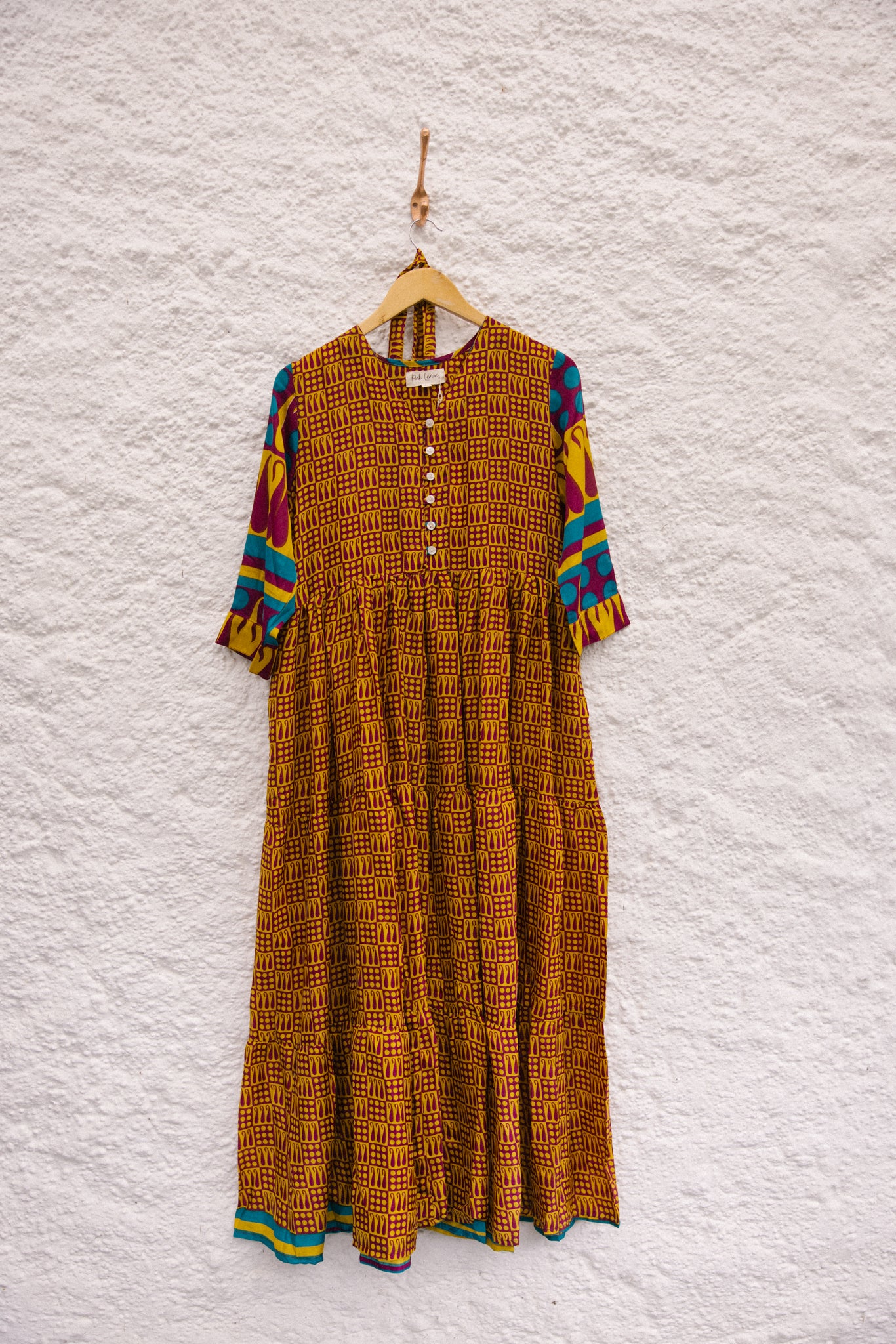 Prairie dress is made from a beautiful up-cycled vintage sari, she is super versatile with year round appeal, she is a beautiful full length prairie style dress with a V neck line with a buttoned front and a tiered skirt. Their is buttons for front opening, she has a full skirt with three tiers and 3/4 length sleeves and two deep internal side pockets.