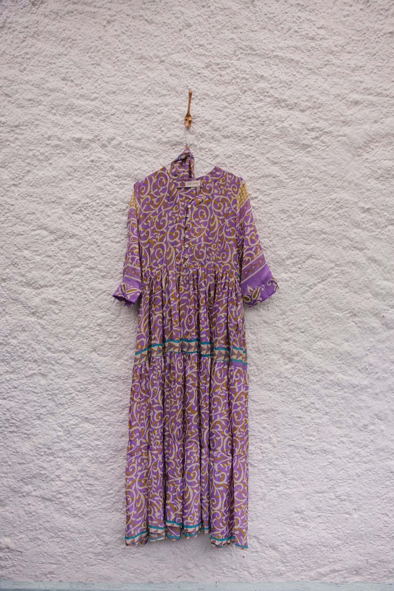 Prairie dress is made from a beautiful up-cycled vintage sari, she is super versatile with year round appeal, she is a beautiful full length prairie style dress with a V neck line with a buttoned front and a tiered skirt. Their is buttons for front opening, she has a full skirt with three tiers and 3/4 length sleeves and two deep internal side pockets.