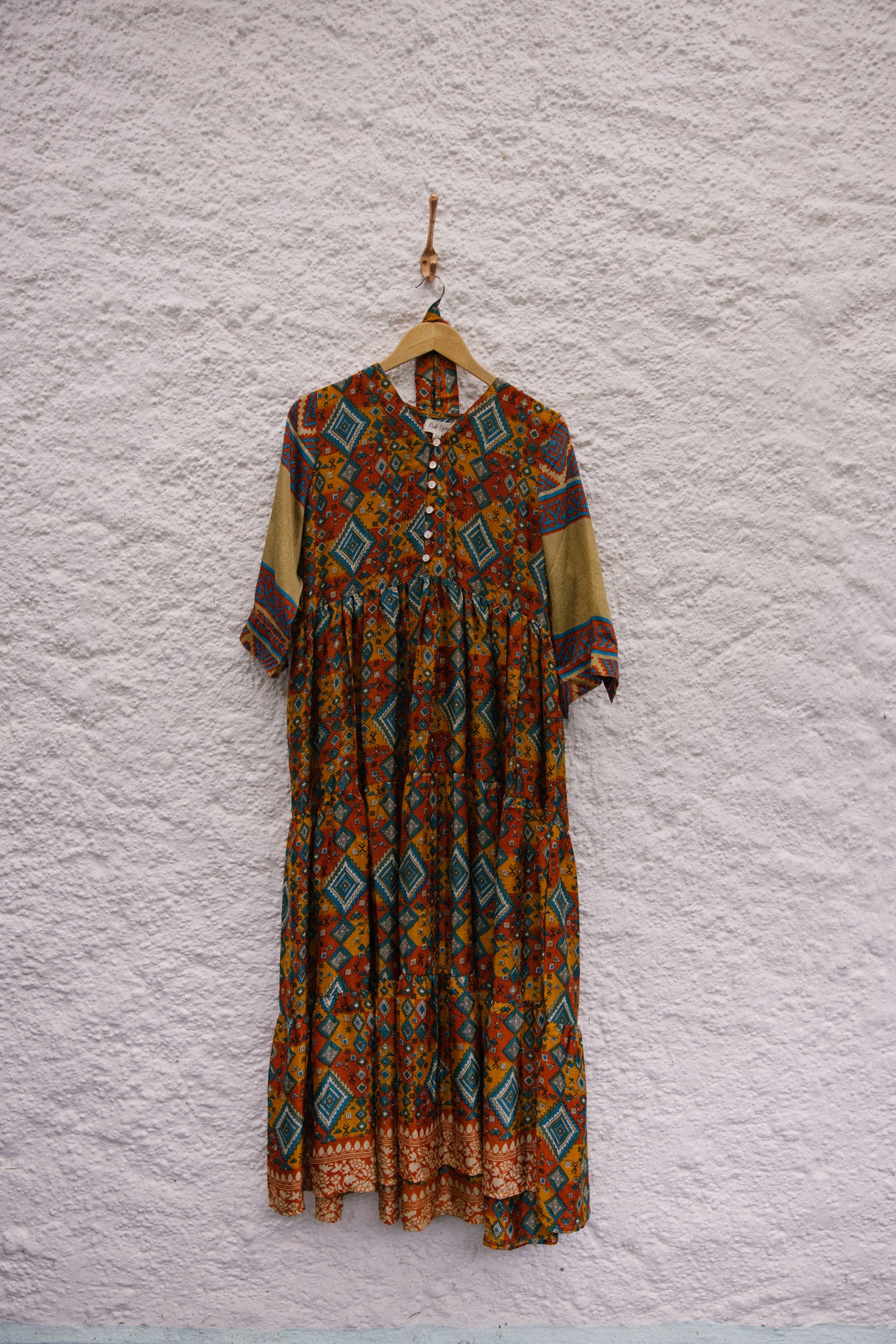 Prairie dress is made from a beautiful up-cycled vintage sari, she is super versatile with year round appeal, she is a beautiful full length prairie style dress with a V neck line with a buttoned front and a tiered skirt. Their is buttons for front opening, she has a full skirt with three tiers and 3/4 length sleeves and two deep internal side pockets.