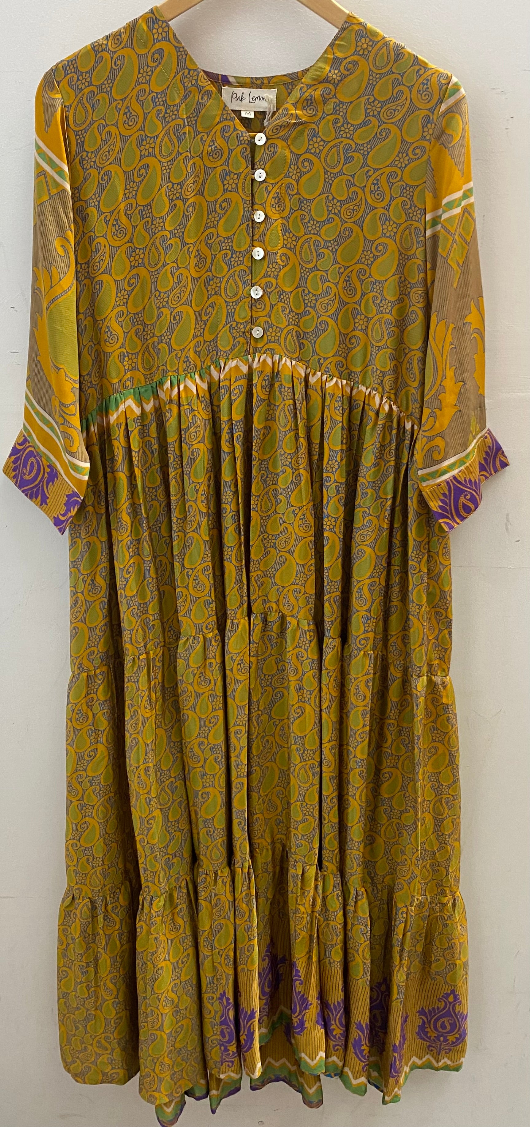 Prairie dress is made from a beautiful up-cycled vintage sari, she is super versatile with year round appeal, she is a beautiful full length prairie style dress with a V neck line with a buttoned front and a tiered skirt. There are buttons for front opening, she has a full skirt with three tiers and 3/4 length sleeves and two deep internal side pockets.