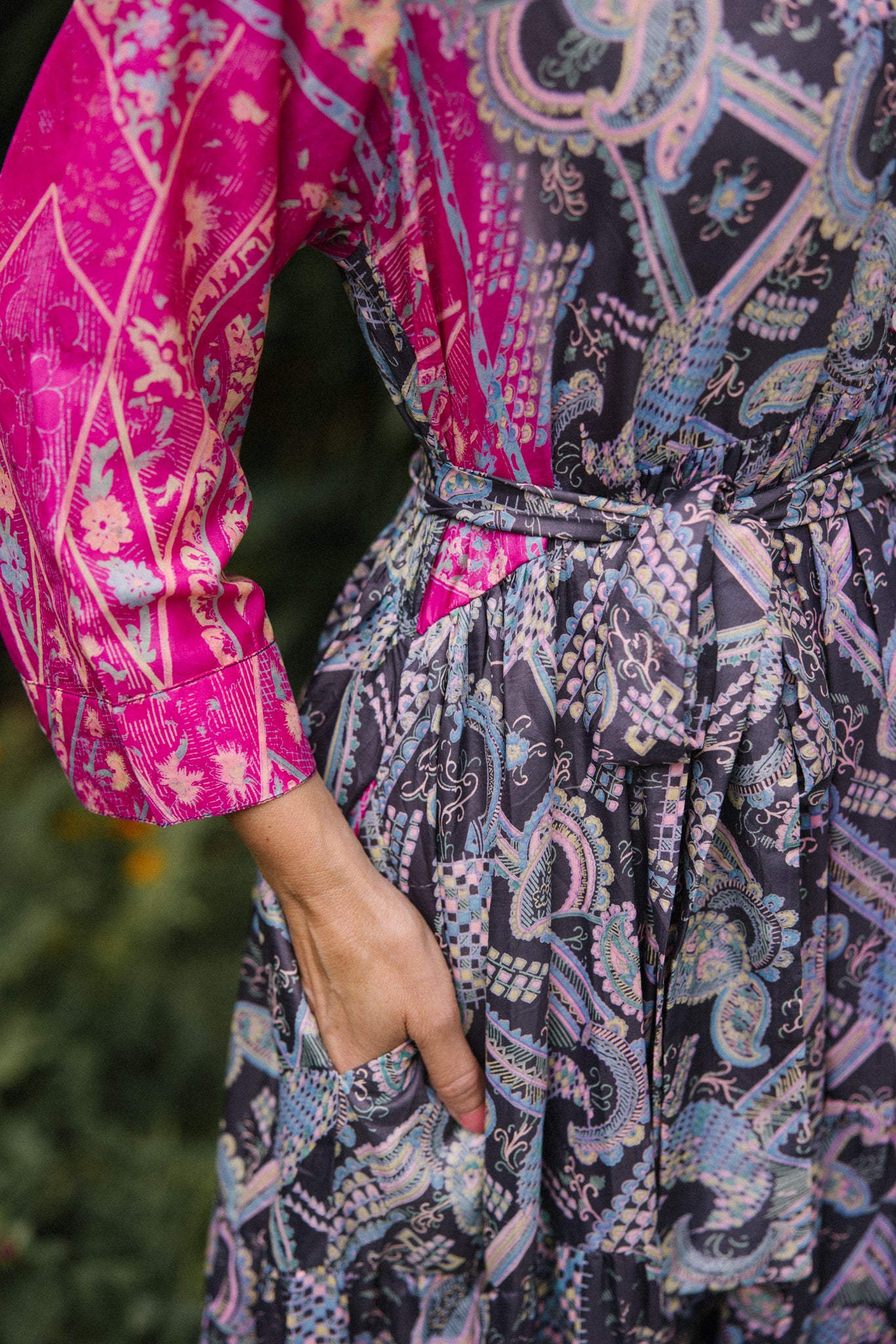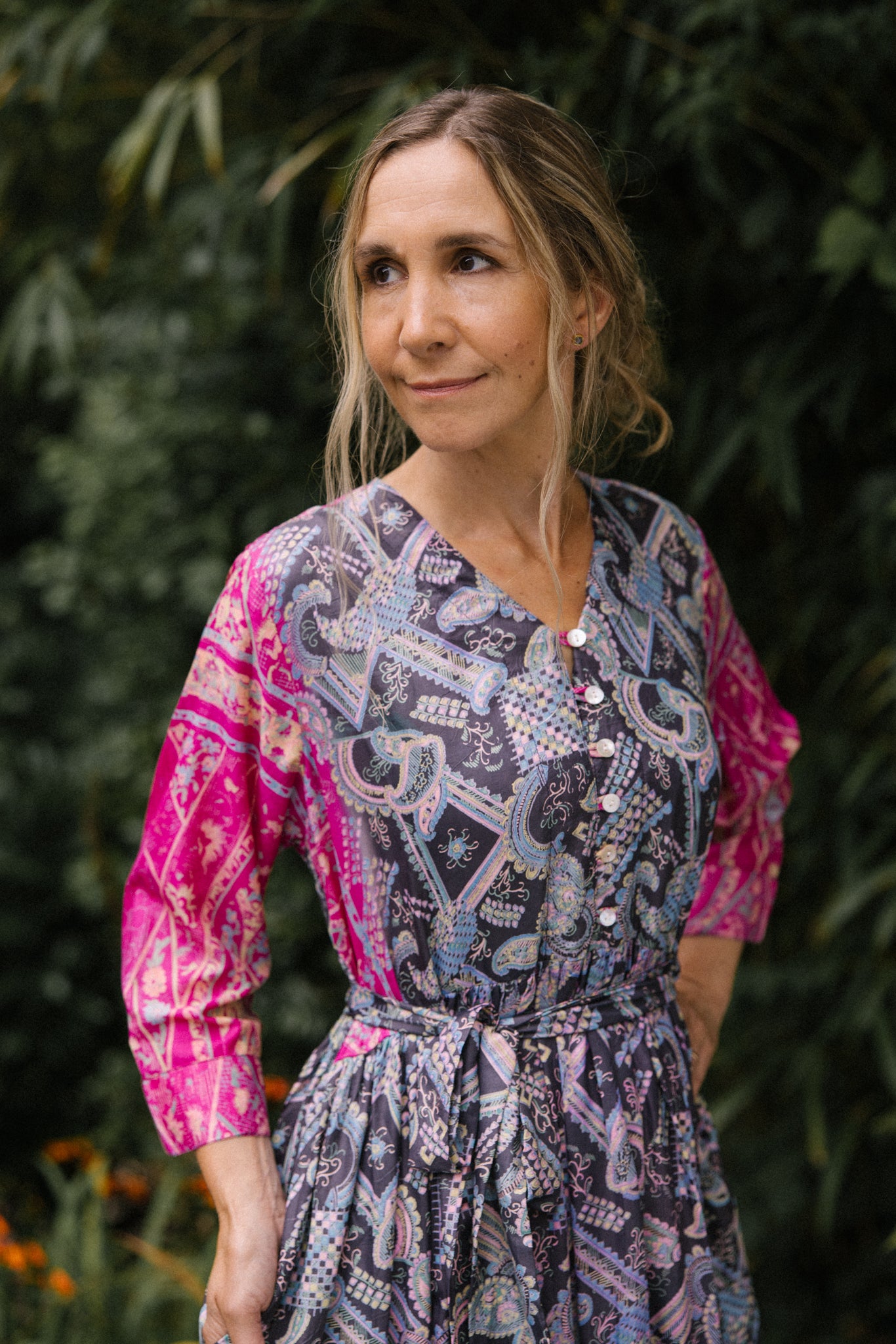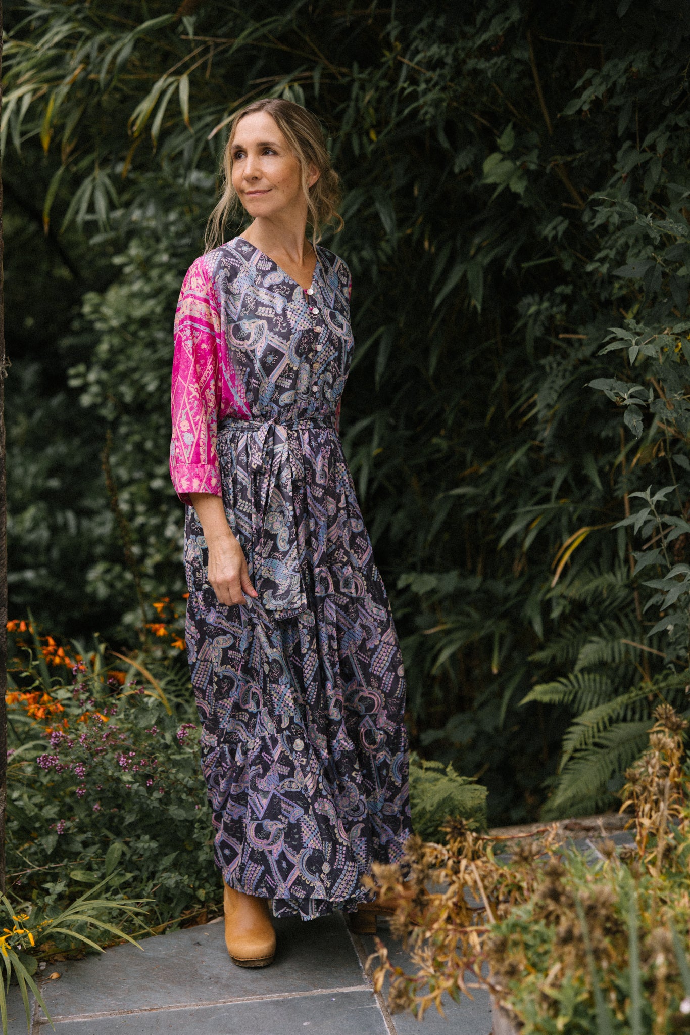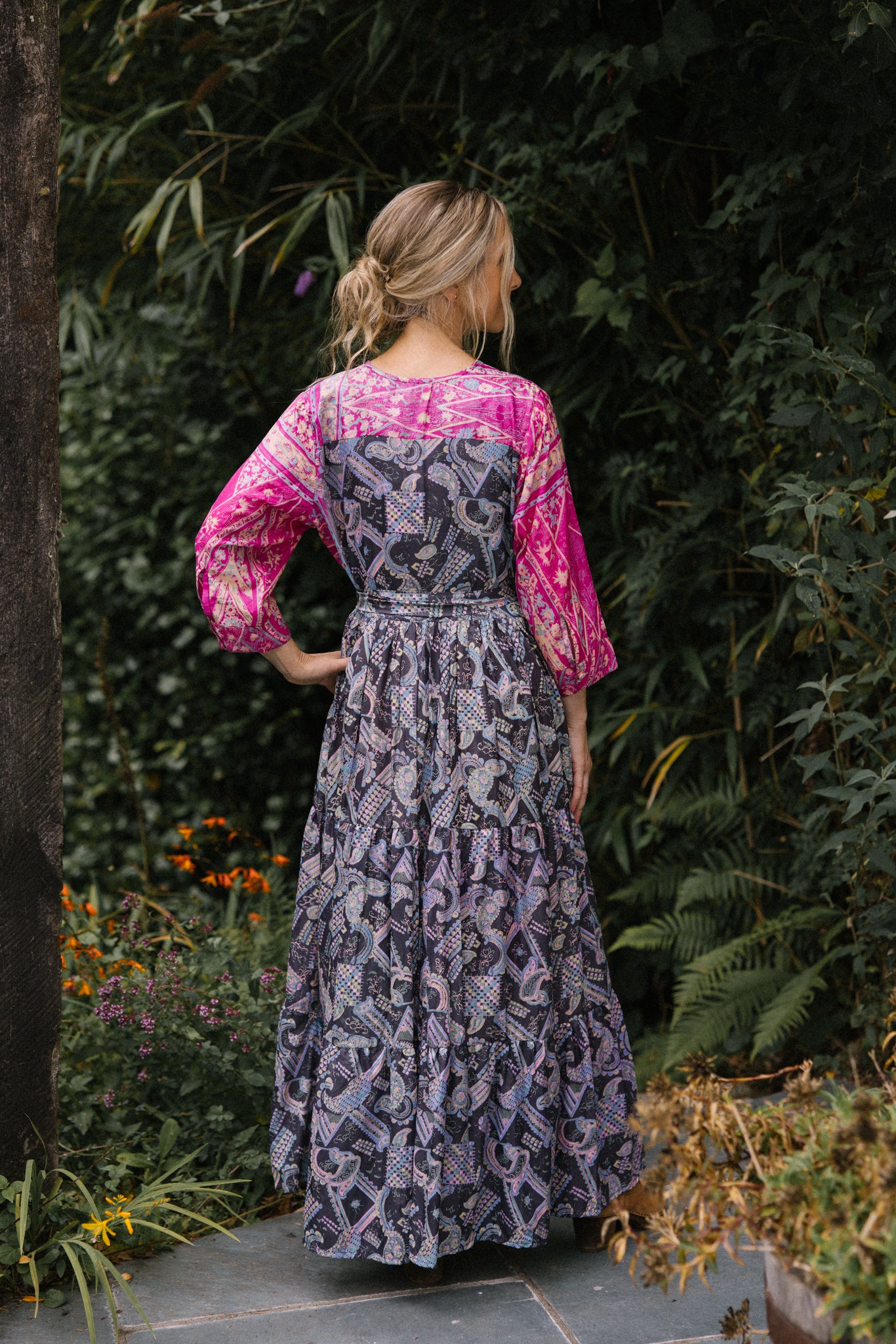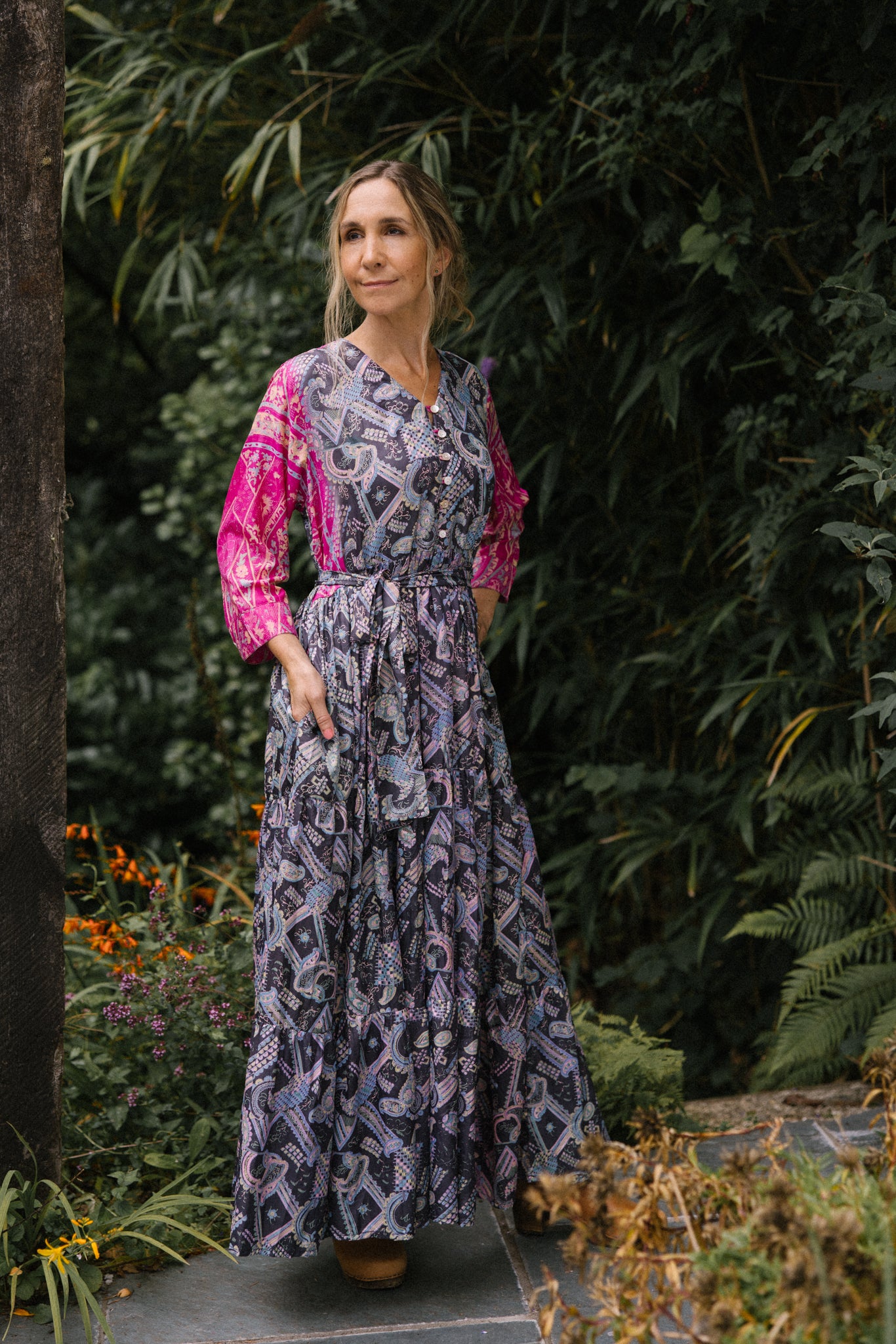Prairie dress is made from a beautiful up-cycled vintage sari, she is super versatile with year round appeal, she is a beautiful full length prairie style dress with a V neck line with a buttoned front and a tiered skirt. Their is buttons for front opening, she has a full skirt with three tiers and 3/4 length sleeves and two deep internal side pockets.