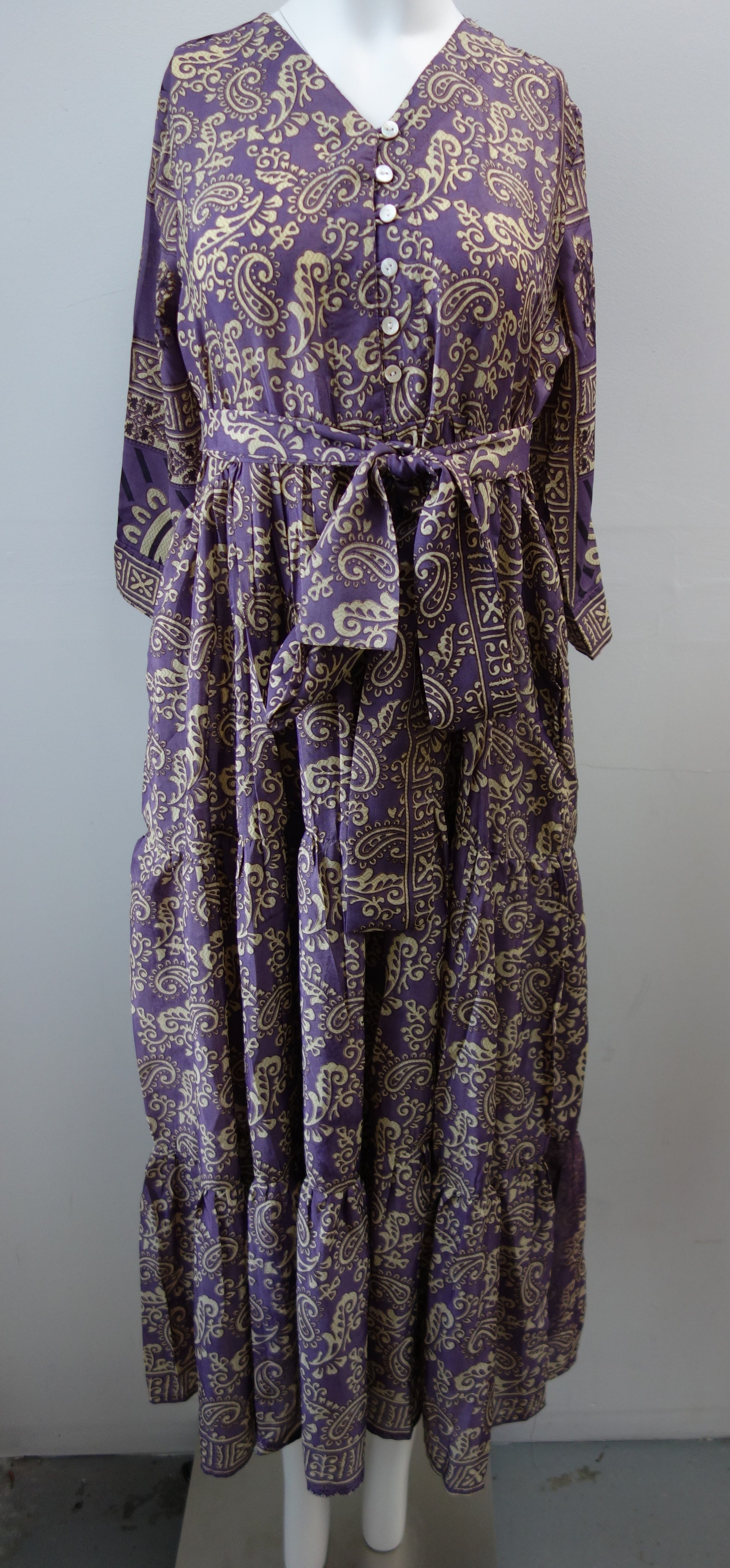 Prairie dress is made from a beautiful up-cycled vintage sari, she is super versatile with year round appeal, she is a beautiful full length prairie style dress with a V neck line with a buttoned front and a tiered skirt. There are buttons for front opening, she has a full skirt with three tiers and 3/4 length sleeves and two deep internal side pockets.