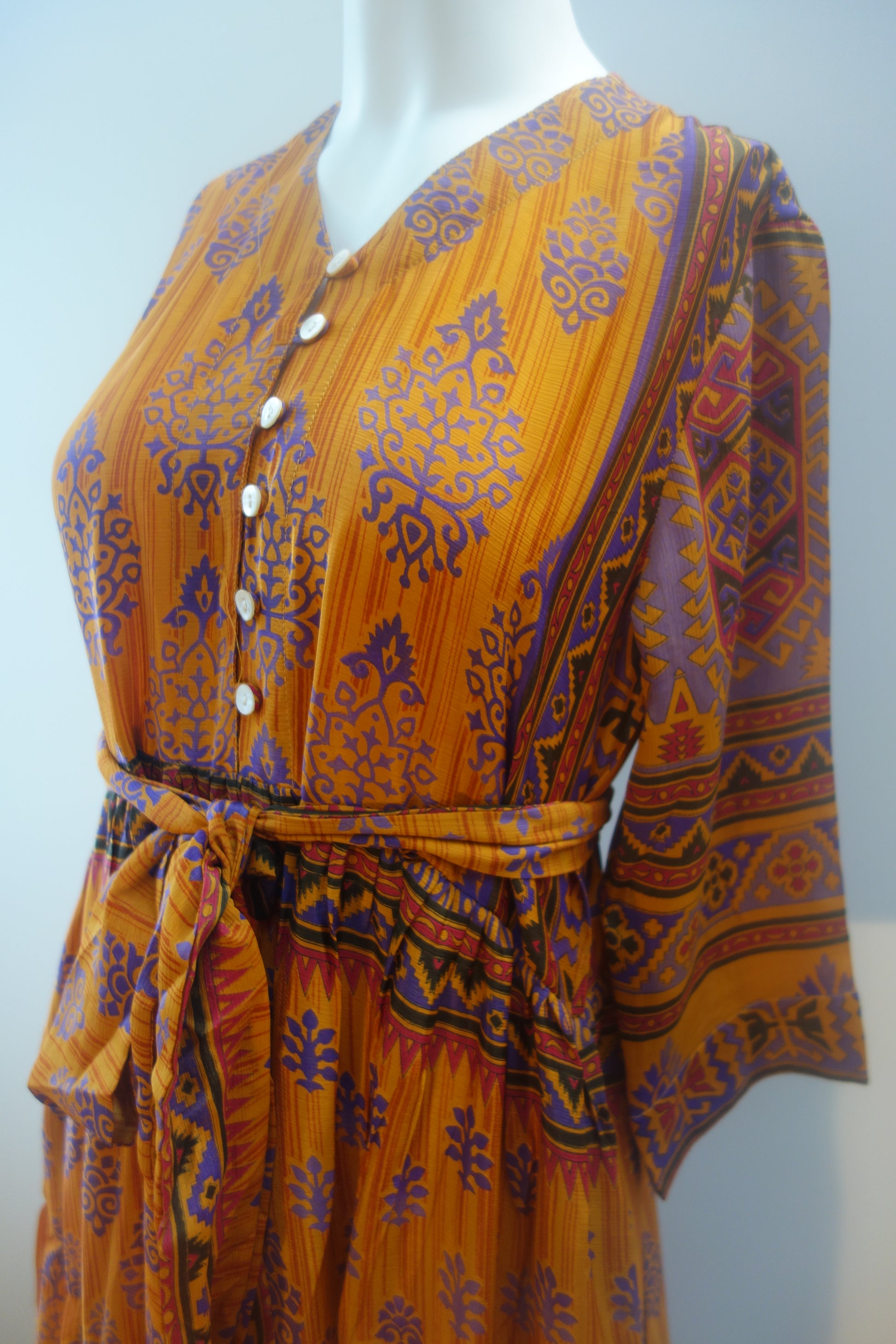Prairie dress is made from a beautiful up-cycled vintage sari, she is super versatile with year round appeal, she is a beautiful full length prairie style dress with a V neck line with a buttoned front and a tiered skirt. There are buttons for front opening, she has a full skirt with three tiers and 3/4 length sleeves and two deep internal side pockets.