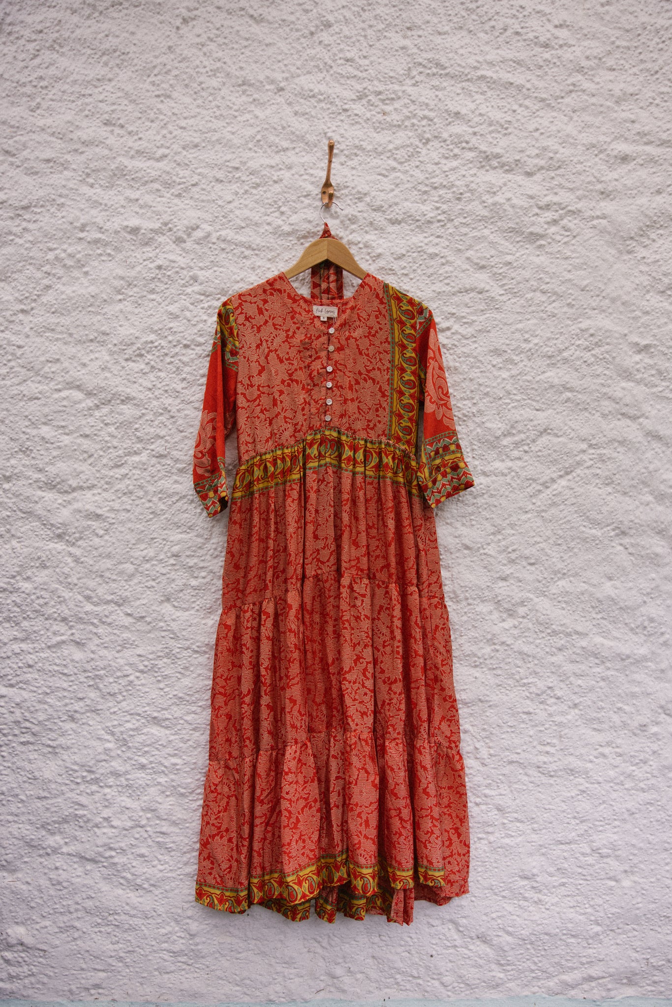 Prairie dress is made from a beautiful up-cycled vintage sari, she is super versatile with year round appeal, she is a beautiful full length prairie style dress with a V neck line with a buttoned front and a tiered skirt. Their is buttons for front opening, she has a full skirt with three tiers and 3/4 length sleeves and two deep internal side pockets.