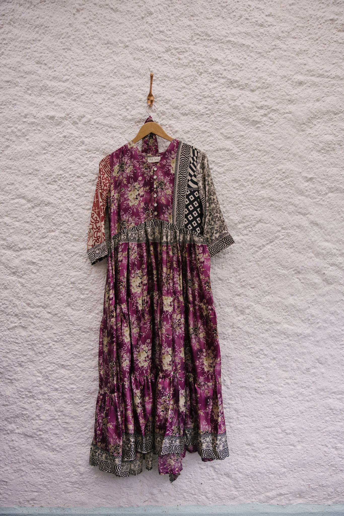 Prairie dress is made from a beautiful up-cycled vintage sari, she is super versatile with year round appeal, she is a beautiful full length prairie style dress with a V neck line with a buttoned front and a tiered skirt. Their is buttons for front opening, she has a full skirt with three tiers and 3/4 length sleeves and two deep internal side pockets.
