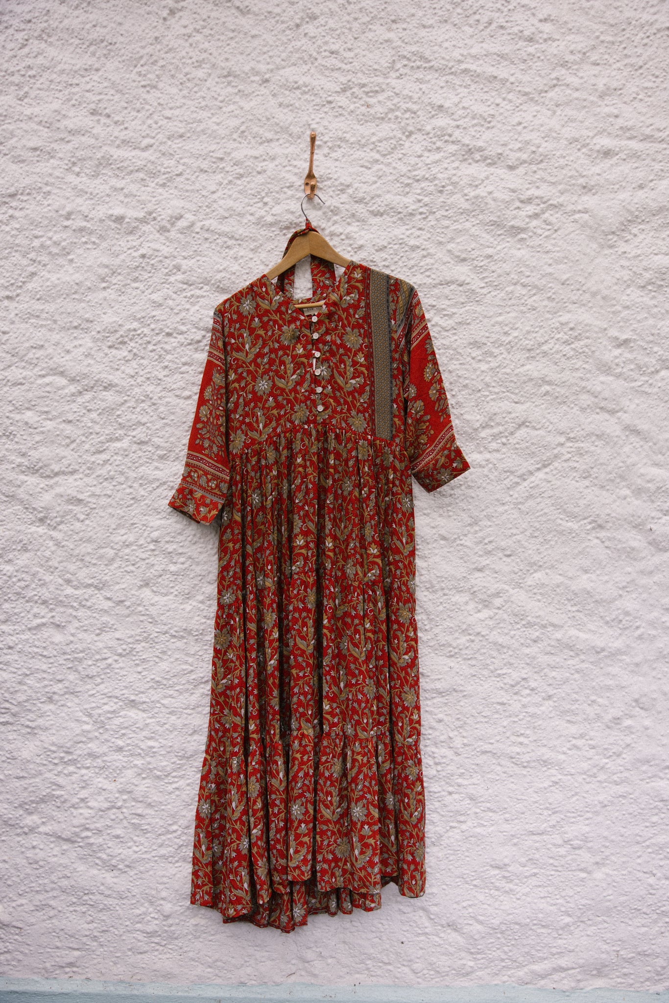 Prairie dress is made from a beautiful up-cycled vintage sari, she is super versatile with year round appeal, she is a beautiful full length prairie style dress with a V neck line with a buttoned front and a tiered skirt. Their is buttons for front opening, she has a full skirt with three tiers and 3/4 length sleeves and two deep internal side pockets.