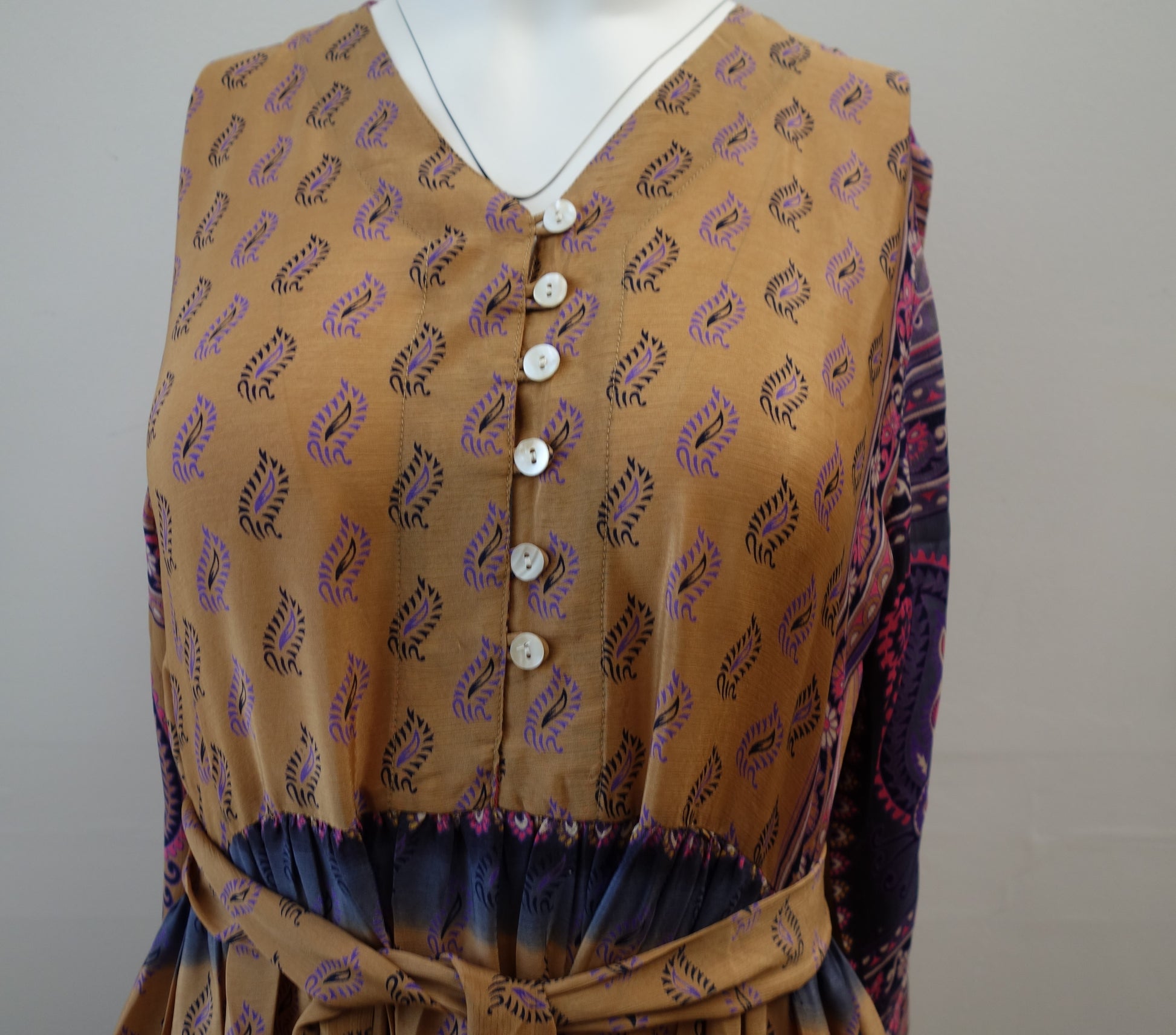 Prairie dress is made from a beautiful up-cycled vintage sari, she is super versatile with year round appeal, she is a beautiful full length prairie style dress with a V neck line with a buttoned front and a tiered skirt. Their is buttons for front opening, she has a full skirt with three tiers and 3/4 length sleeves and two deep internal side pockets.