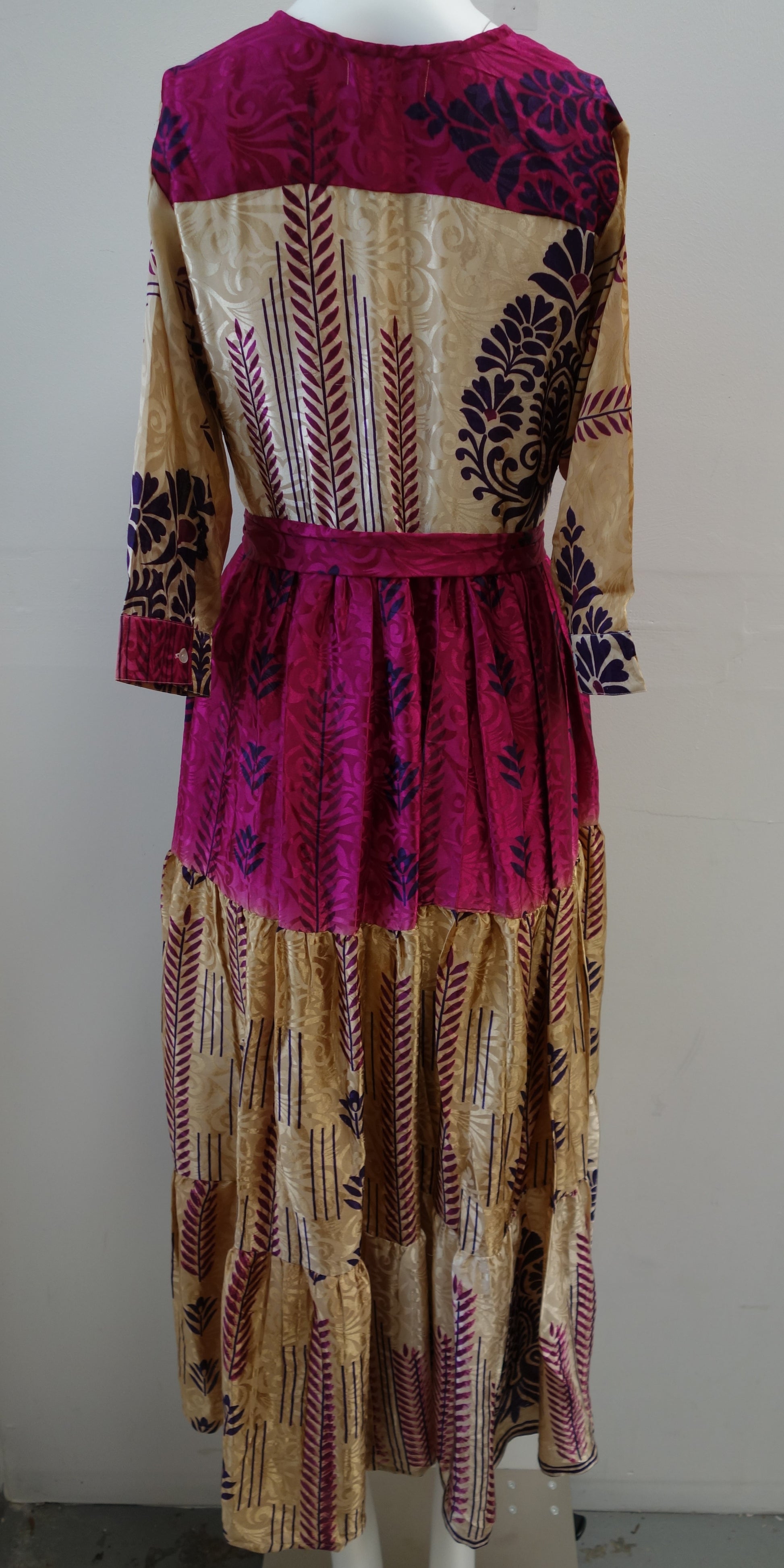 Prairie dress is made from a beautiful up-cycled vintage sari, she is super versatile with year round appeal, she is a beautiful full length prairie style dress with a V neck line with a buttoned front and a tiered skirt. Their is buttons for front opening, she has a full skirt with three tiers and 3/4 length sleeves and two deep internal side pockets.