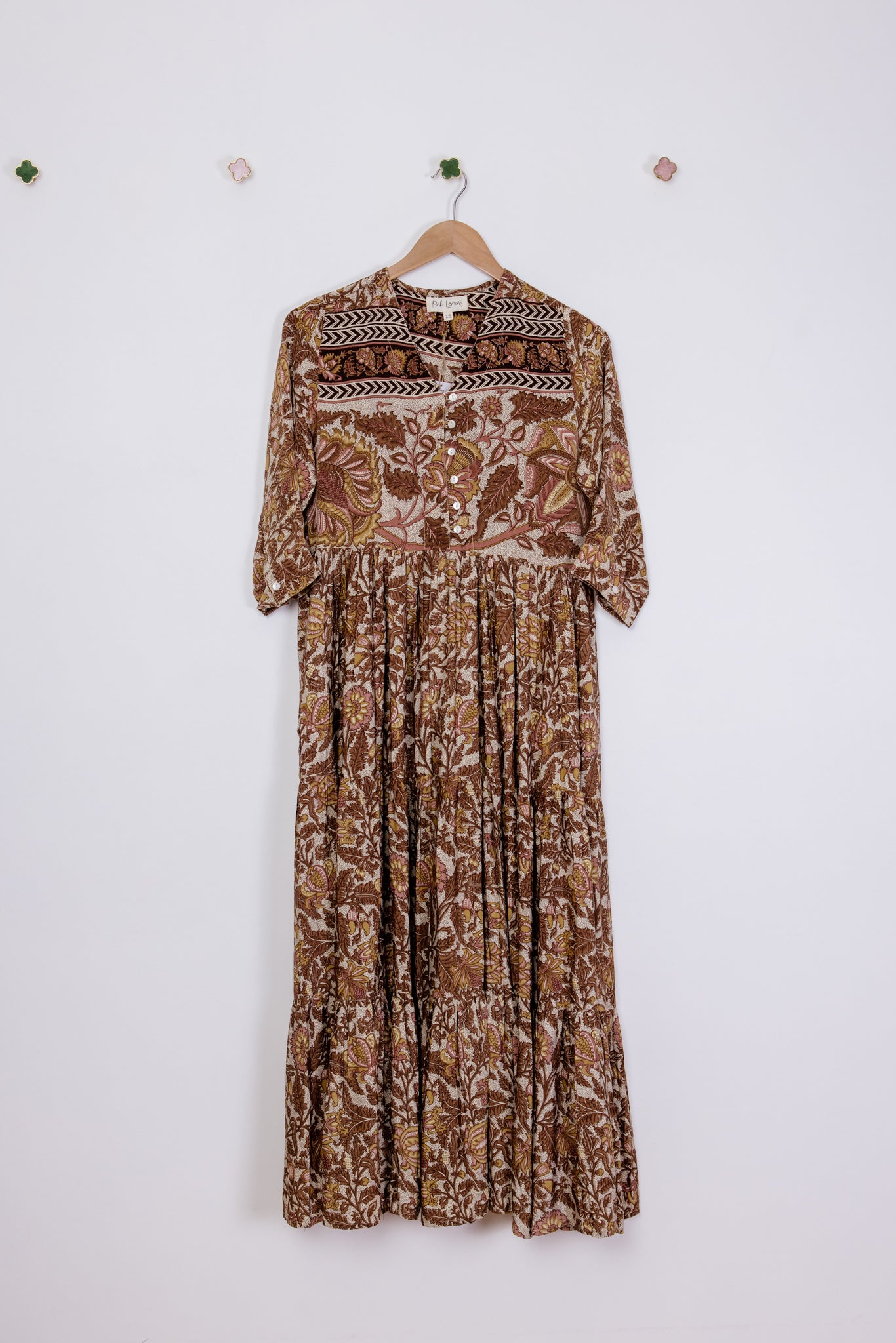 Prairie dress is made from a beautiful up-cycled vintage sari, she is super versatile with year round appeal, she is a beautiful full length prairie style dress with a V neck line with a buttoned front and a tiered skirt. Their is buttons for front opening, she has a full skirt with three tiers and 3/4 length sleeves and two deep internal side pockets.