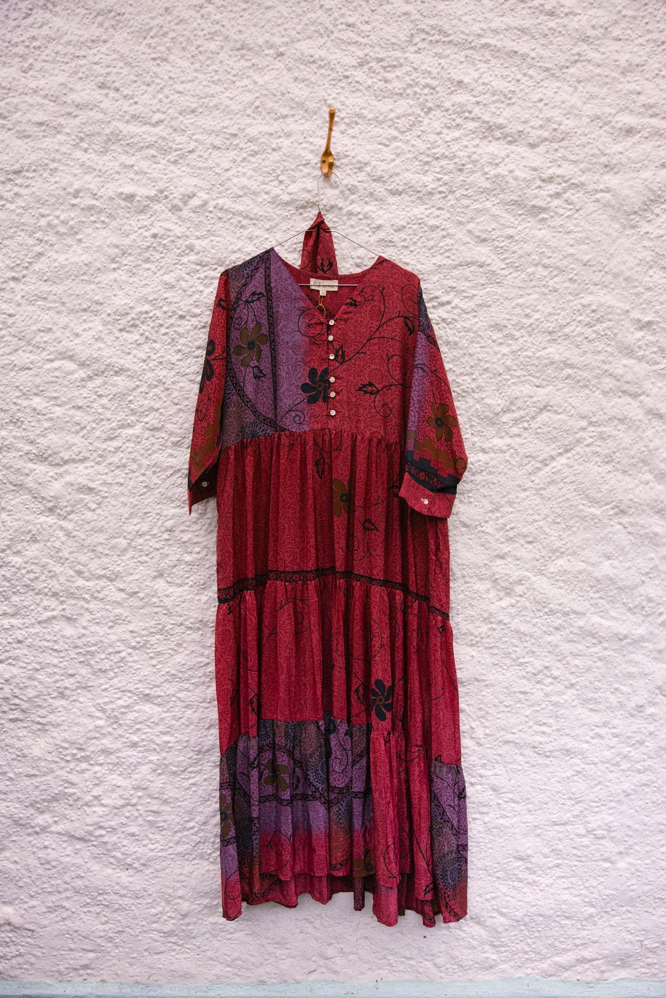 Prairie dress is made from a beautiful up-cycled vintage sari, she is super versatile with year round appeal, she is a beautiful full length prairie style dress with a V neck line with a buttoned front and a tiered skirt. Their is buttons for front opening, she has a full skirt with three tiers and 3/4 length sleeves and two deep internal side pockets.