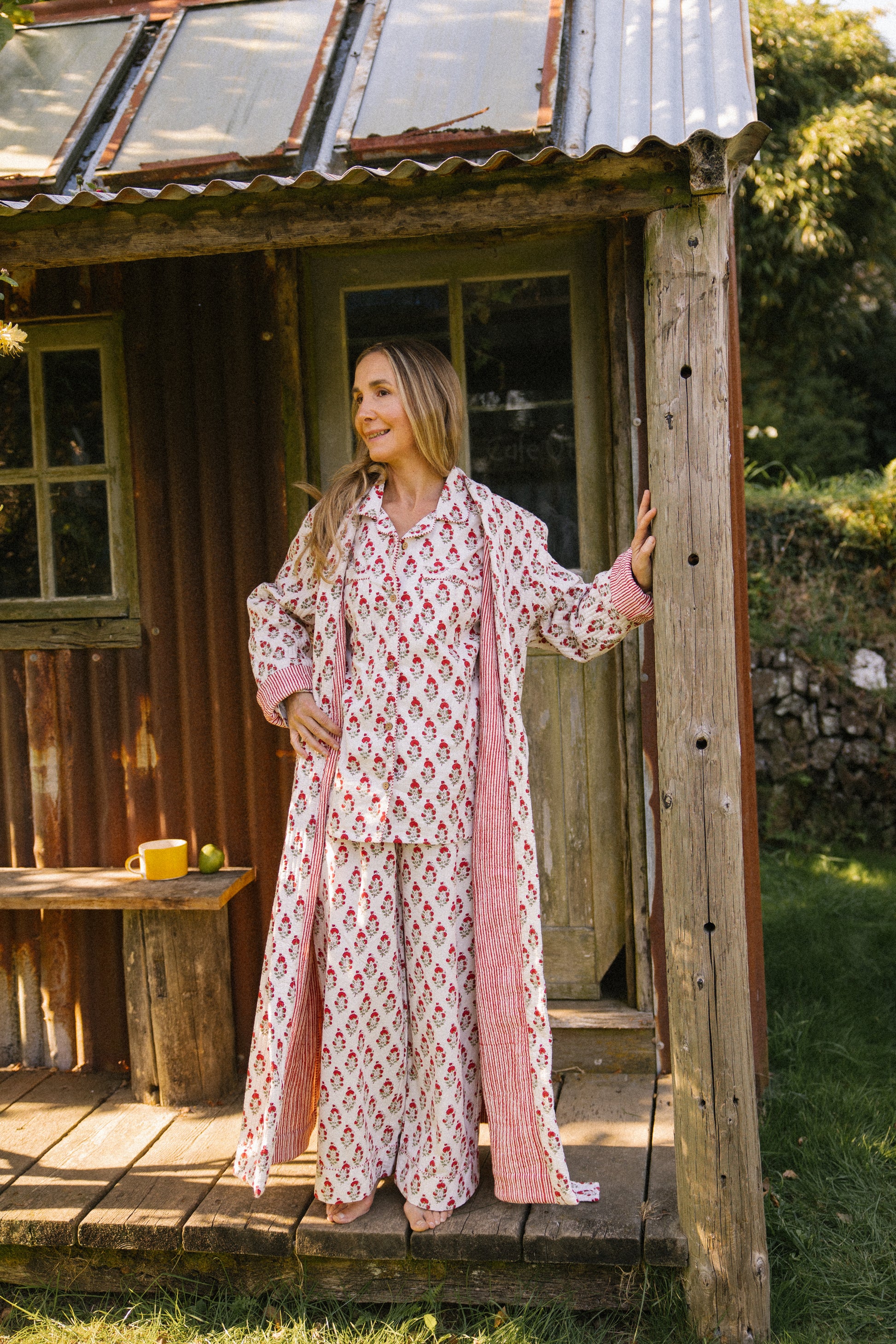 Our pjs are cut from 100% organic cotton, in our beautiful marigold motif on a soft rose base with a crimson red flowers, which is hand screen printed in our fresh floral design.