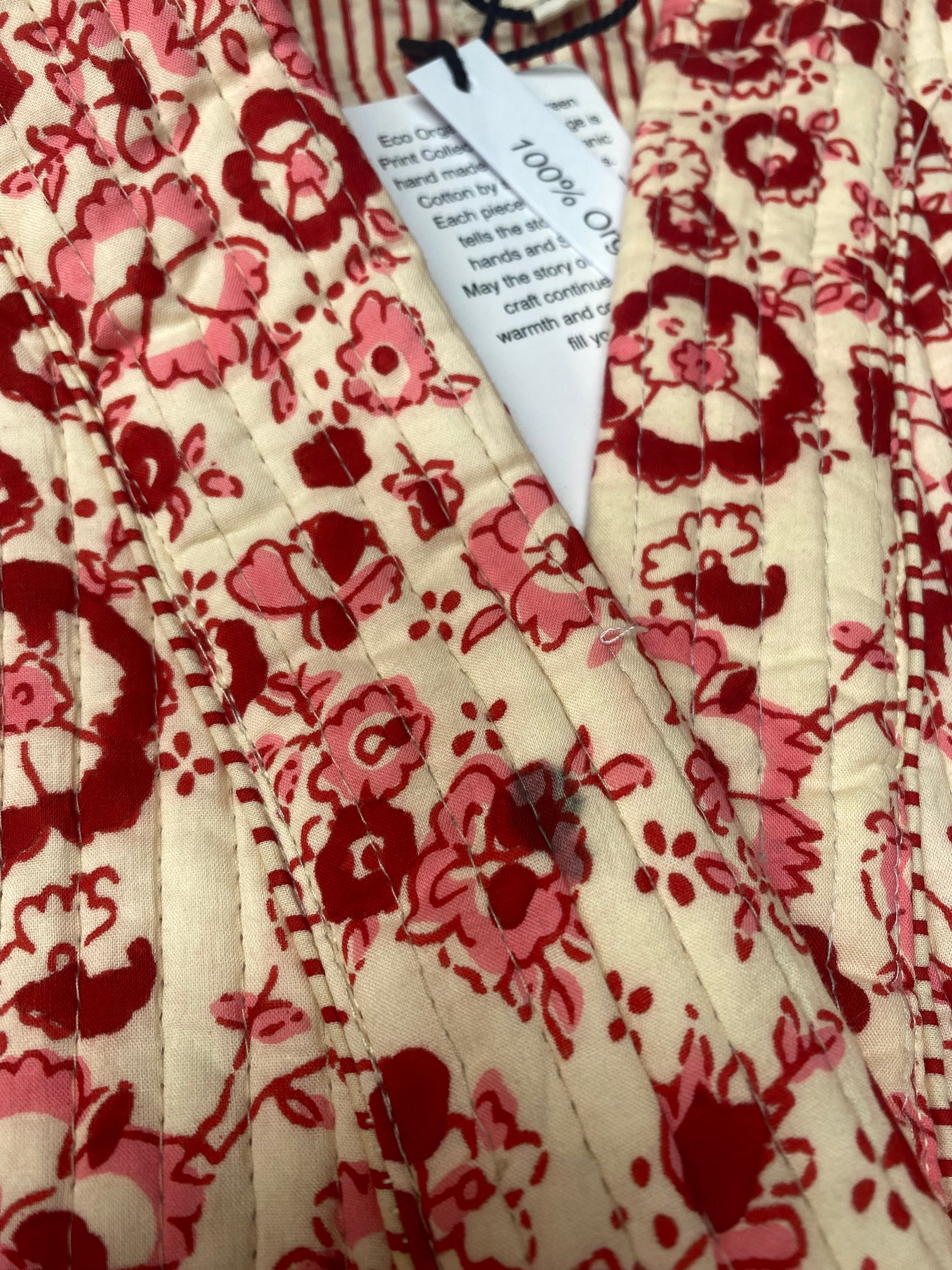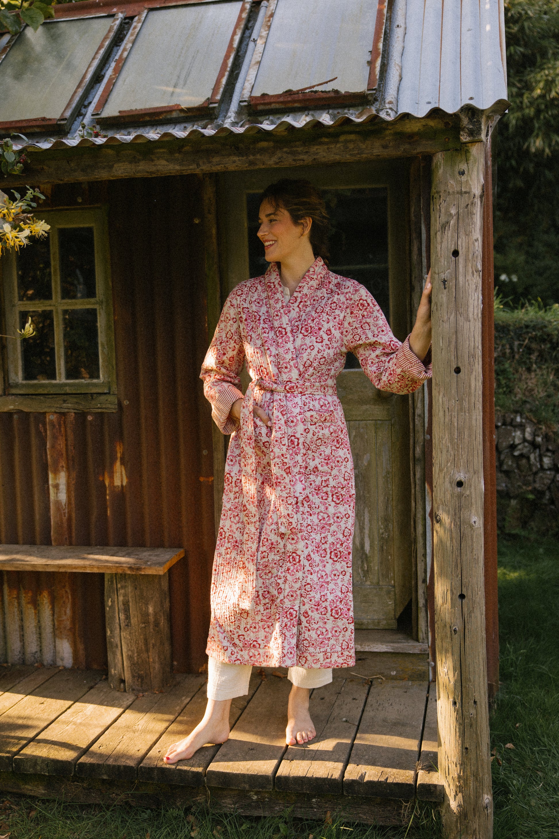 Made in our beautiful original Cherry Blossom print in a soft oatmeal base with soft red and pink tones running through the hand block design, with the inside printed in a stripe design. Its cut from GOTS-certified organic cotton and quilted throughout, so it feels like a warm hug.
