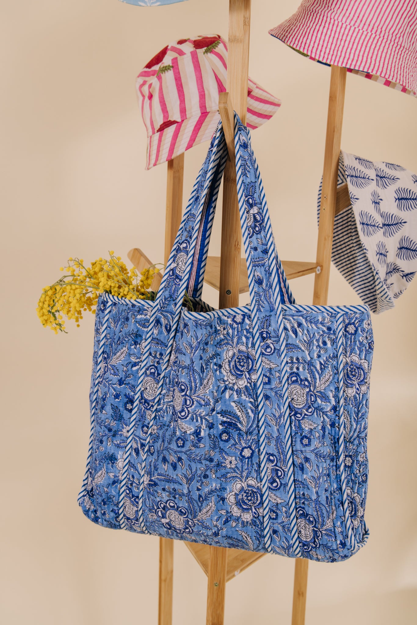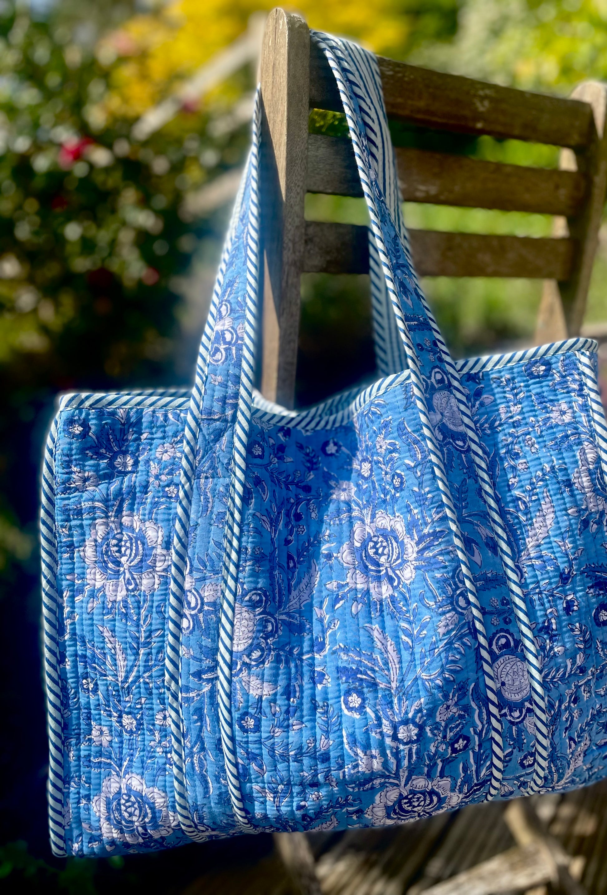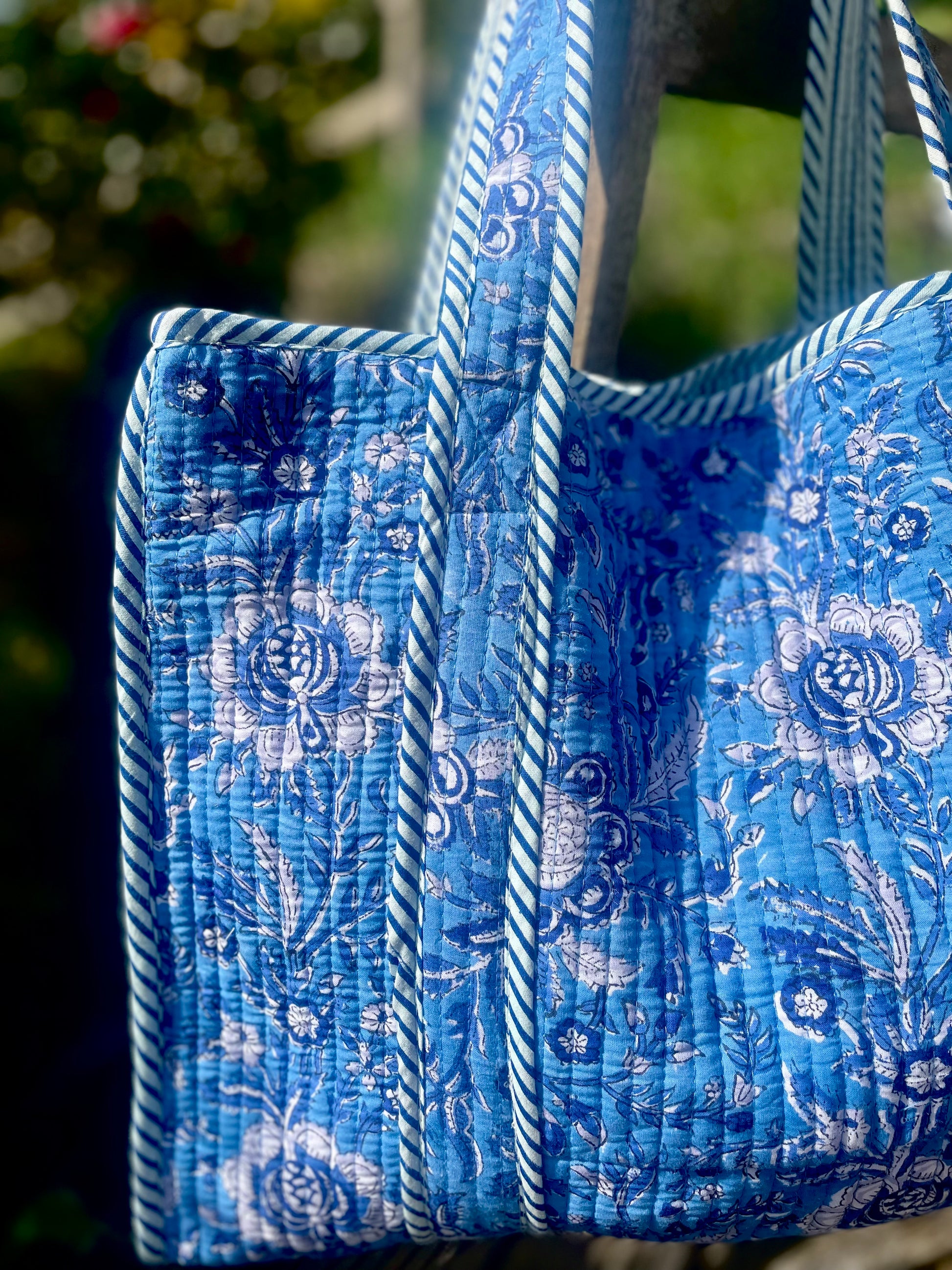 Our beautiful cotton quilted tote bags are hand made by skilled craftsmen and women in small batches. Quilted for durability but lightweight, spacious and foldable, these totes make a ideal travelling bag, trip to the farmers market, yoga bag or holiday bag for the beach. I personally use it as my gym bag and always get such nice comments.
