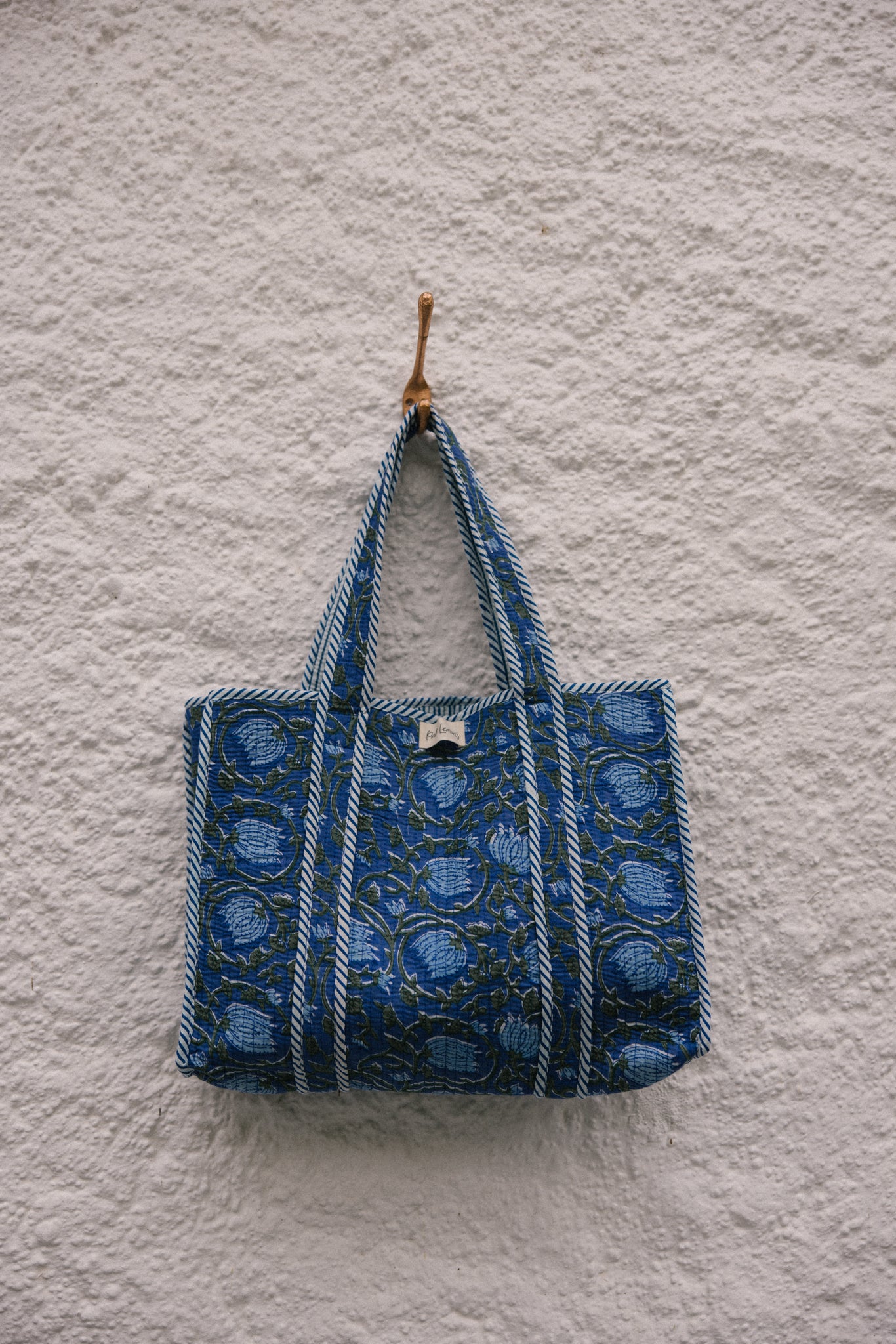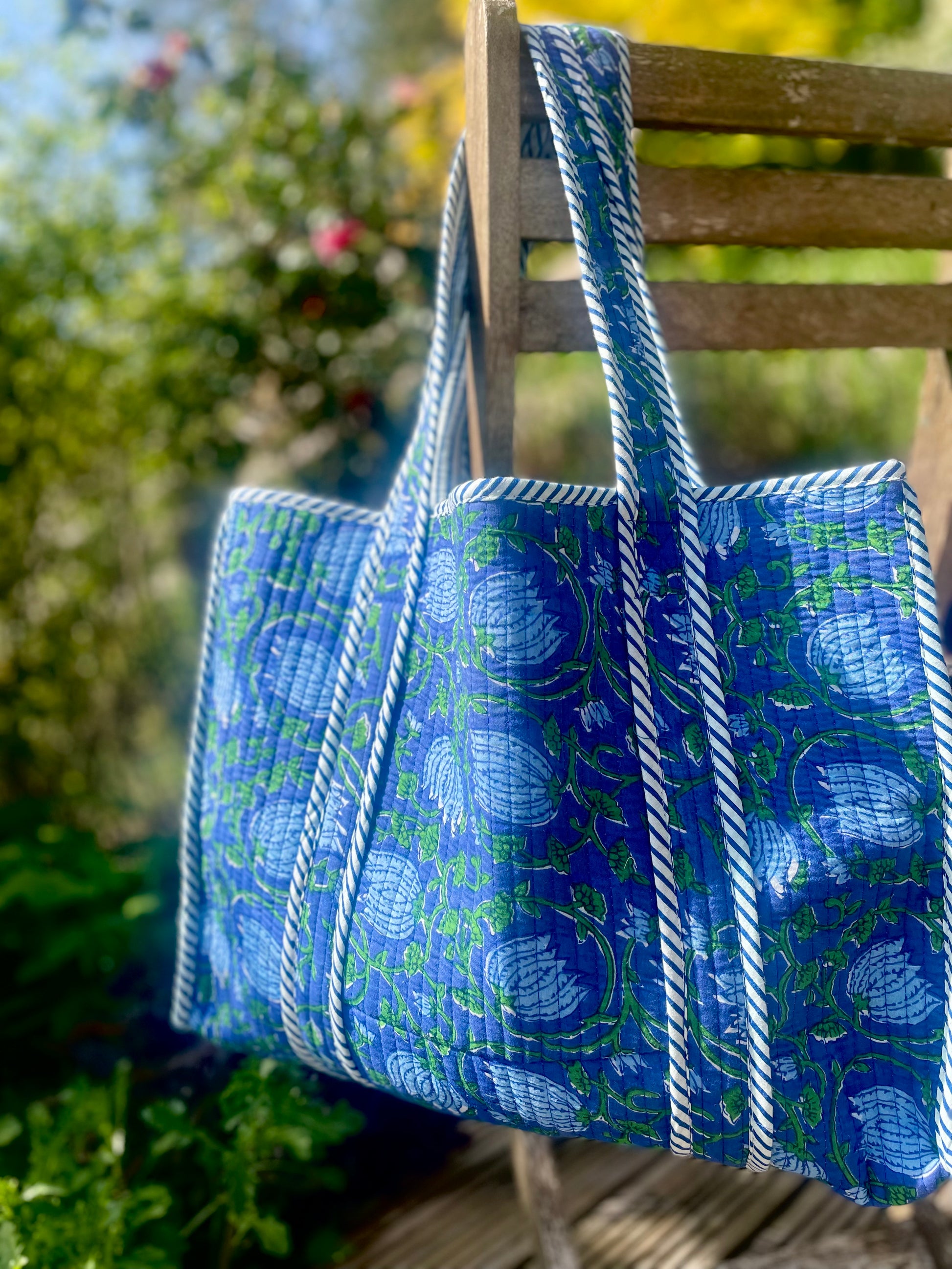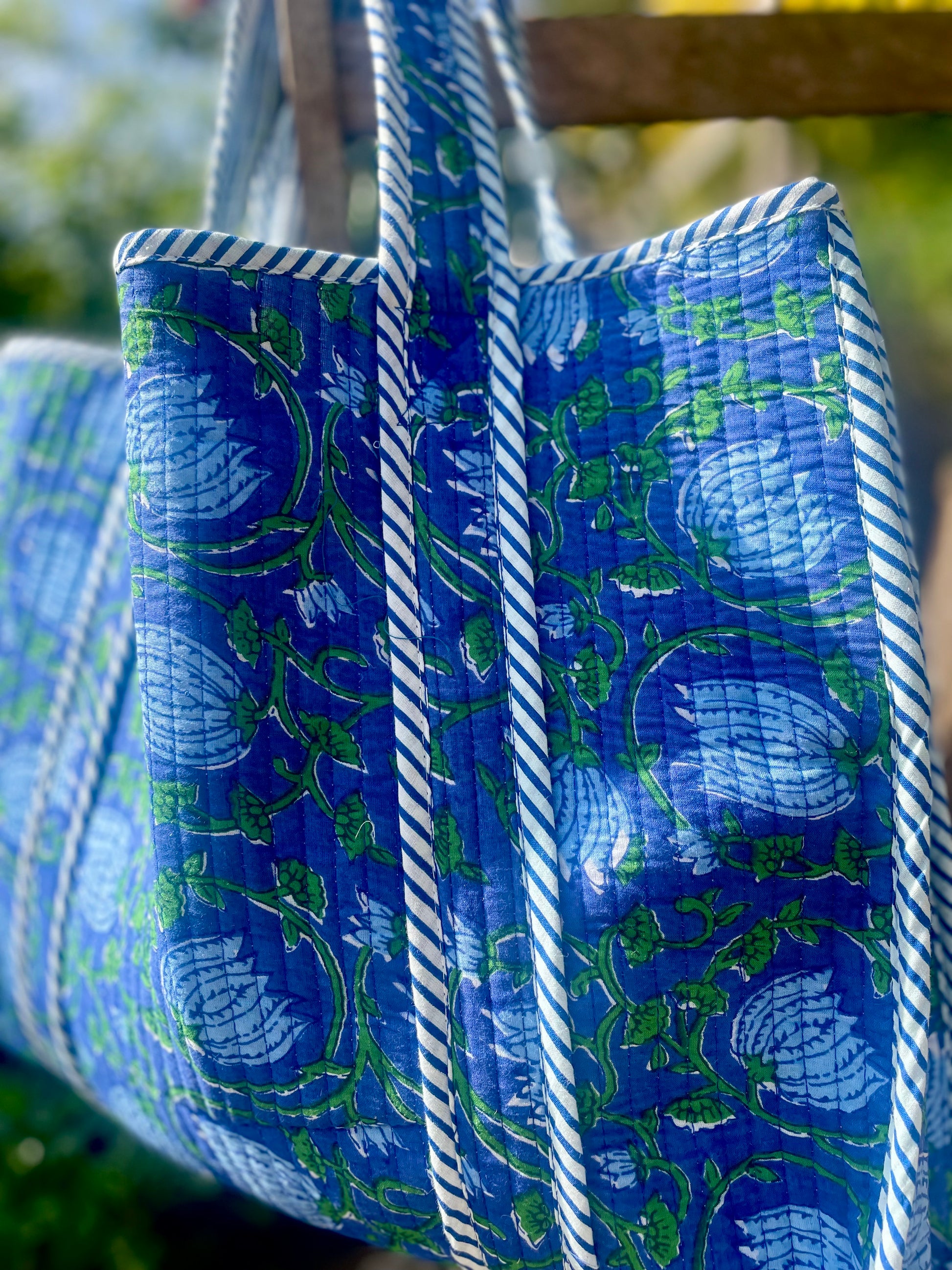 Our beautiful cotton quilted tote bags are hand made by skilled craftsmen and women in small batches. Quilted for durability but lightweight, spacious and foldable, these totes make a ideal travelling bag, trip to the farmers market, yoga bag or holiday bag for the beach. I personally use it as my gym bag and always get such nice comments.