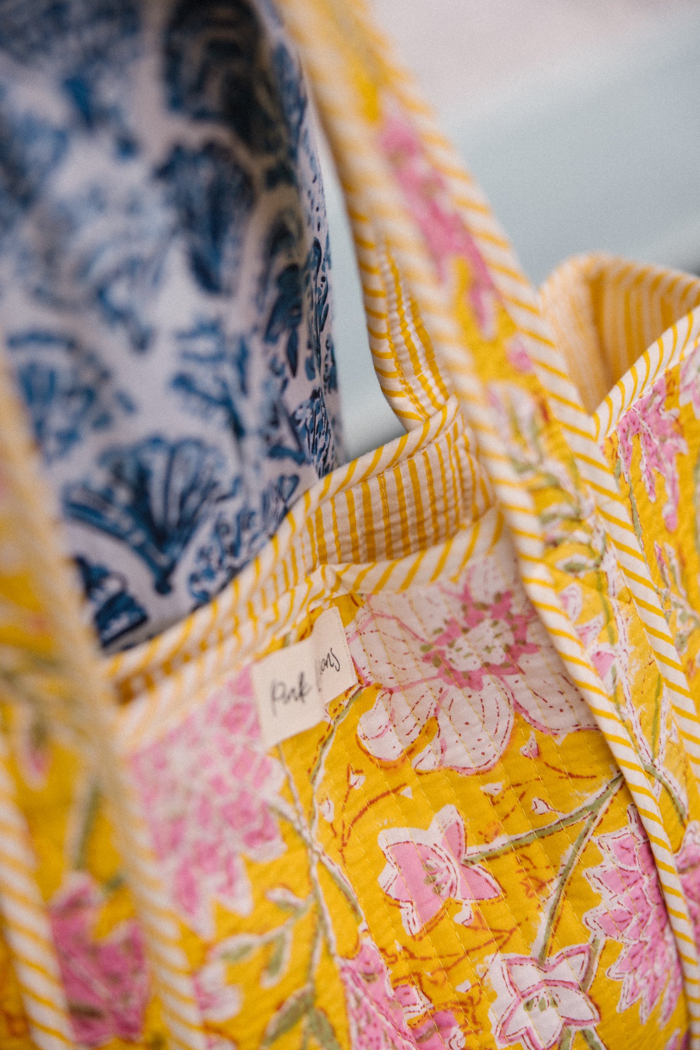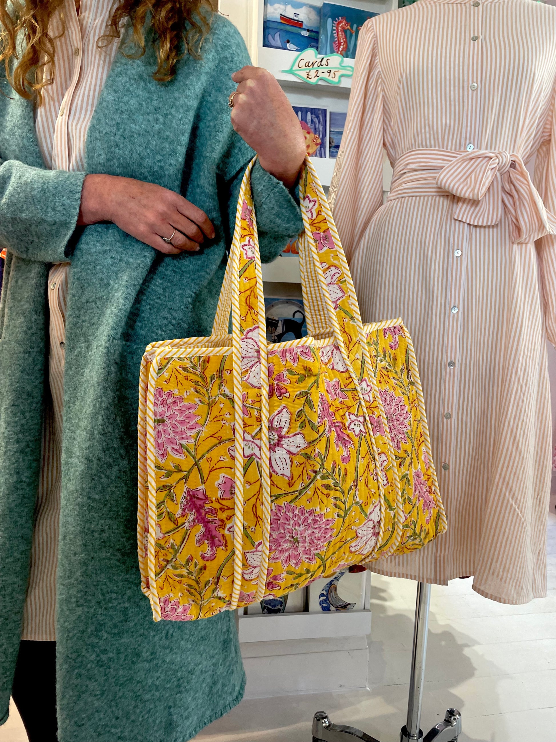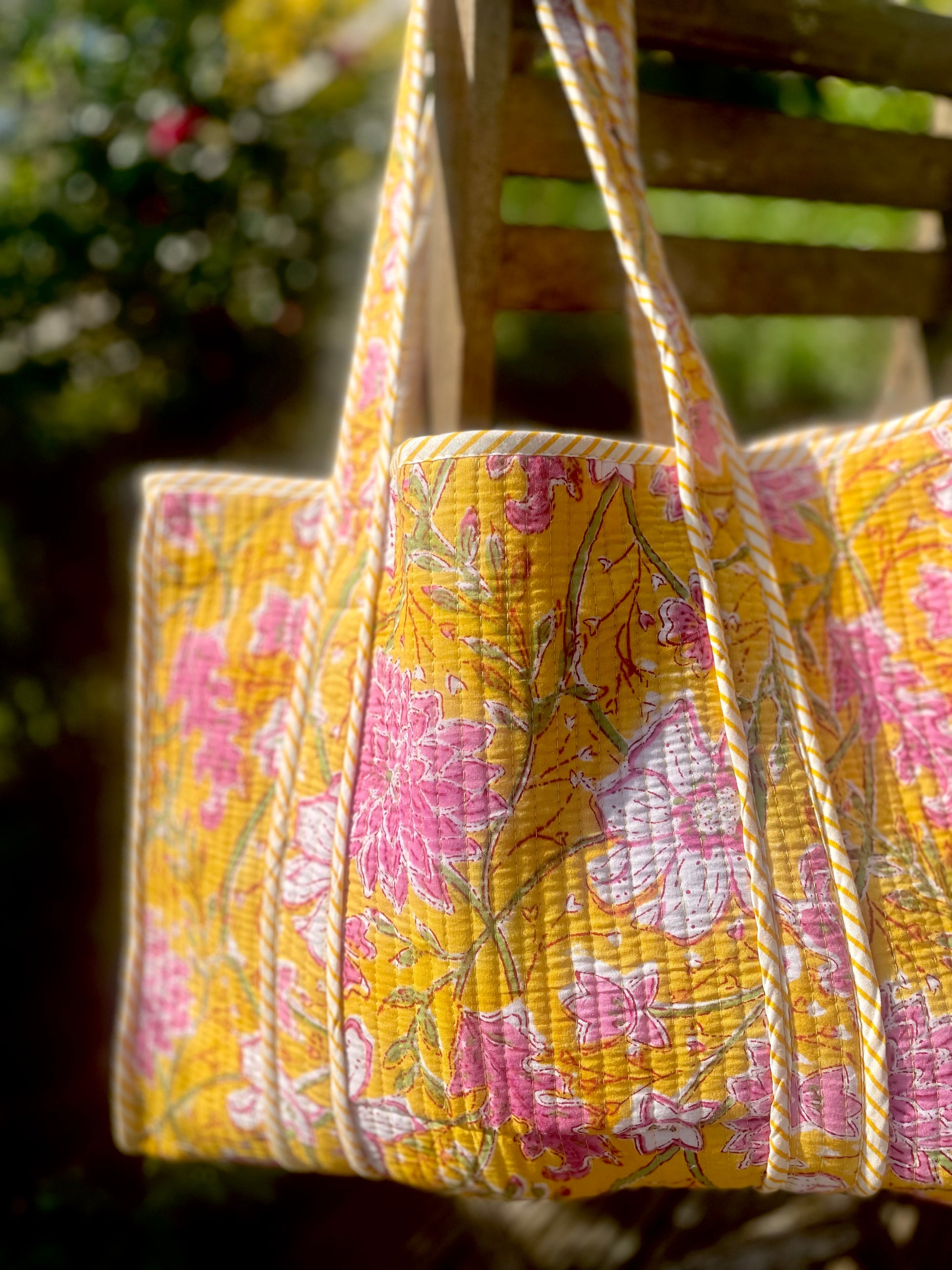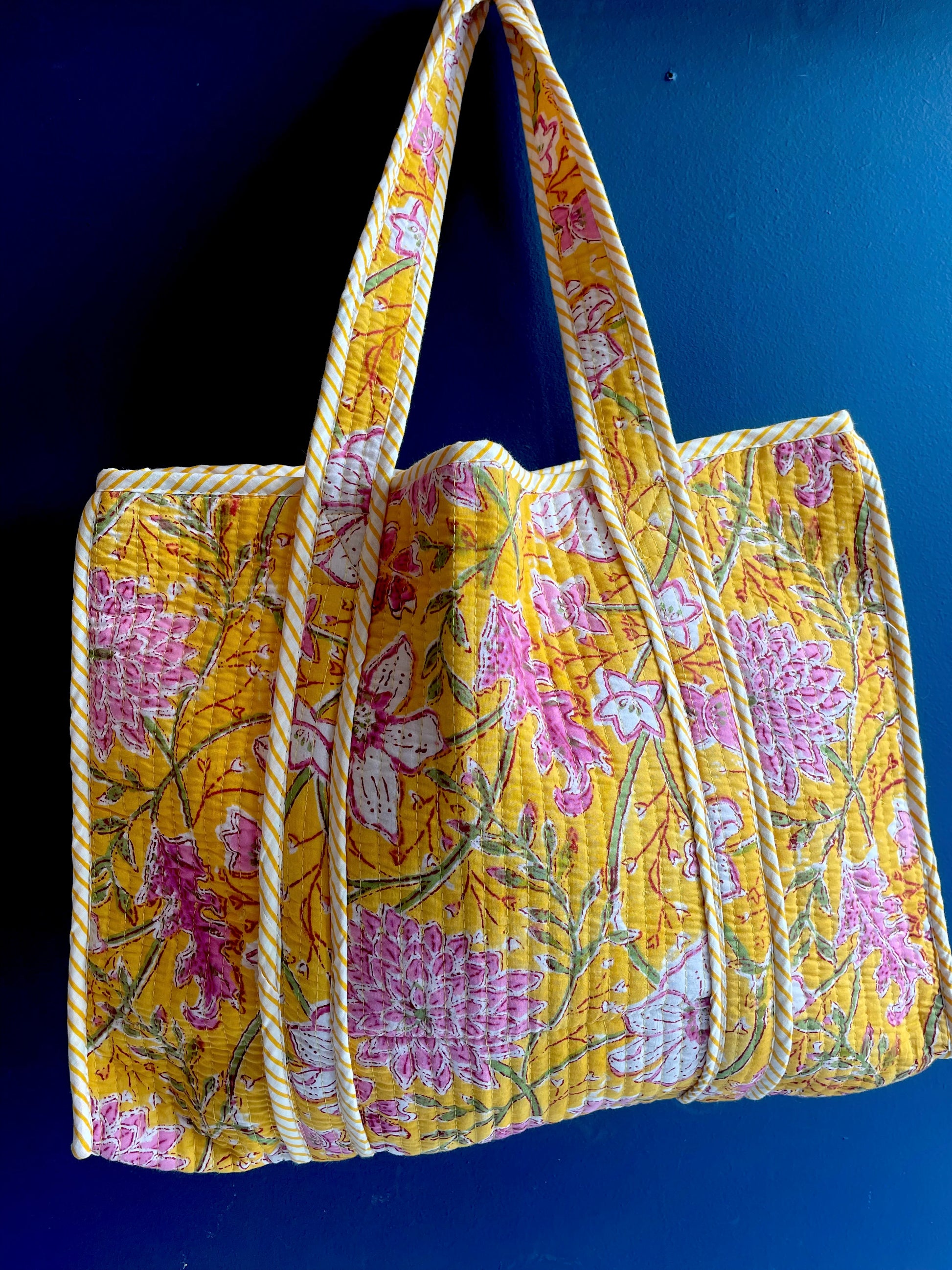 Our beautiful cotton quilted tote bags are hand made by skilled craftsmen and women in small batches. Quilted for durability but lightweight, spacious and foldable, these totes make a ideal travelling bag, trip to the farmers market, yoga bag or holiday bag for the beach. I personally use it as my gym bag and always get such nice comments.