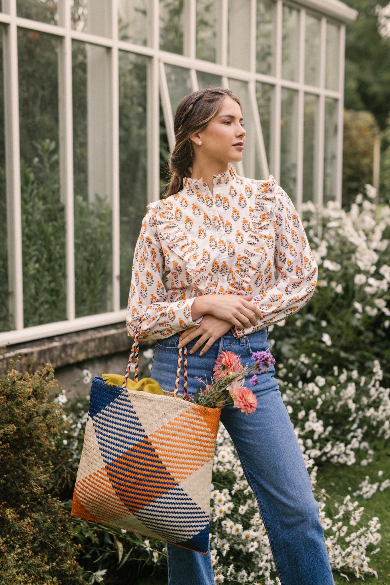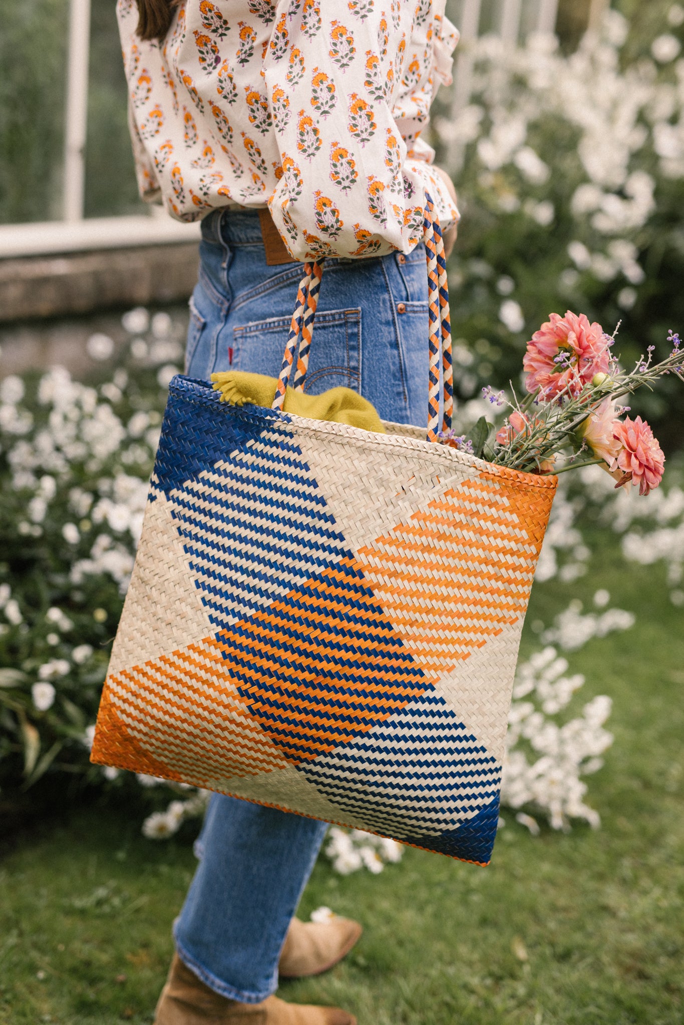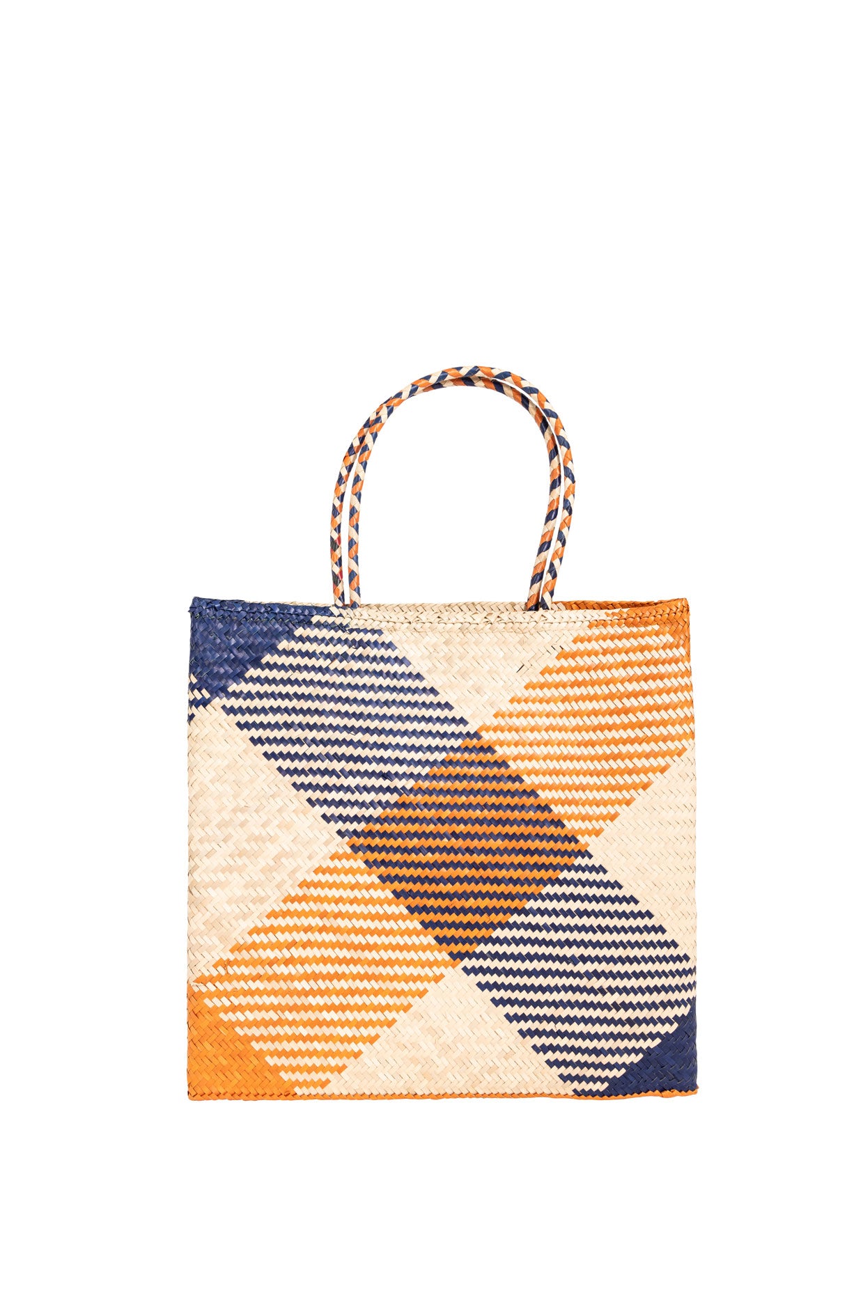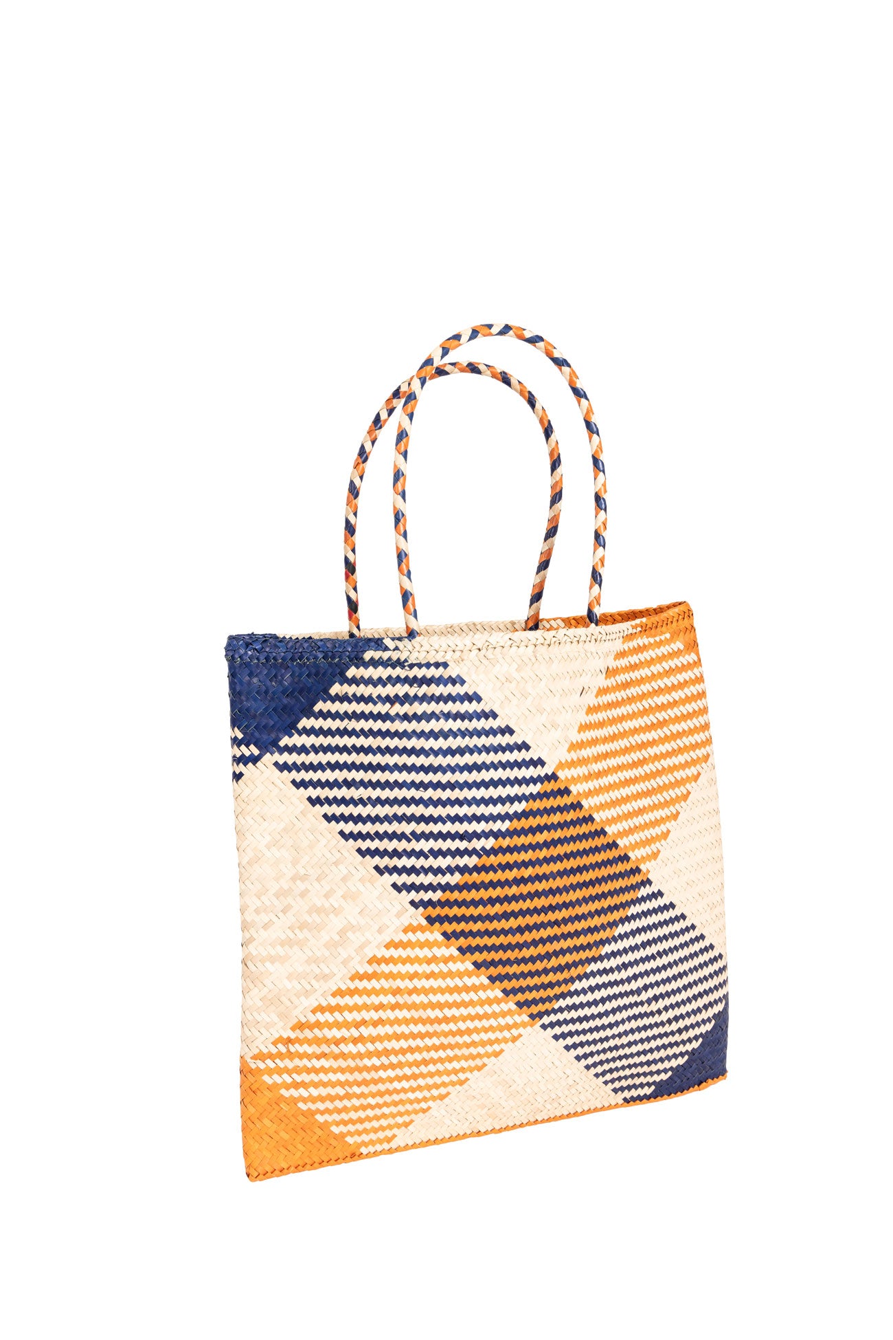 This basket bag is destined for dreamy summer days. Hand-crafted from woven raffia, this small style is worked to a squared flat shape, making her the ideal holiday basket to pack . She has navy and orange diagonal stripes hand woven into the basket .She makes the perfect shopper for strolling around town and equally good taken to the beach .